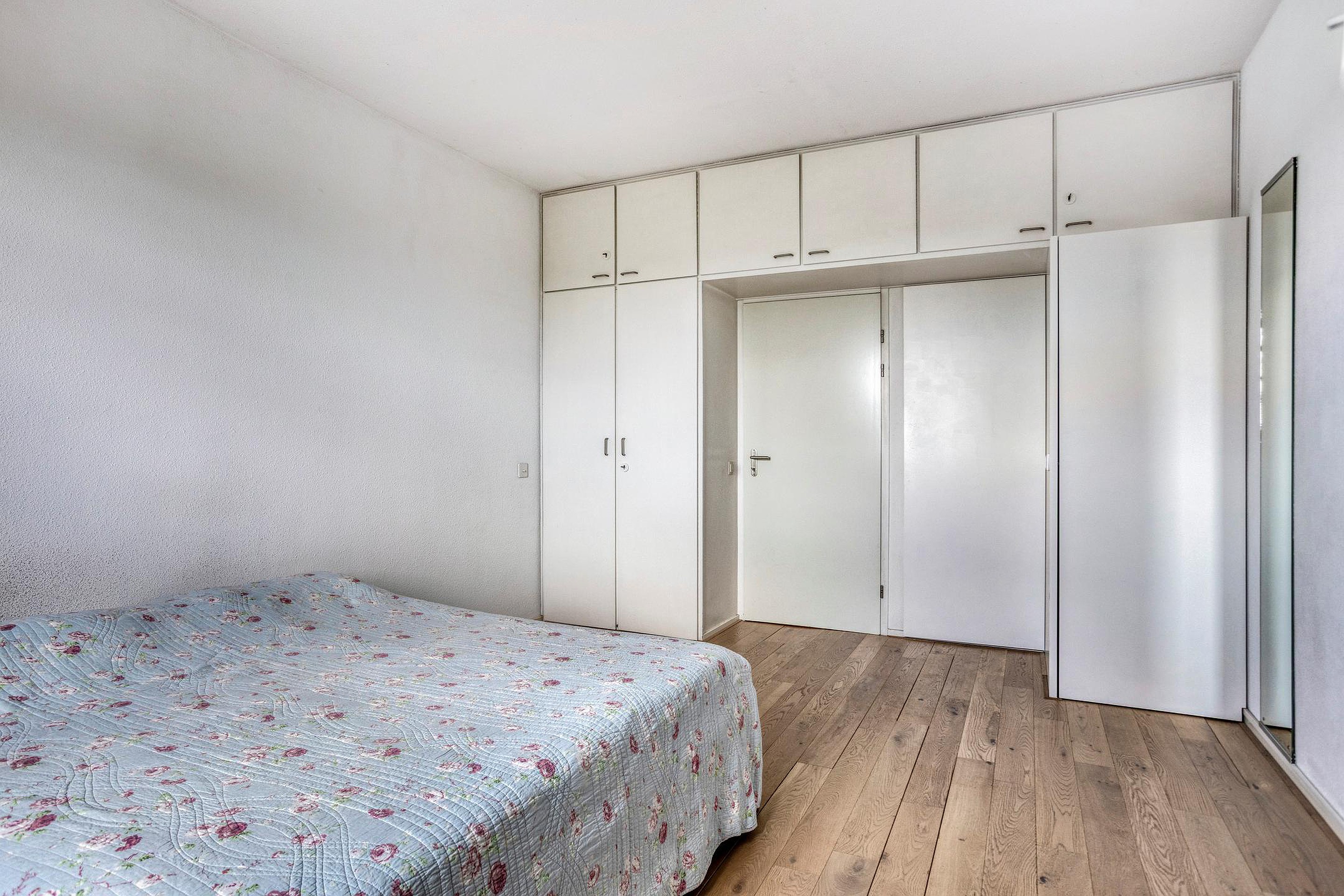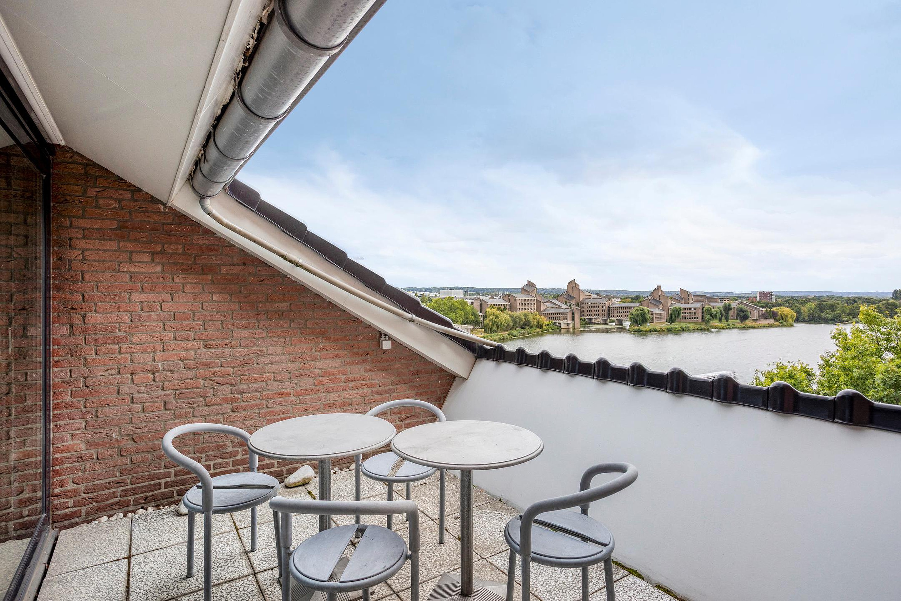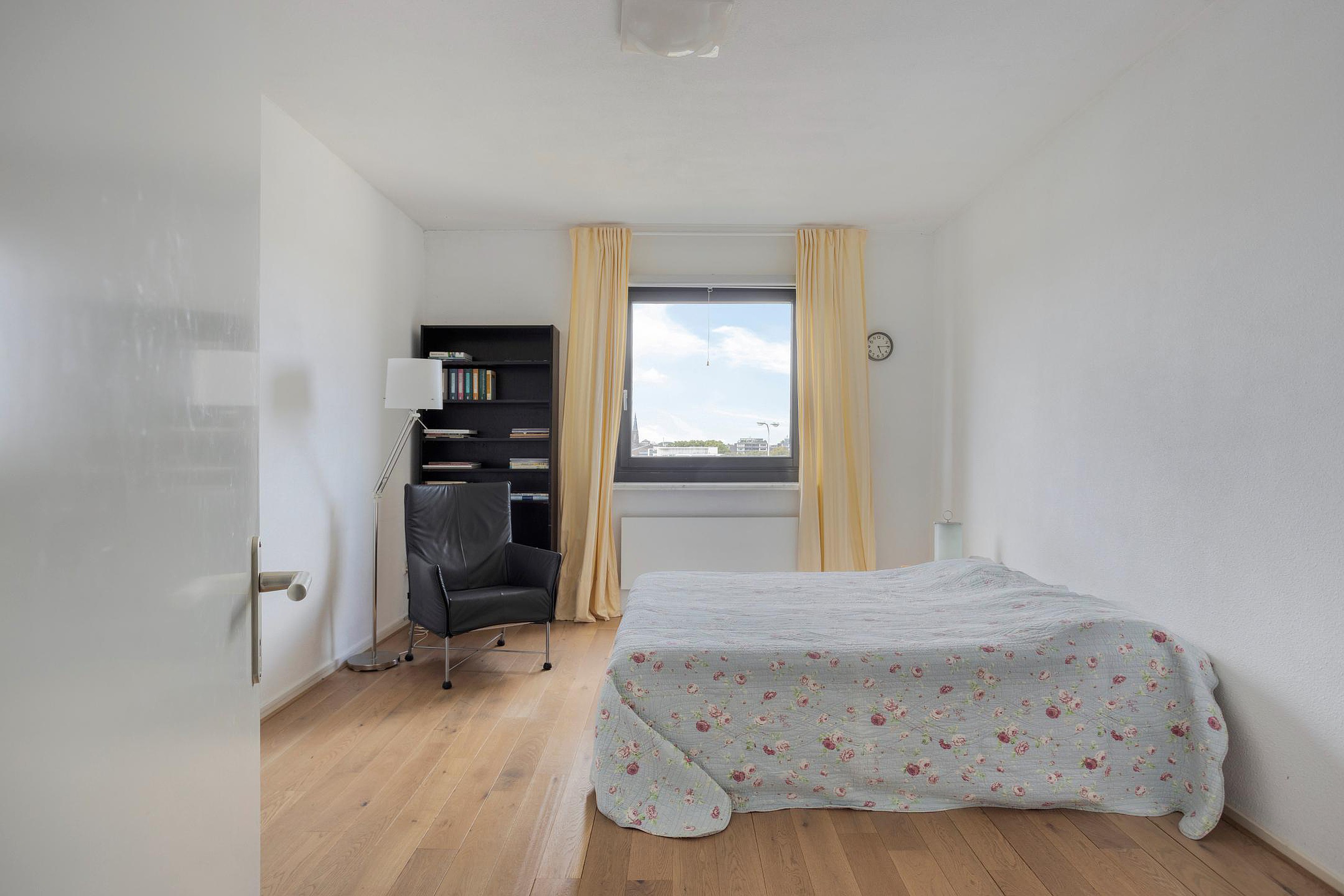 De royale slaapkamer (17m2) biedt eveneens een prachtig uitzicht over de Maas en het historische stadscentrum van Maastricht. De kamer is voorzien van een parketvloer en beschikt over een ruime inbouwkast, wat zorgt voor voldoende opbergruimte zonder verlies van woonoppervlak. Hier zijn ook de aansluitingen voor de wasmachine en droger.
