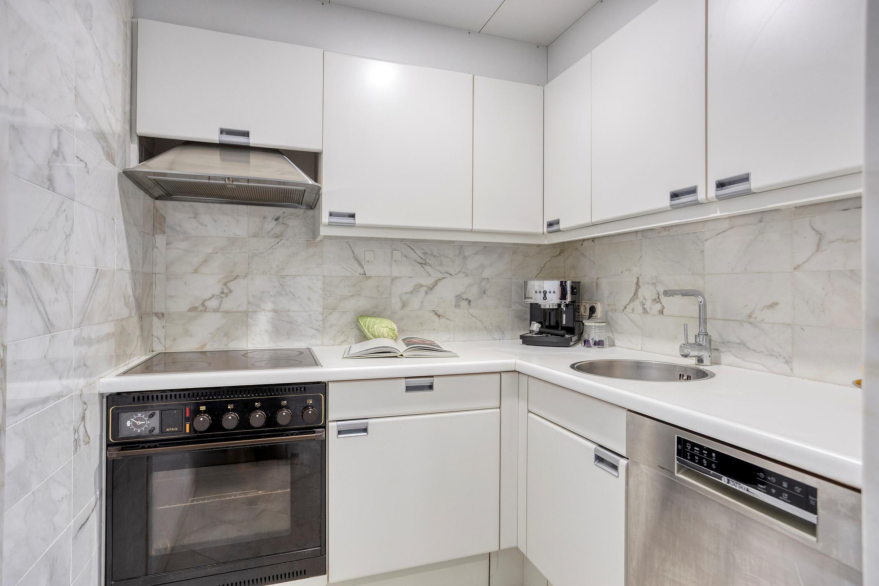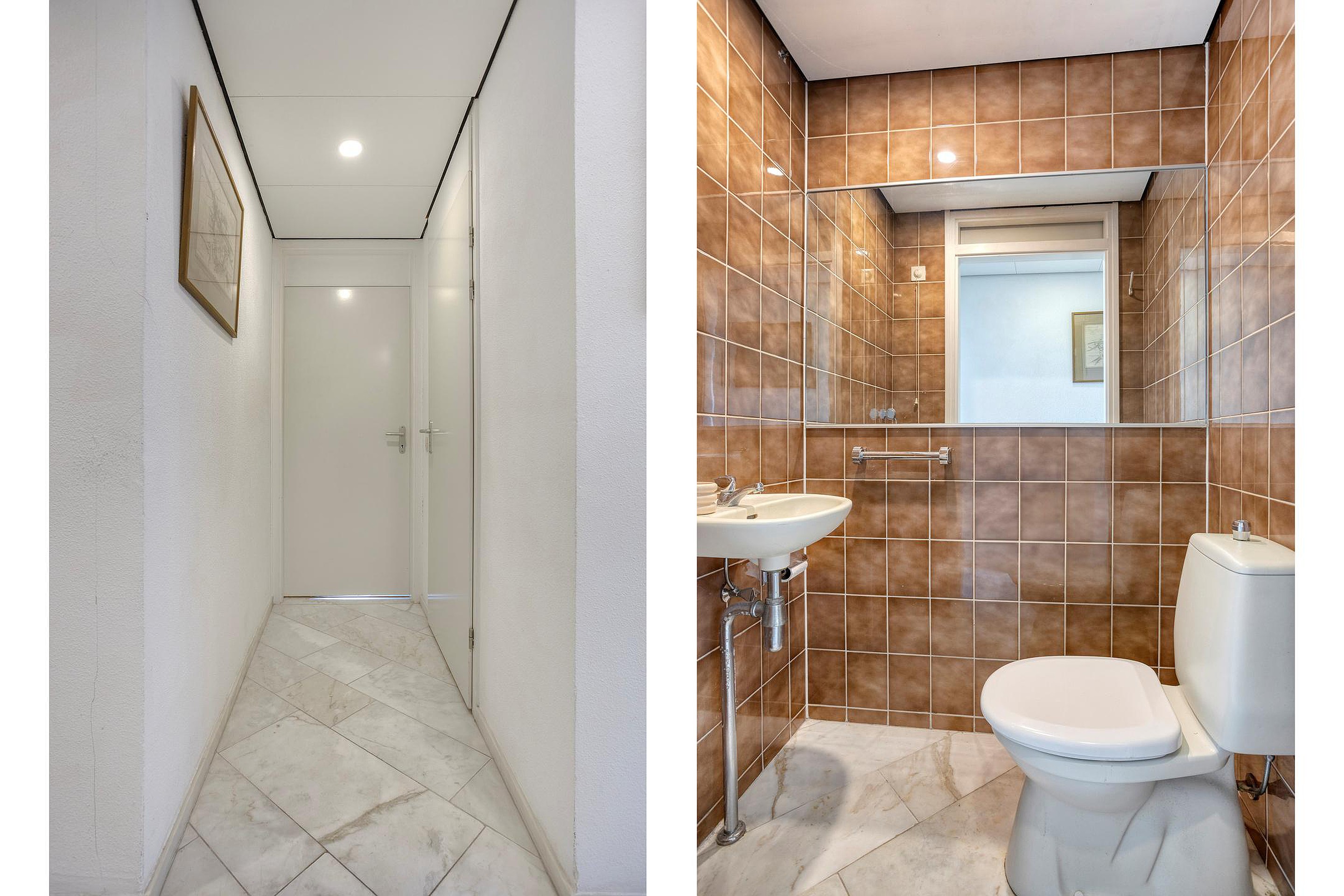 De keuken (7m2) in hoekopstelling met kunststof aanrechtblad is voorzien van de volgende (inbouw)apparatuur, te weten: spoelbak, 4-pits keramische kookplaat met afzuigkap, oven en een vaatwasser. Zowel de keuken als de hal zijn voorzien van een luxe marmeren vloer, wat bijdraagt aan de stijlvolle uitstraling van het appartement. De separate toiletruimte is uitgerust met een staand closet en een fonteintje.