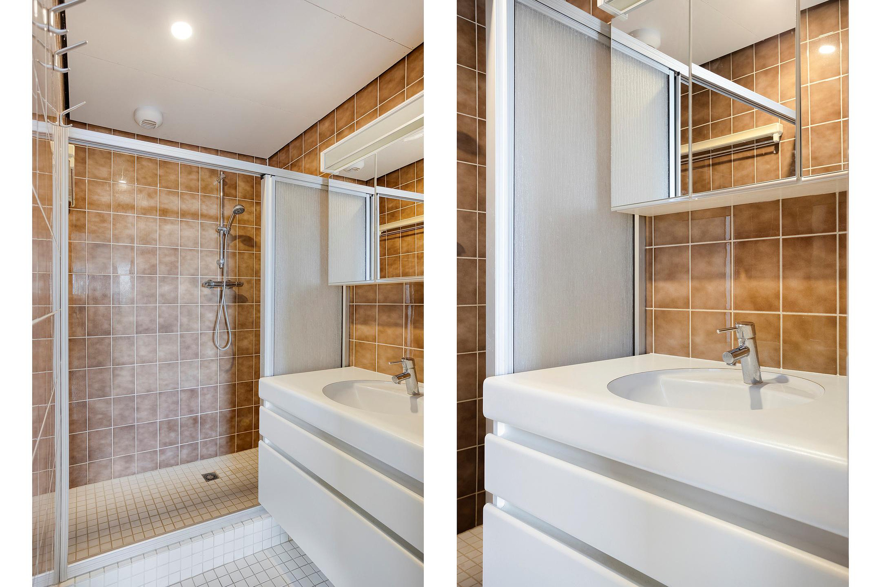 Grenzend aan de slaapkamer bevindt zich de geheel betegelde badkamer (3m2). Deze is uitgerust met een inloopdouche en een vaste wastafel. De mechanische ventilatie is centraal geregeld.