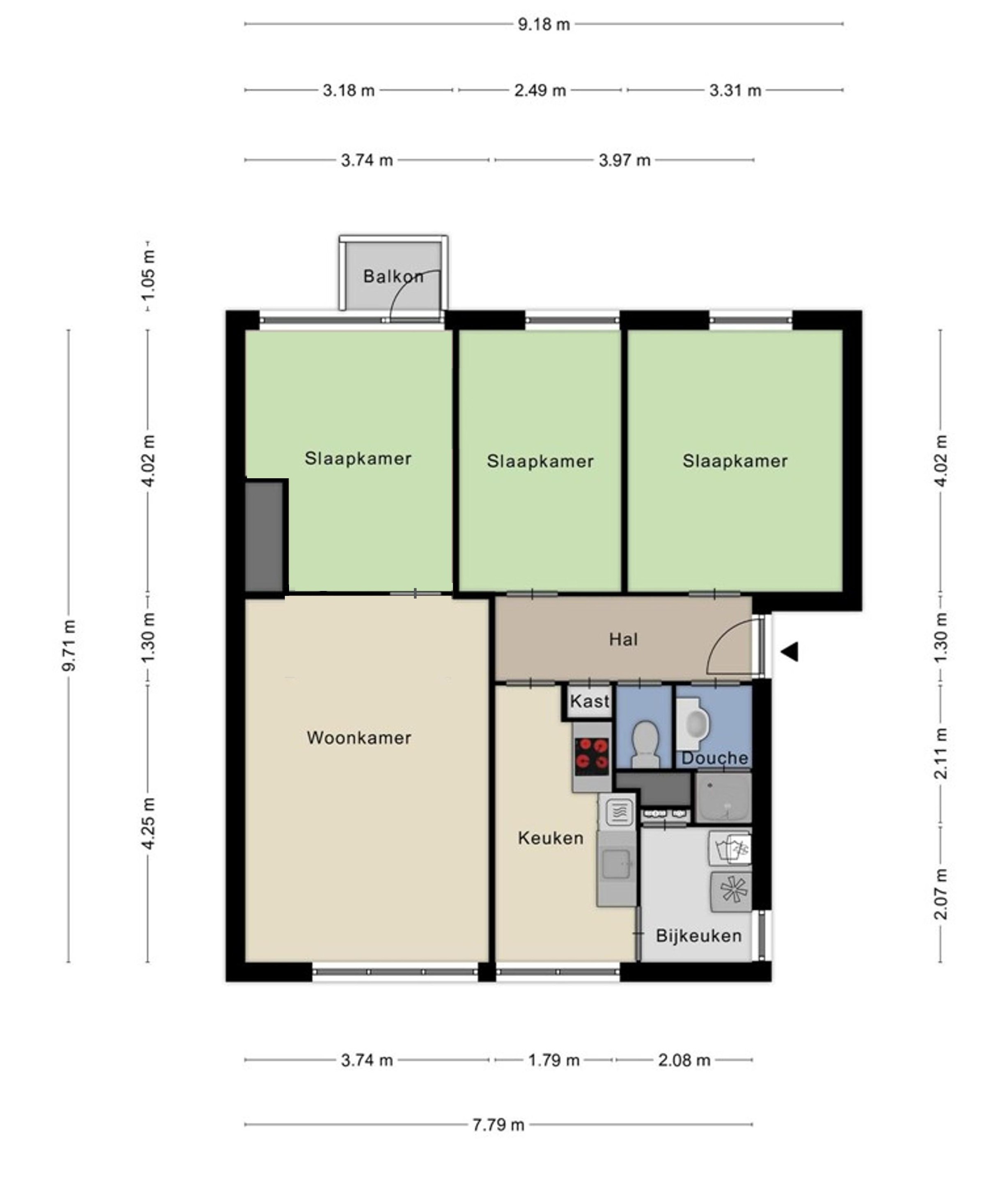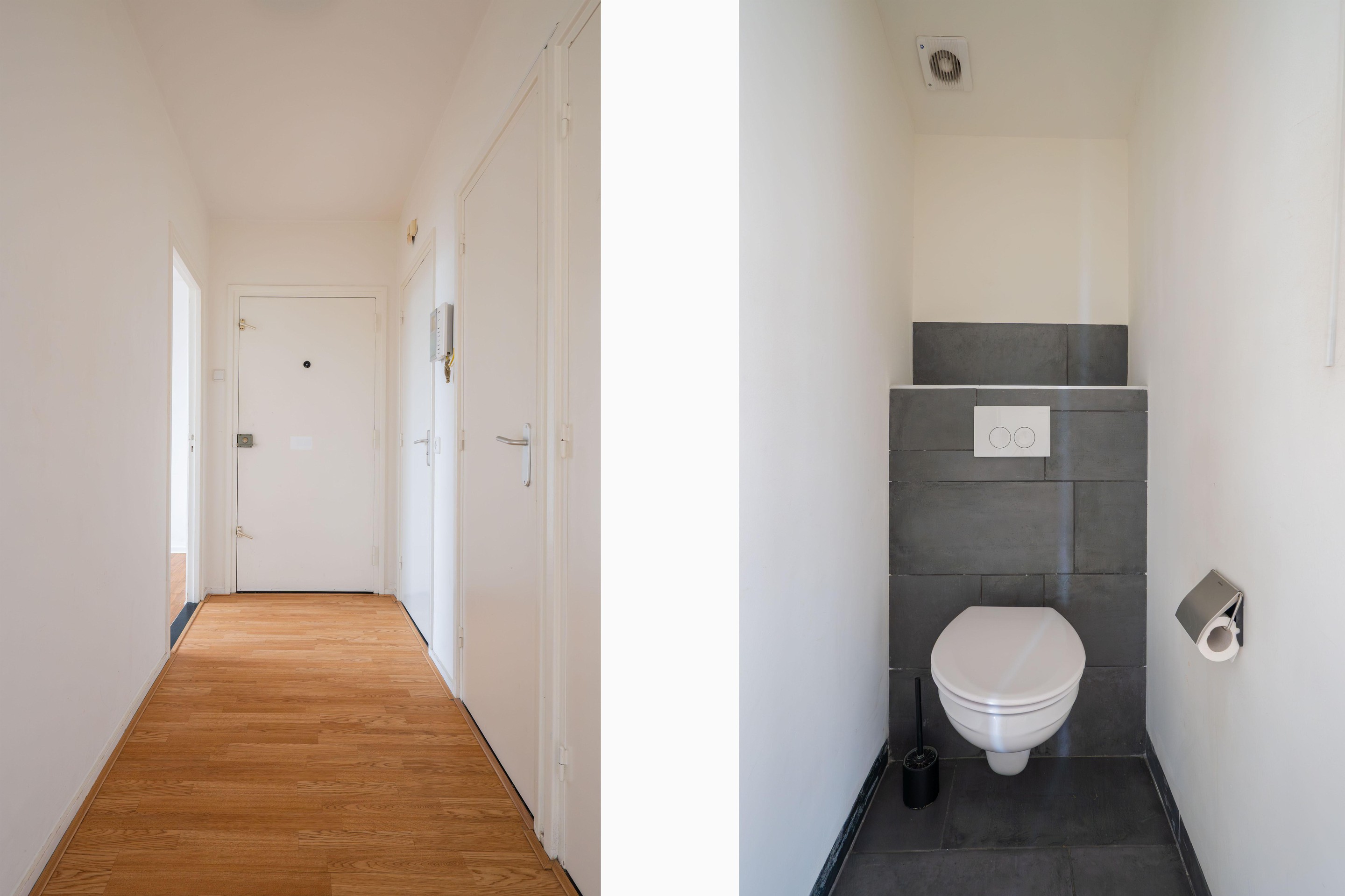 Er zijn drie slaapkamers, waarvan één toegang biedt tot het balkon. De badkamer is compact maar verzorgd, met douche en wastafelmeubel. Het separate toilet is uitgerust met een hangcloset en mechanische afzuiging. In de hal bevindt zich een praktische bergkast. De vloerafwerking bestaat uit kliklaminaat in de woonkamer en slaapkamer 3, vinyl in de overige slaapkamers en tegels in de keuken. Het appartement maakt gebruik van een gemeenschappelijke verwarmingsinstallatie en is volledig elektrisch qua koken en warm water. Het appartement zelf gebruikt dan ook geen gas. In de entree is een intercom aanwezig.