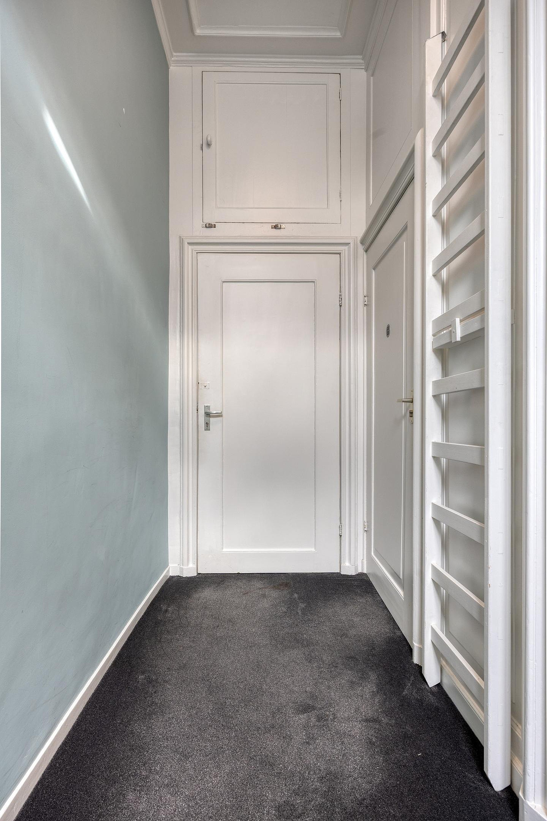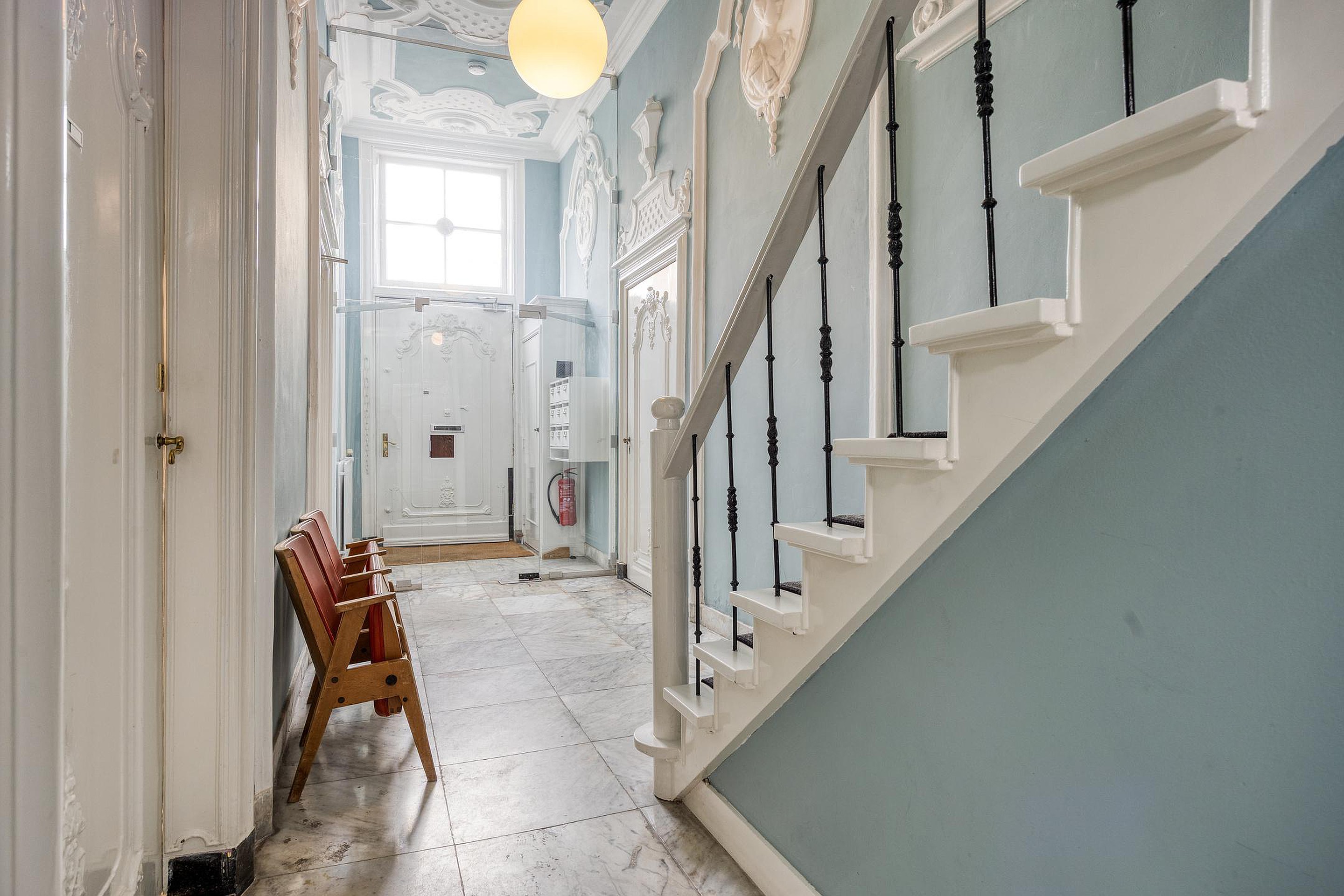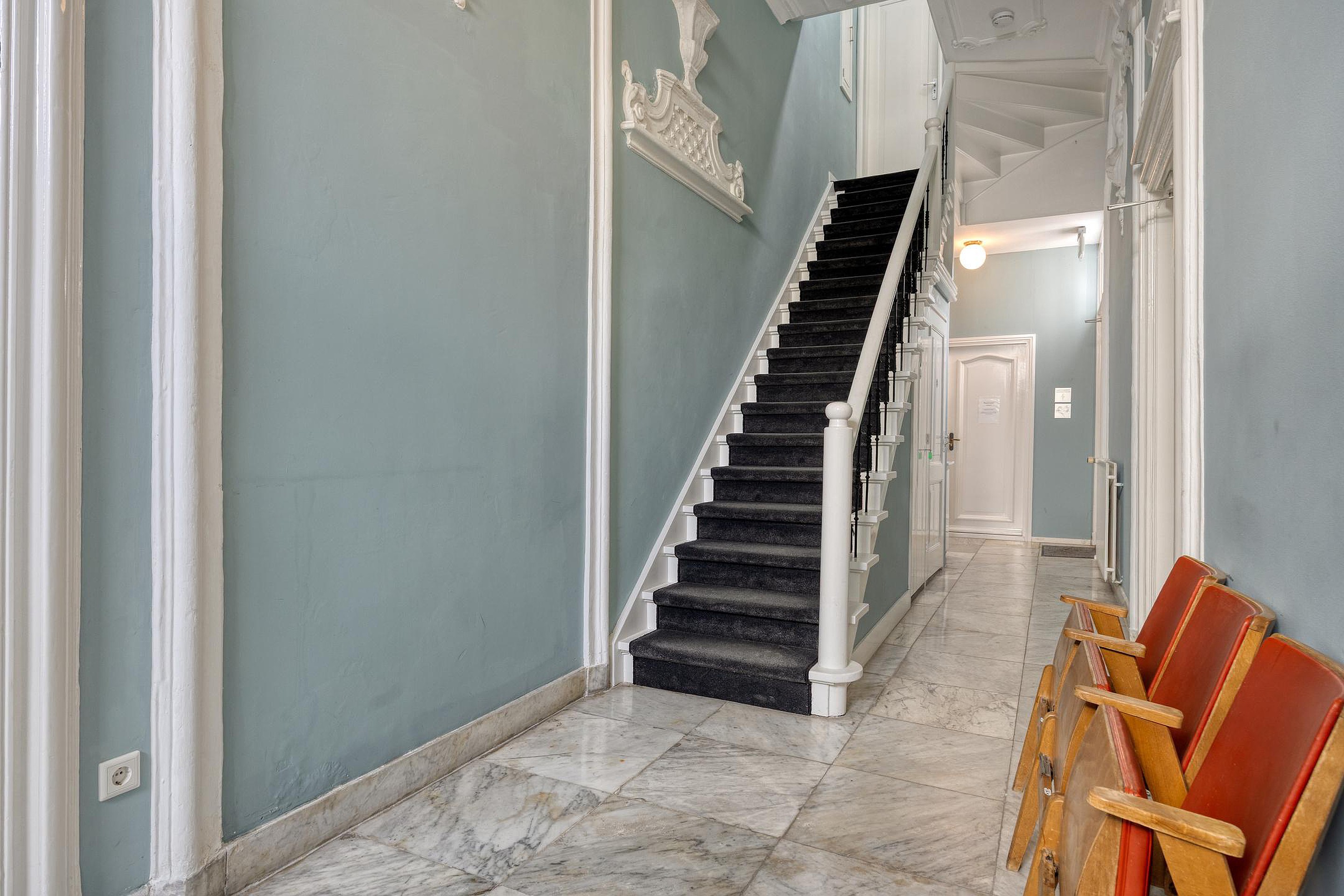 Gezamenlijke entree op de begane grond, voorportaal met brievenbussen, door de hoge glazen deur kom je in de hal met de statige trap, hoge plafonds met schitterende ornamenten. Op de eerste verdieping bevindt zich de voordeur van het appartement. Wat er achter deze deur schuilgaat moet je echt zelf ‘voelen’, een verrassend leuke ruimte.