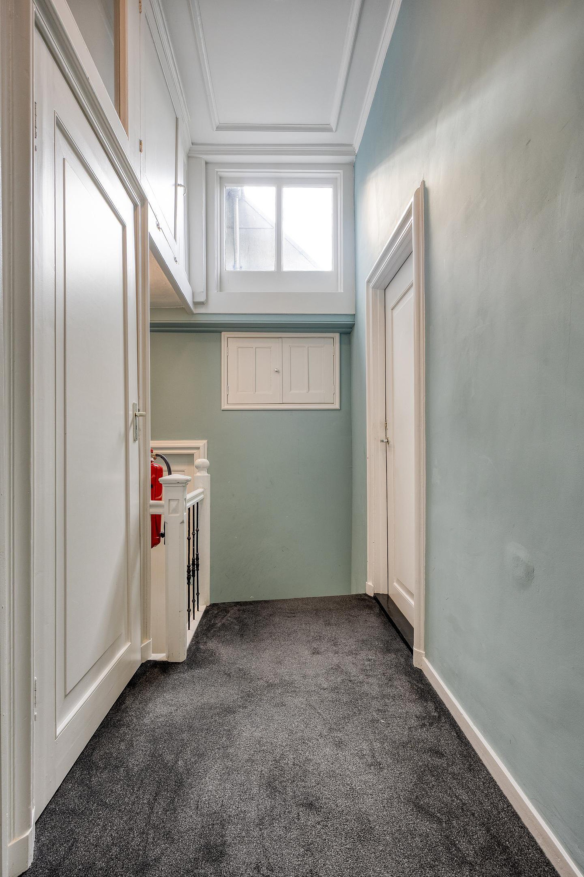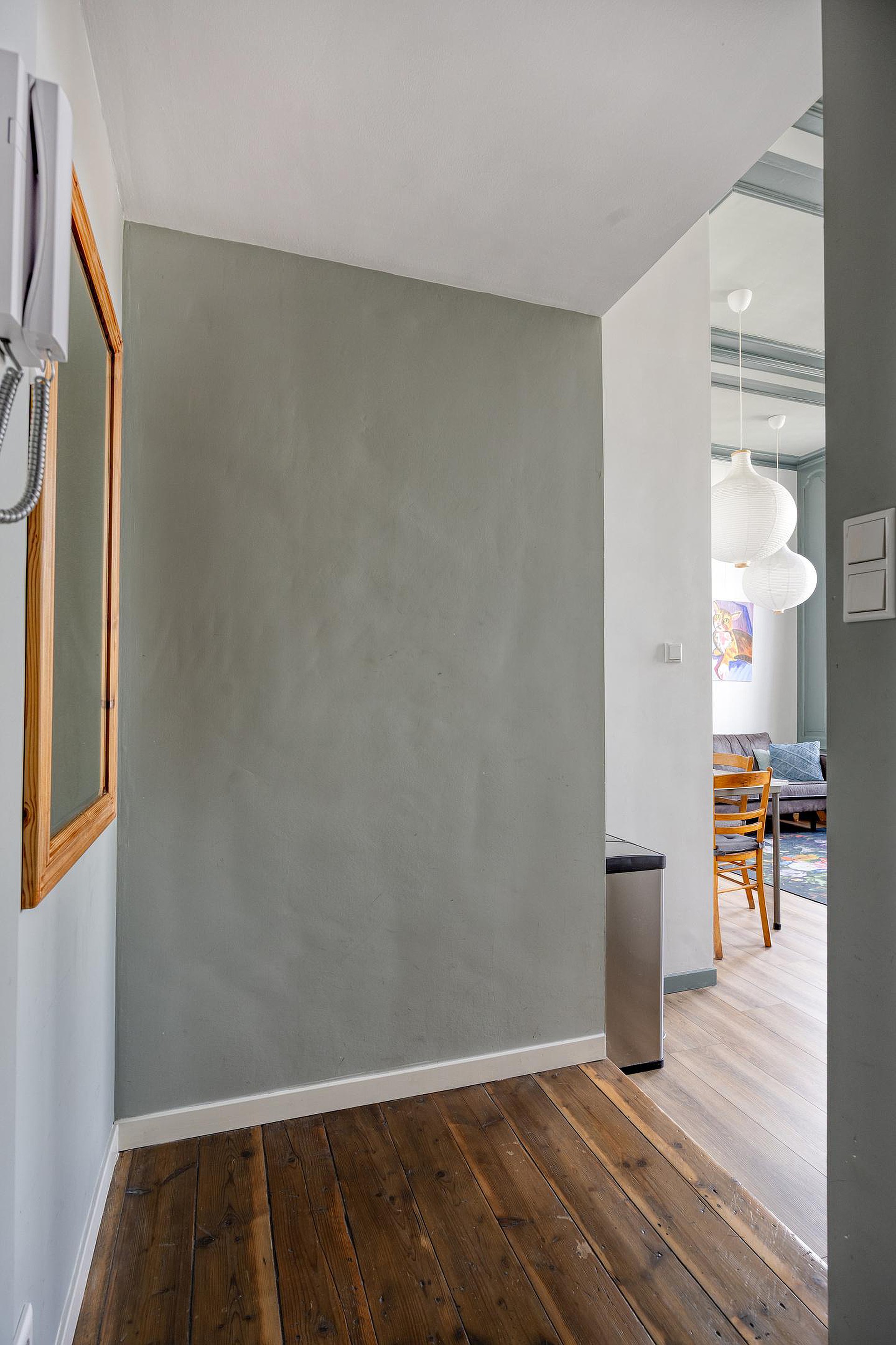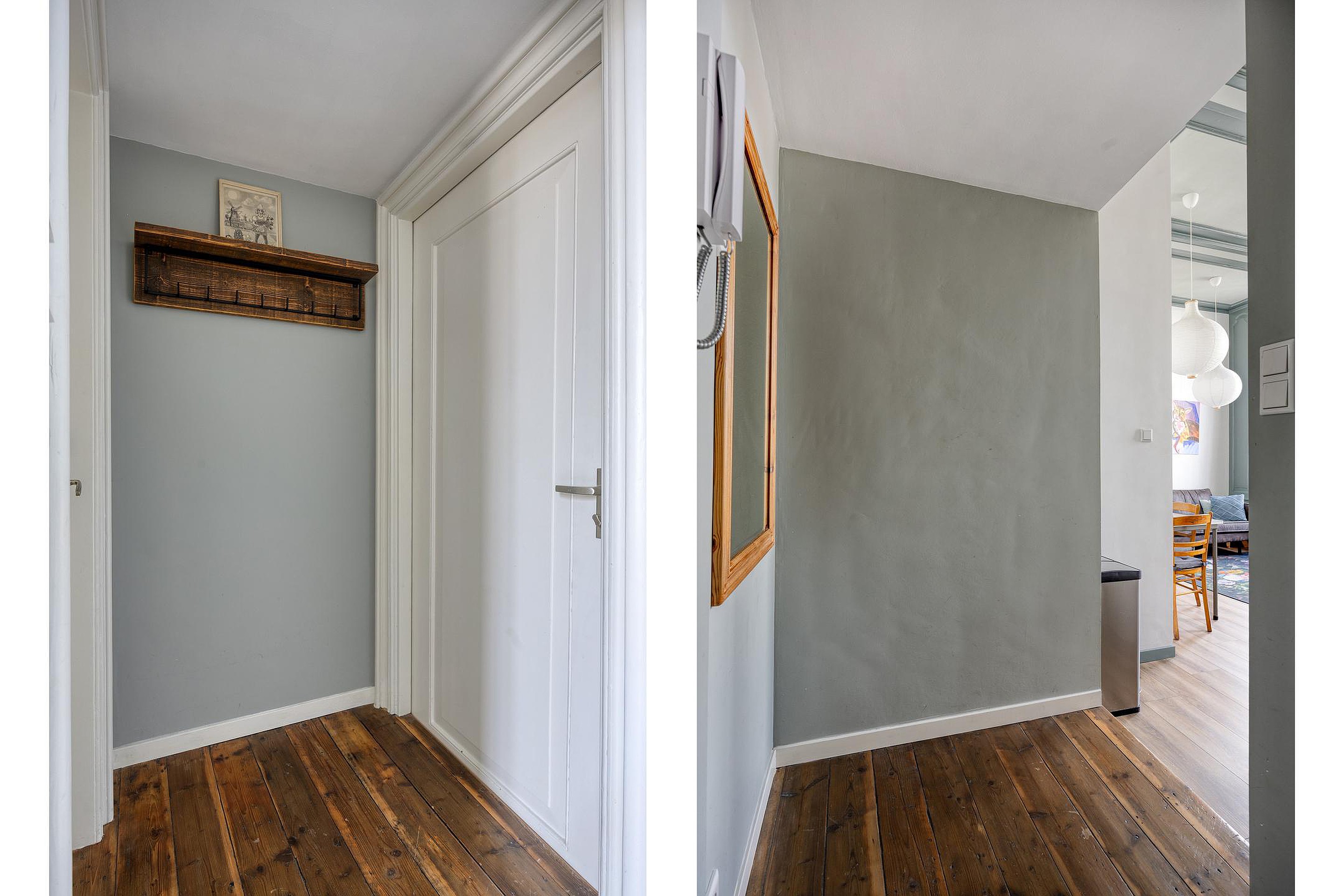 Gezamenlijke entree op de begane grond, voorportaal met brievenbussen, door de hoge glazen deur kom je in de hal met de statige trap, hoge plafonds met schitterende ornamenten. Op de eerste verdieping bevindt zich de voordeur van het appartement. Wat er achter deze deur schuilgaat moet je echt zelf ‘voelen’, een verrassend leuke ruimte.