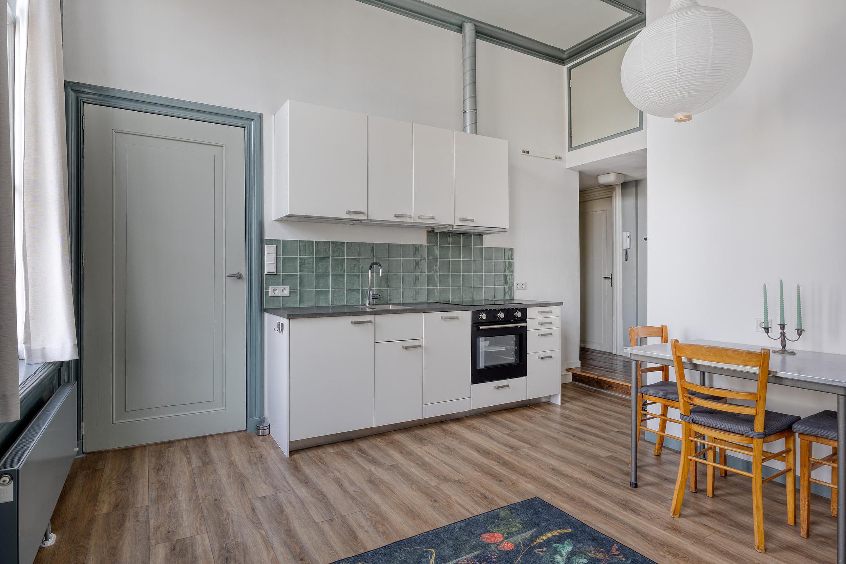 Een leuke ruimte met de open keuken die voorzien is van een inductie kookplaat, afzuigkap, koelkast met vriesvak en een nieuwe oven.