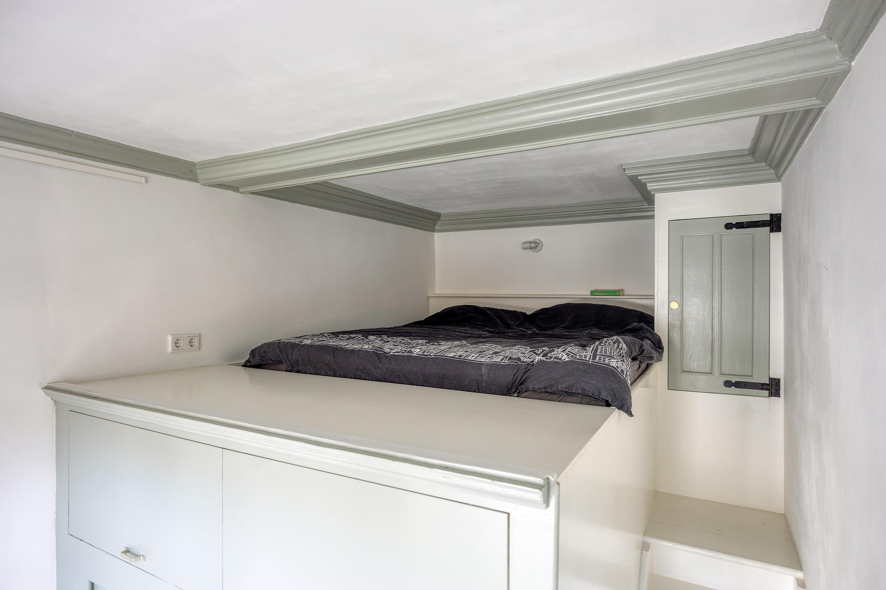 De af te sluiten slaapkamer heeft een ruime inbouwkastenwand en ruimte voor het plaatsen van een bureau, zodat je hier bijvoorbeeld heel goed een werkplek kunt creëren. Het bed is te bereiken via een trapje, met nog een extra vast kast.