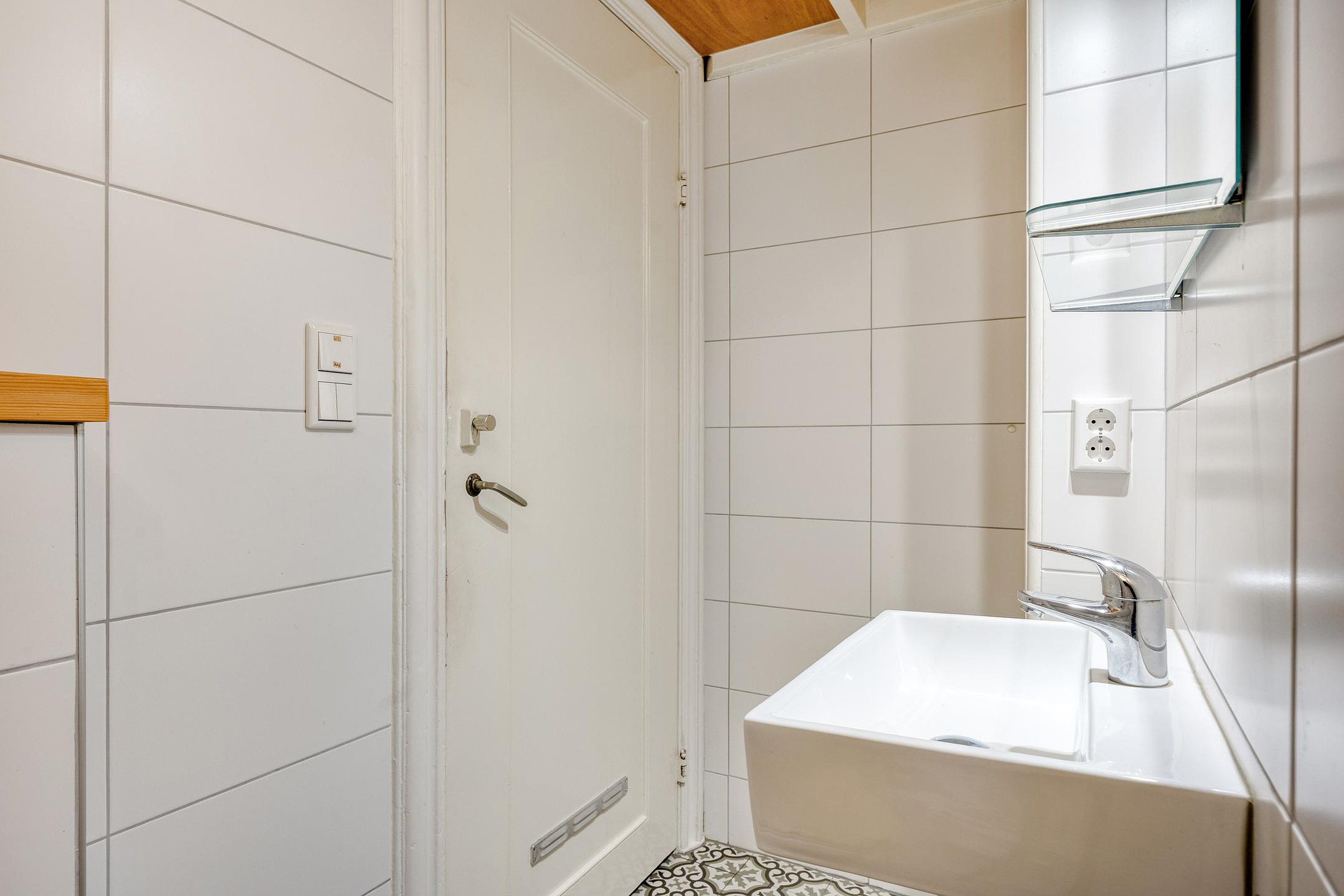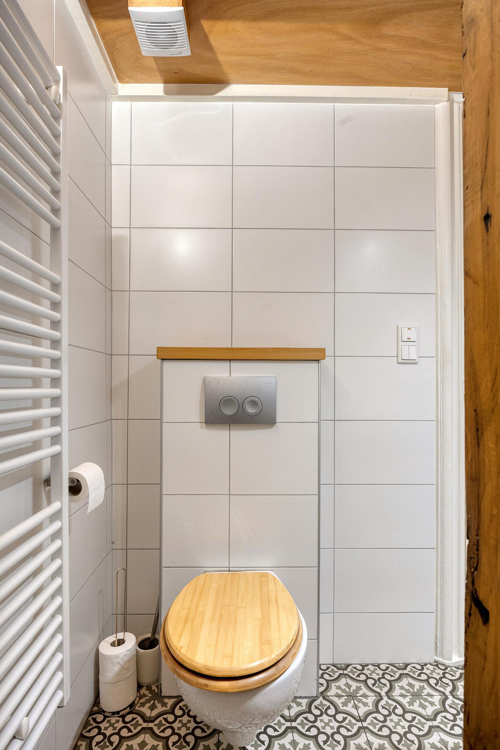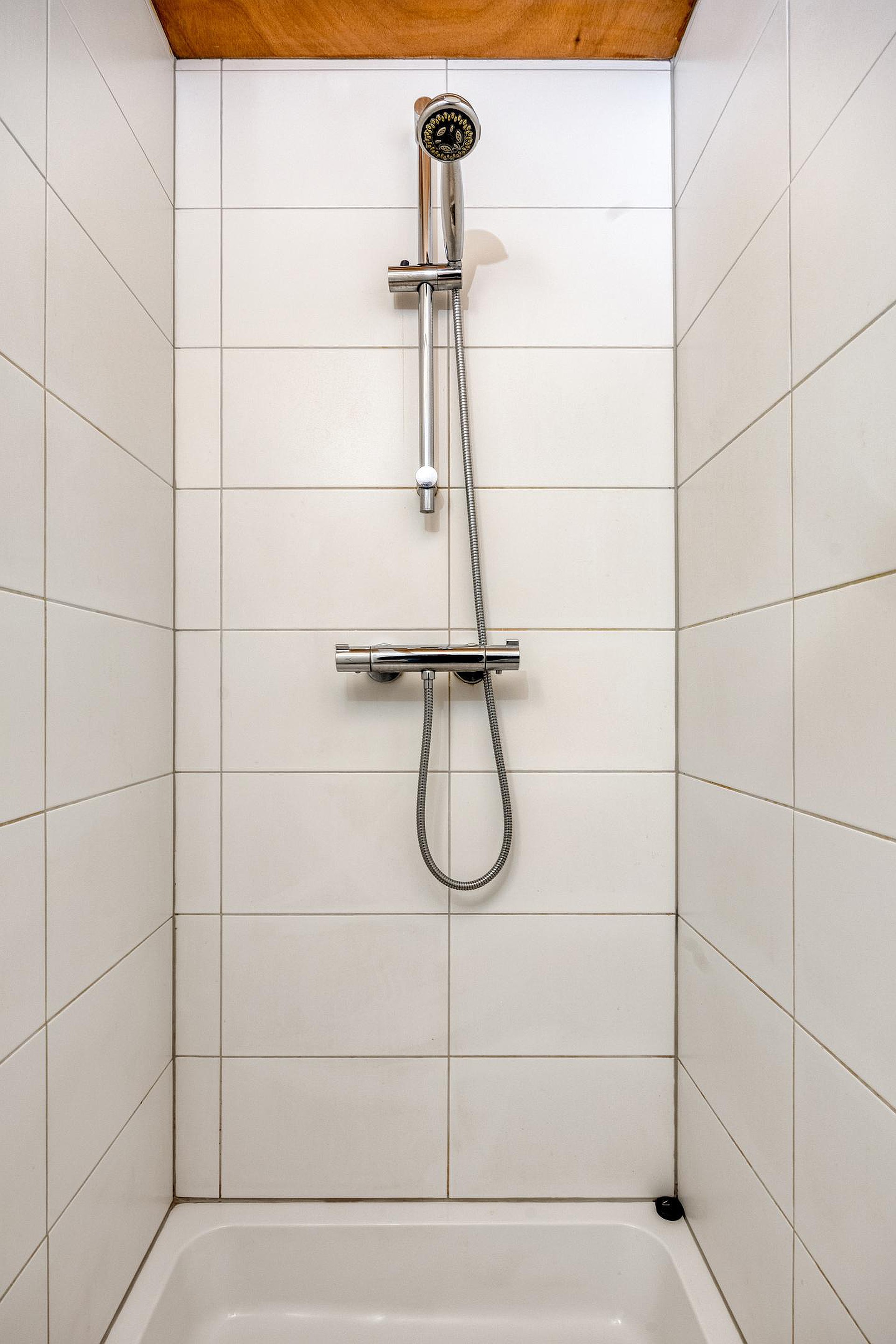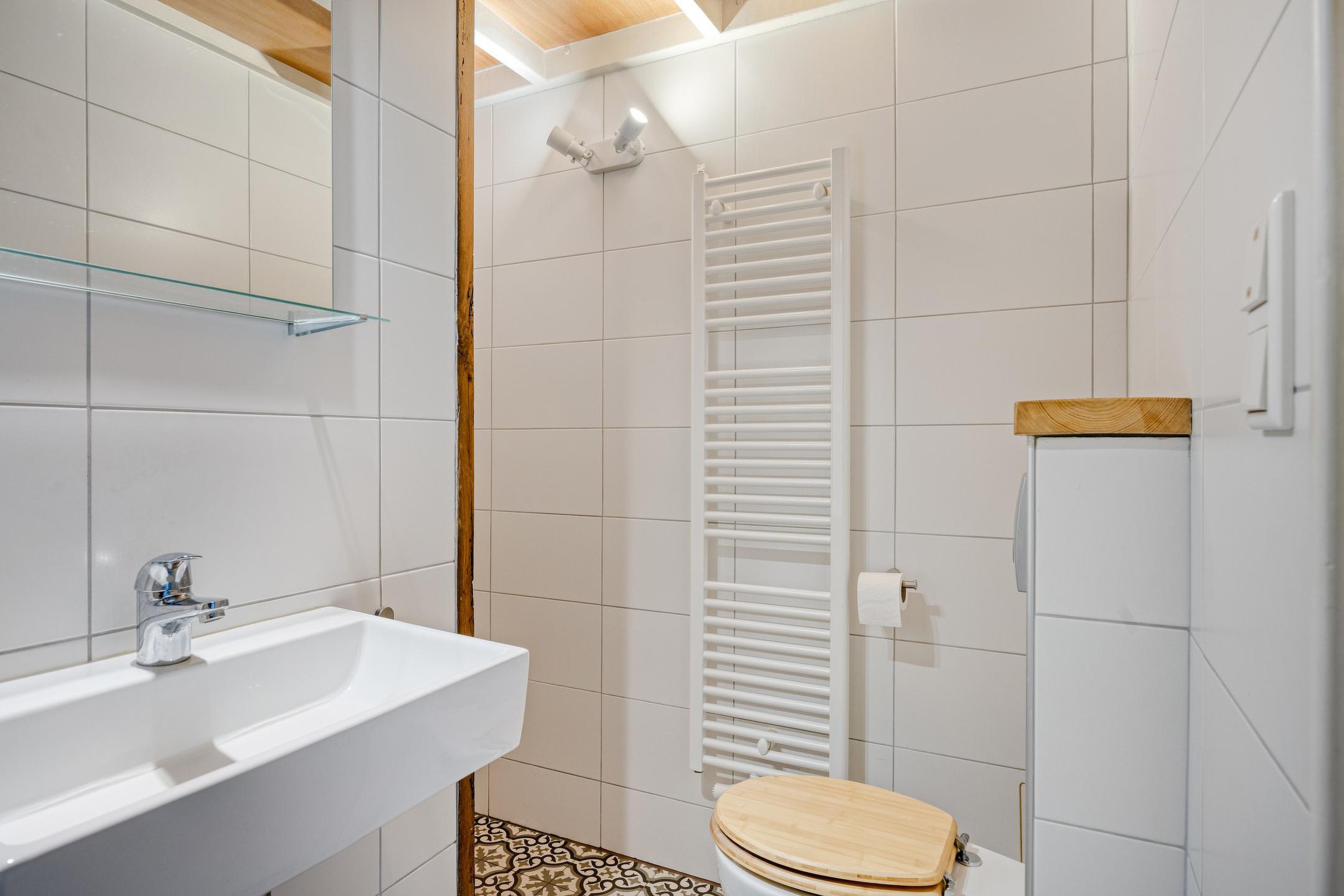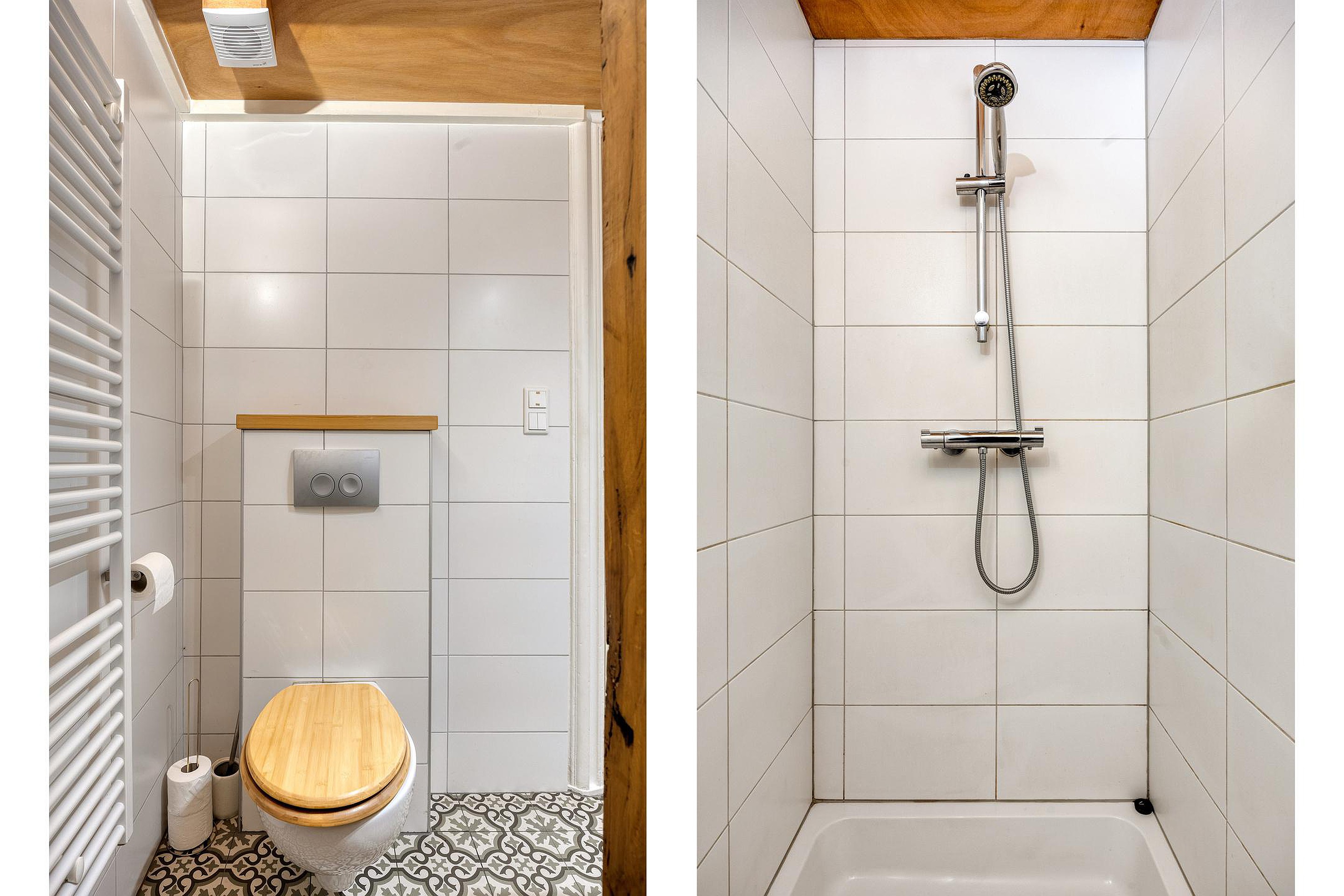 De badkamer is voorzien van een ruime inloopdouche, wastafel en een toilet. Ook hier is weer gedacht aan extra bergruimte, een vaste diepe kast, handig voor toiletspullen en handdoeken.