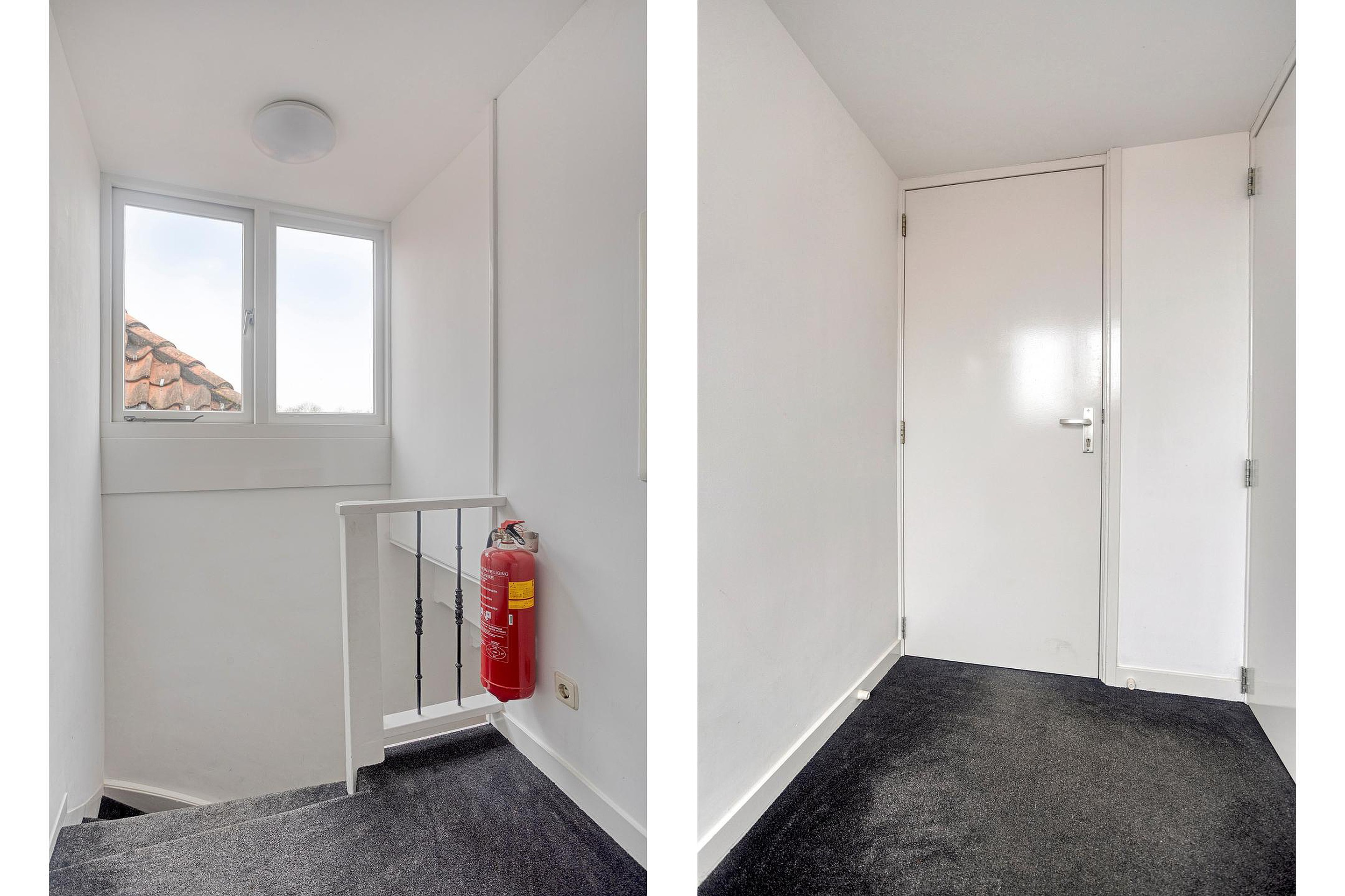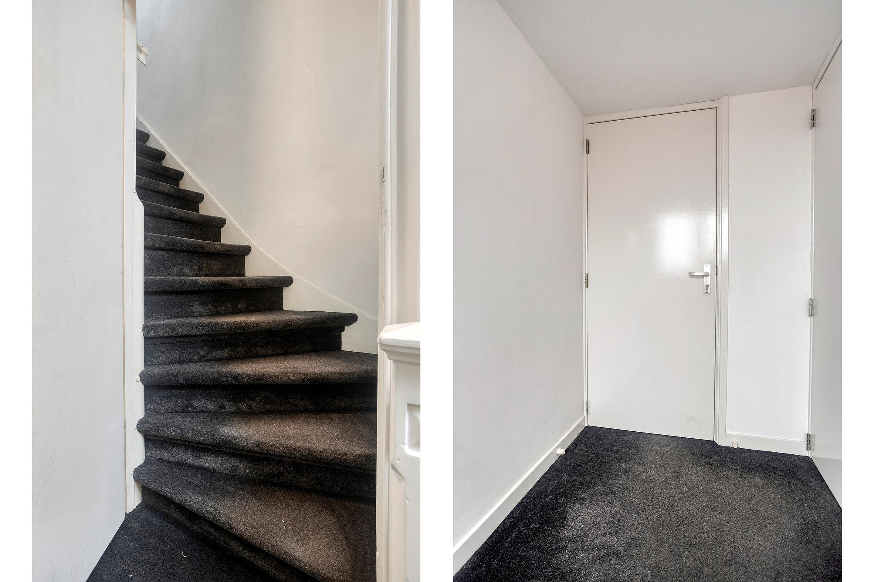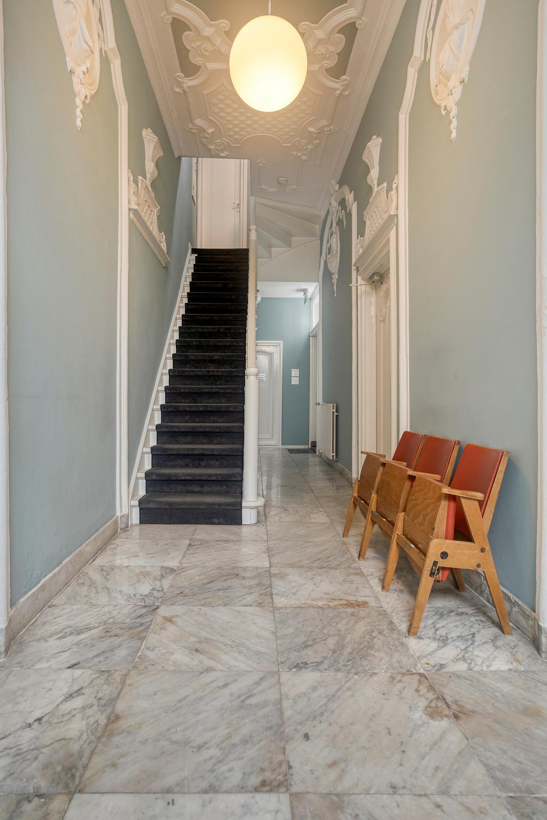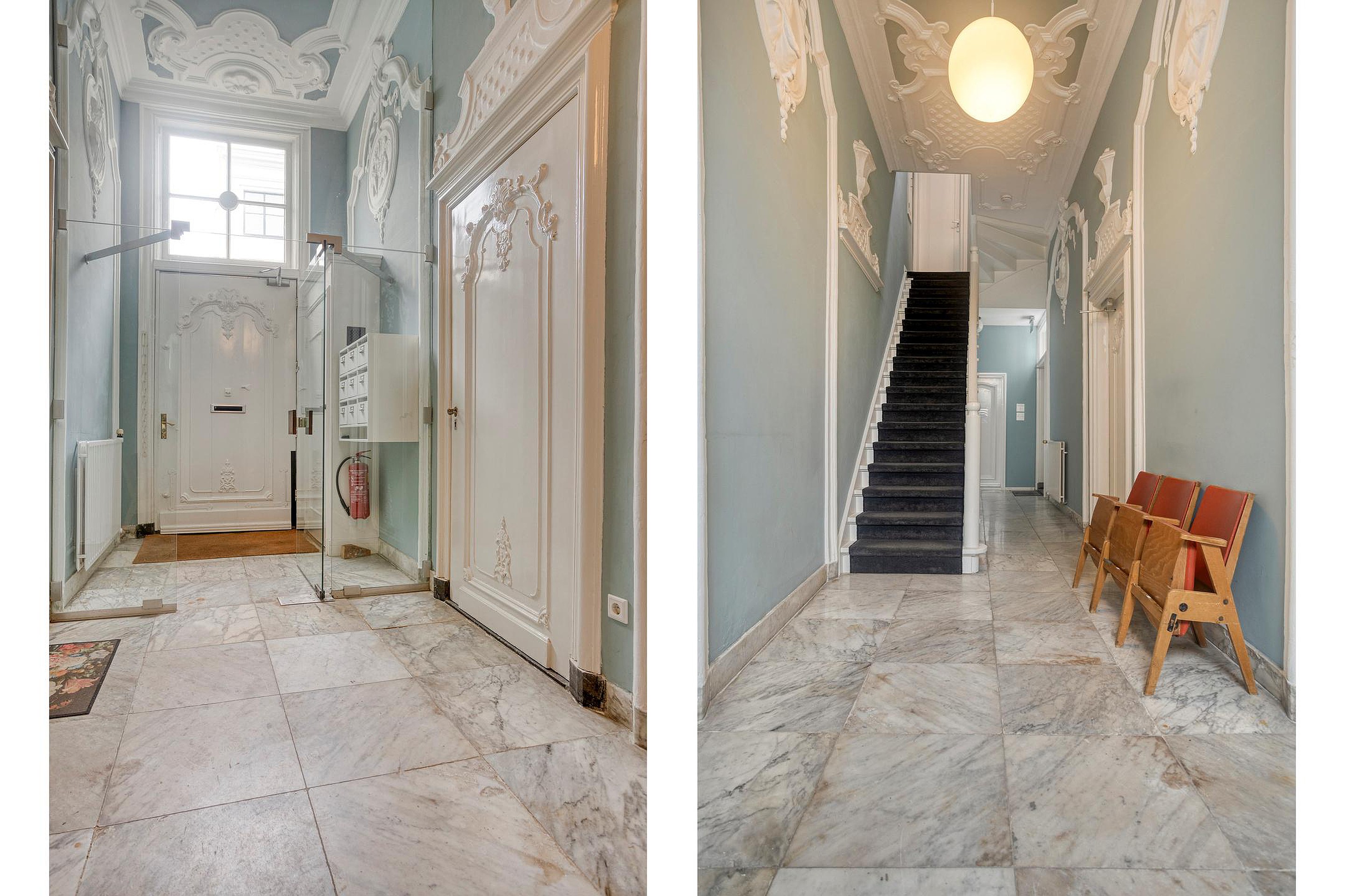 Begane grond De indeling is als volgt: gezamenlijke entree op de begane grond, voorportaal met brievenbussen, door de hoge glazen deur kom je in de hal met de statige trap, hoge plafonds met schitterende ornamenten. Op de tweede verdieping bevindt zich de voordeur van de studio. Wat er achter deze deur schuilgaat moet je echt zelf ‘voelen’, een verrassend leuke ruimte.
