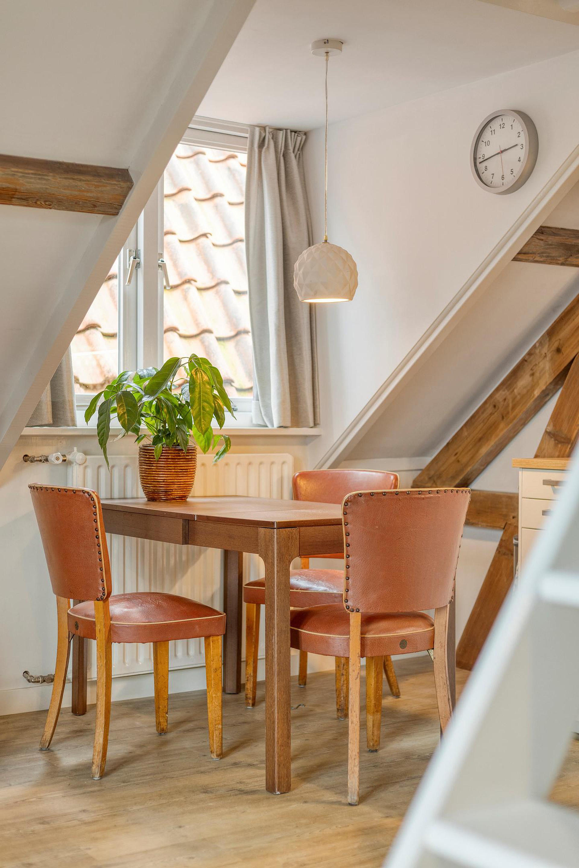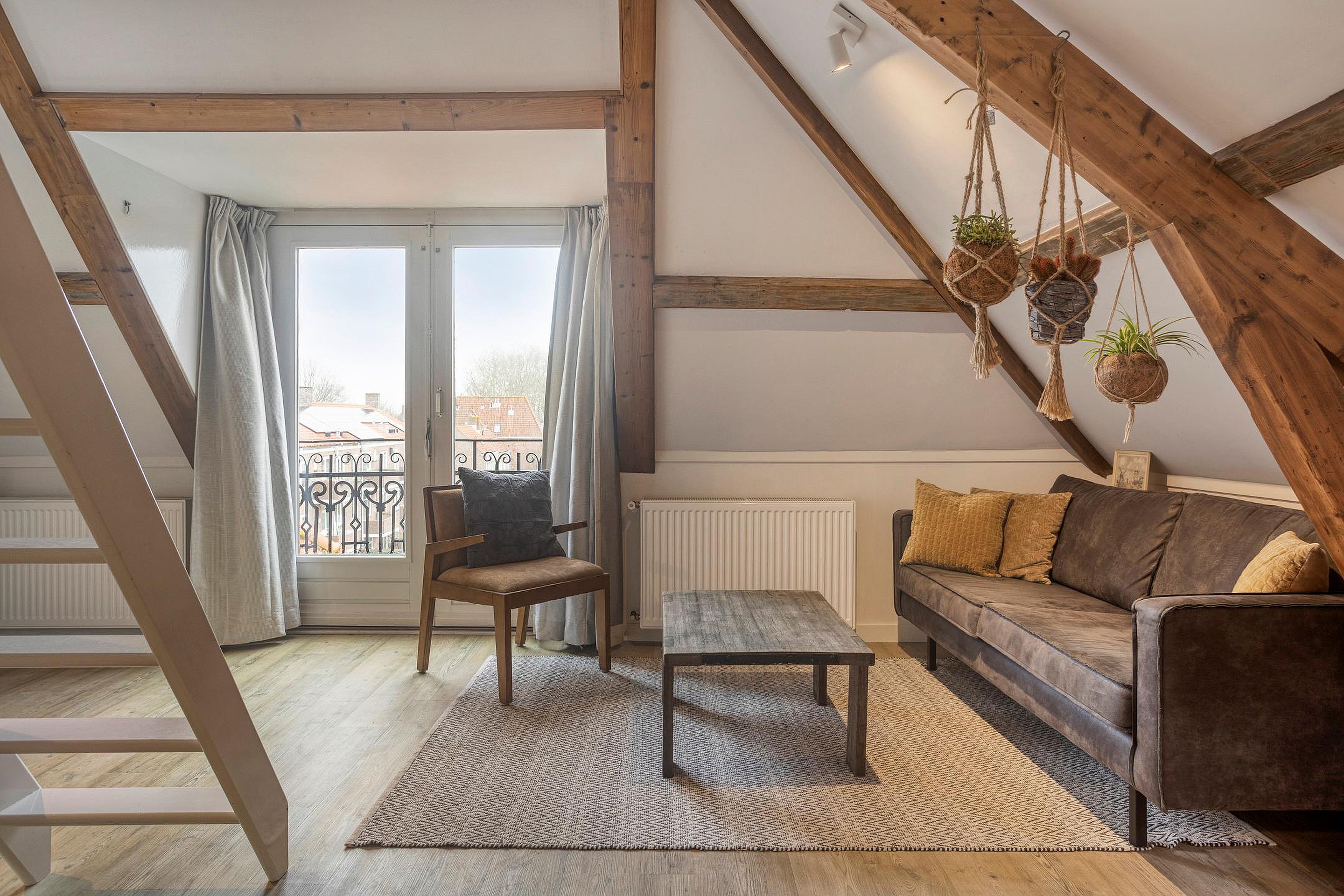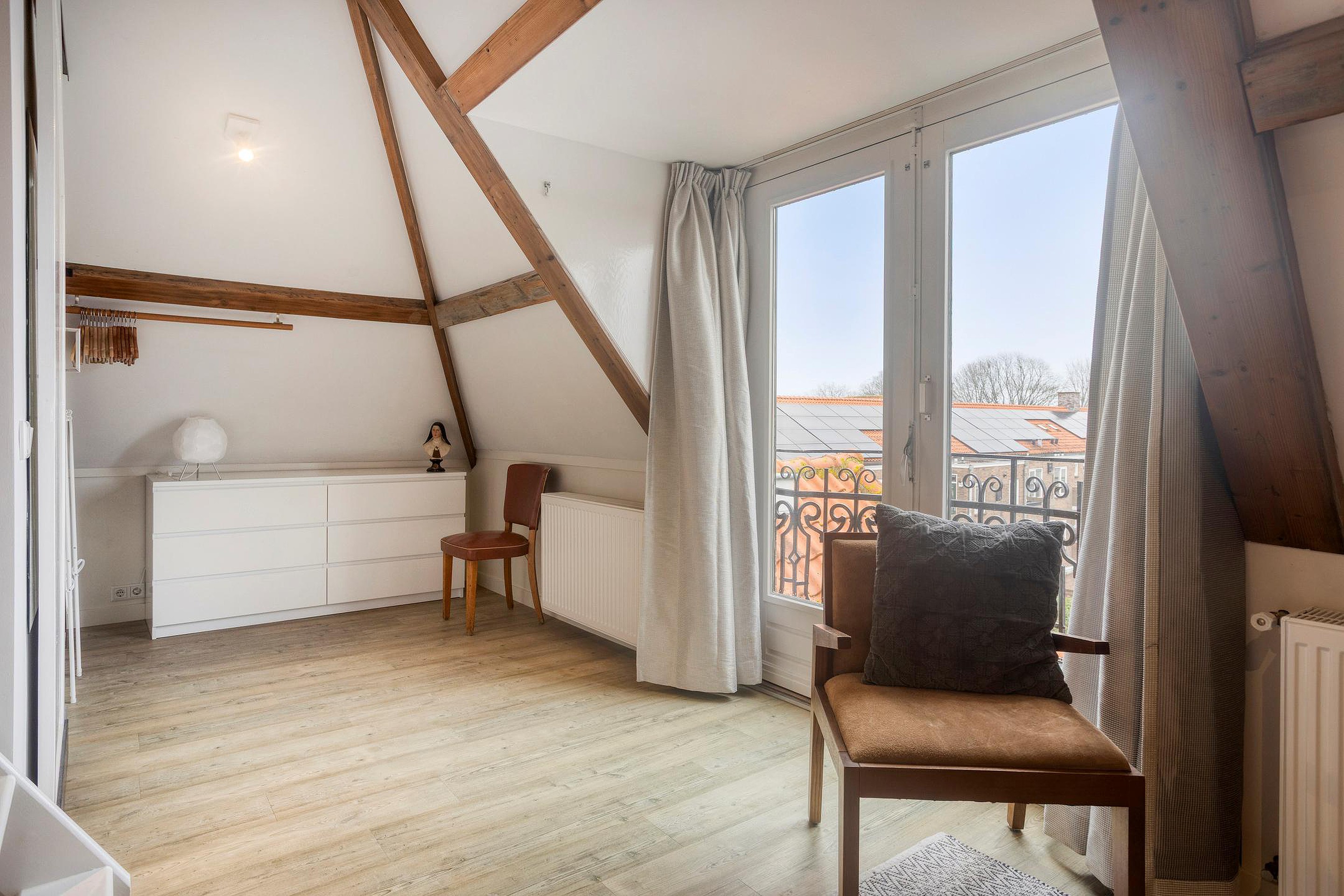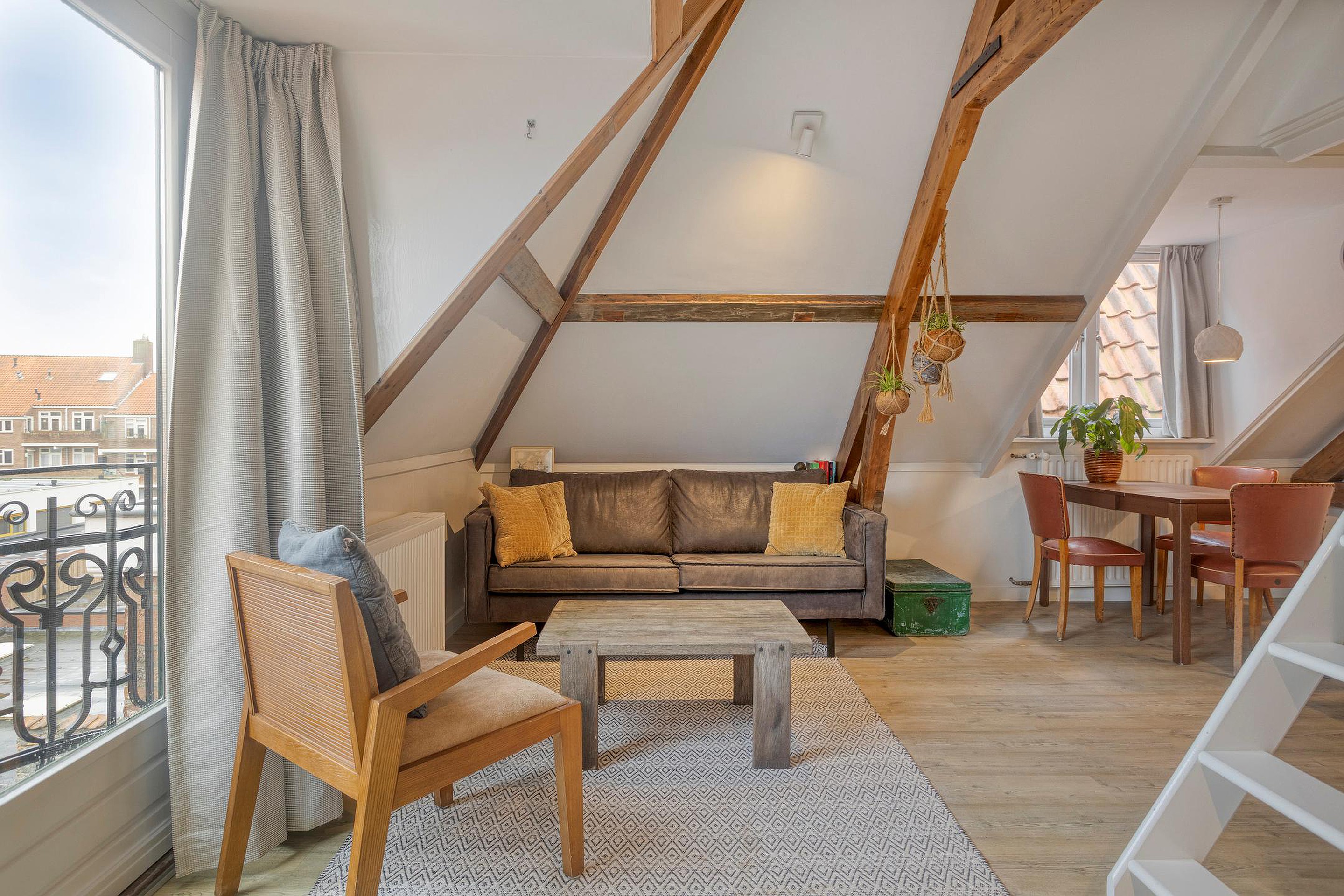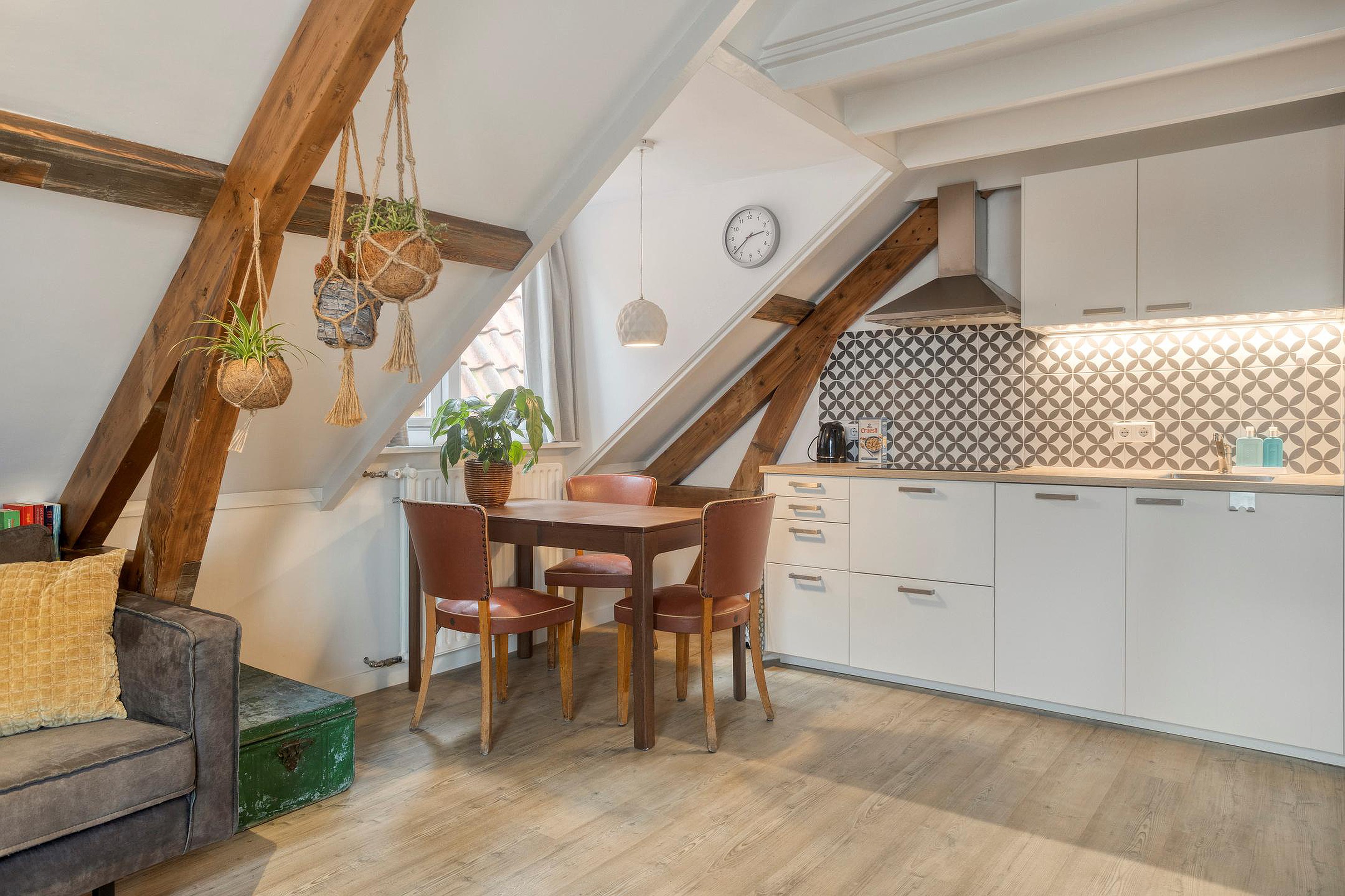 Woonkamer met complete keuken en een fijne lichtinval, ook door het zijraam. Er zijn enkele inbouwkasten gemaakt, erg praktisch. De trap brengt je op de slaapzolder, onder de kap, wat een sfeer. En als bonus: met de deuren van het frans balkonnetje open, zit je hier heerlijk in de ochtend en middagzon met een leuk stadszicht….hier zit je als een ‘prins of prinses’!
