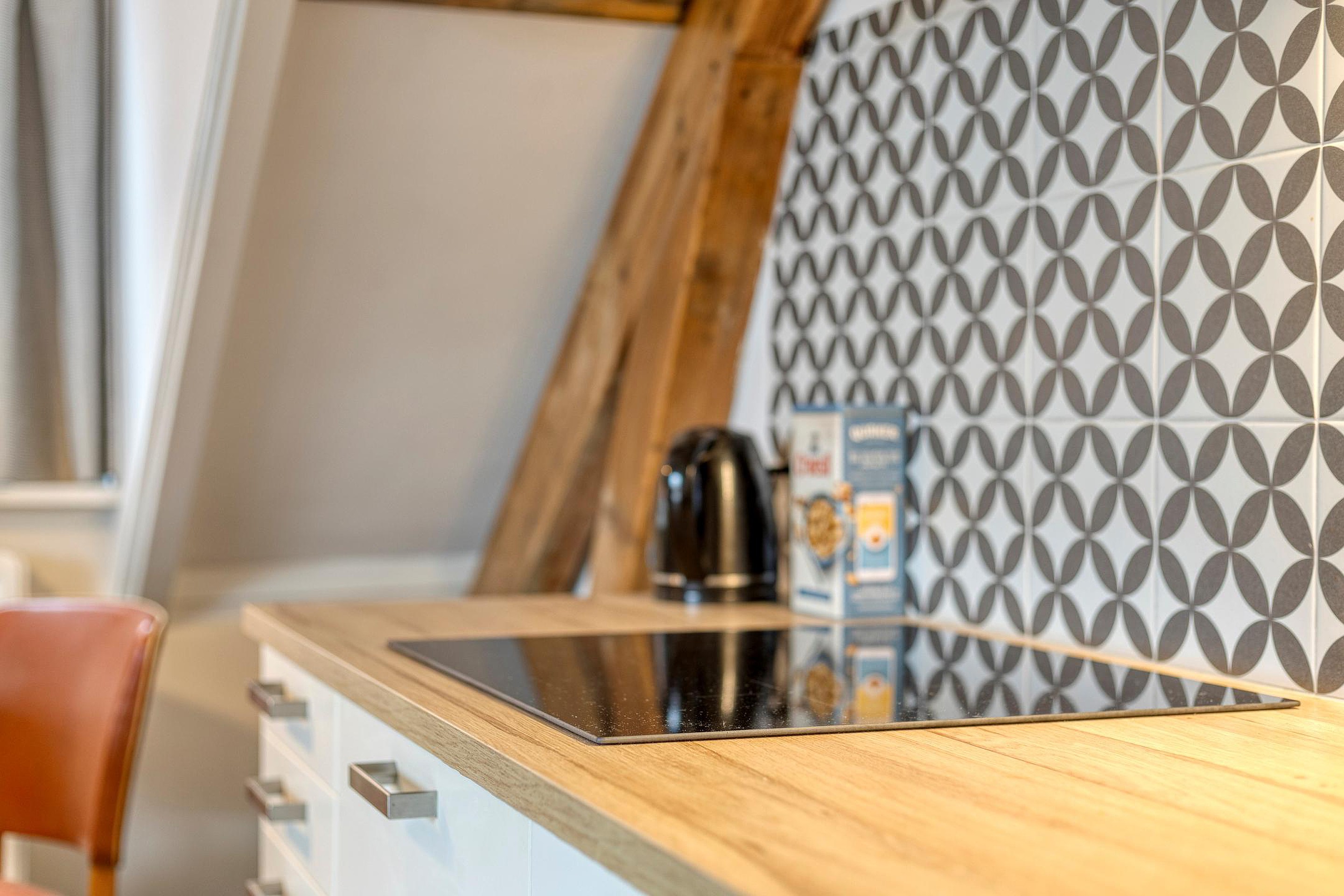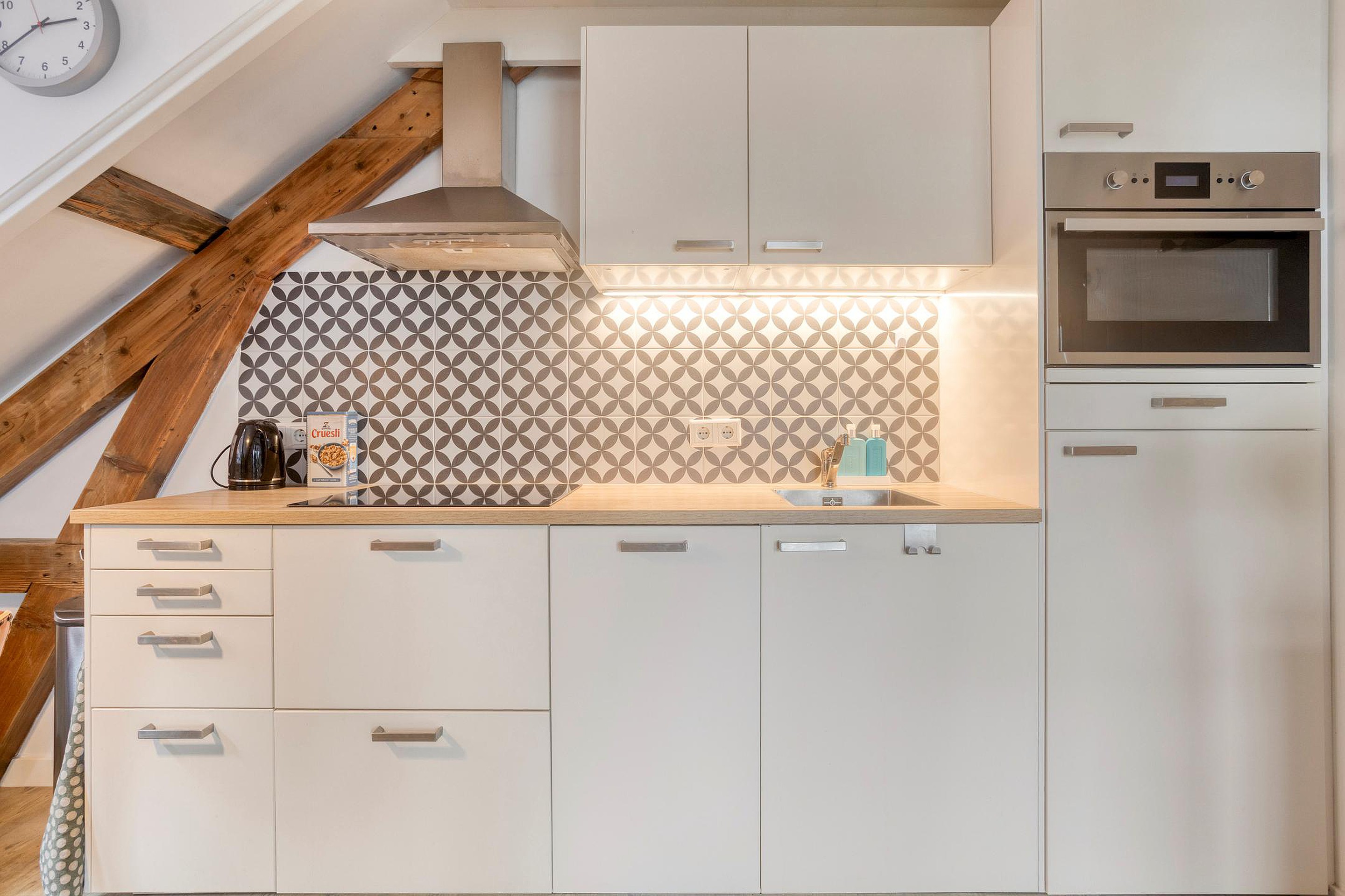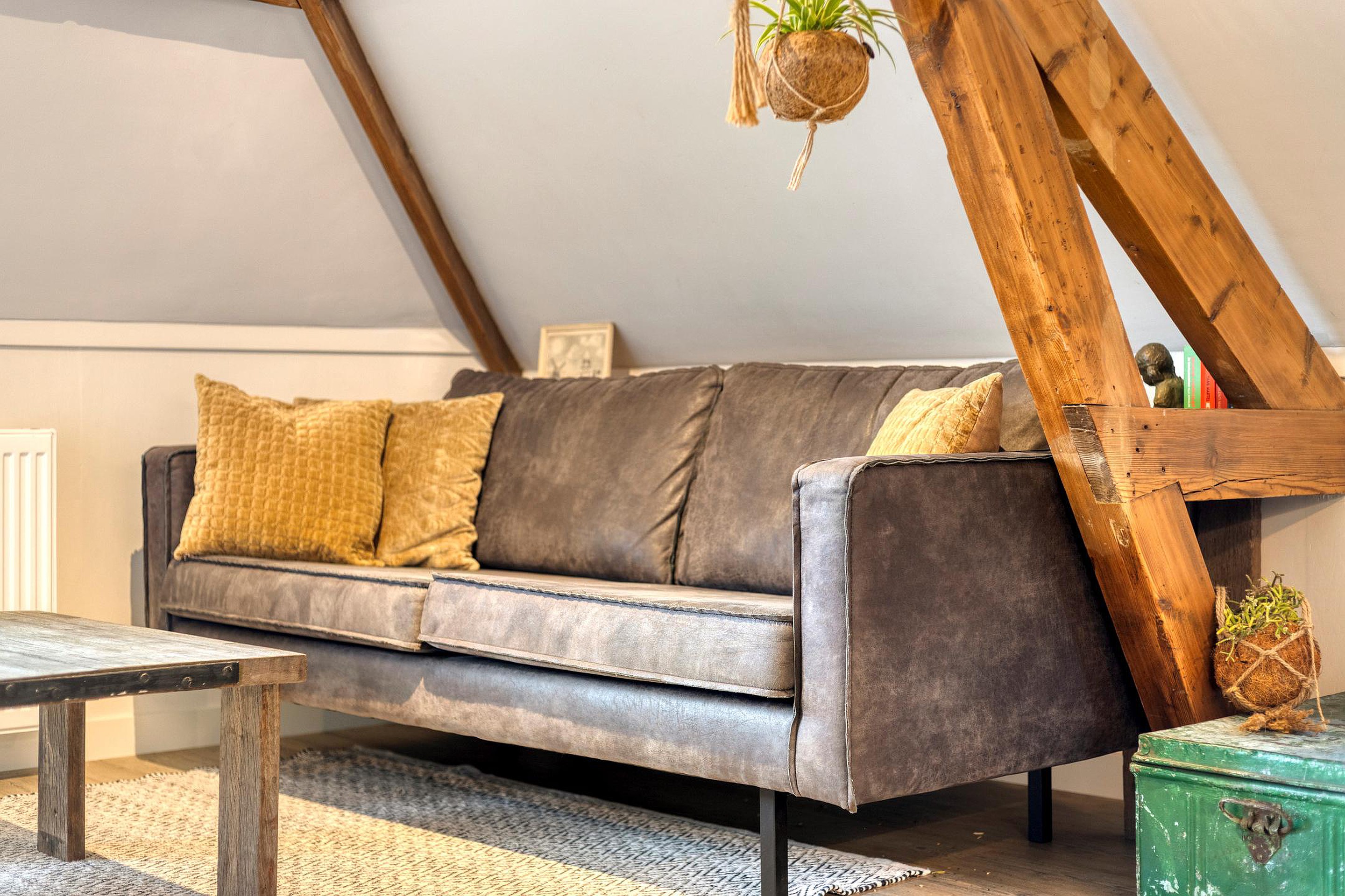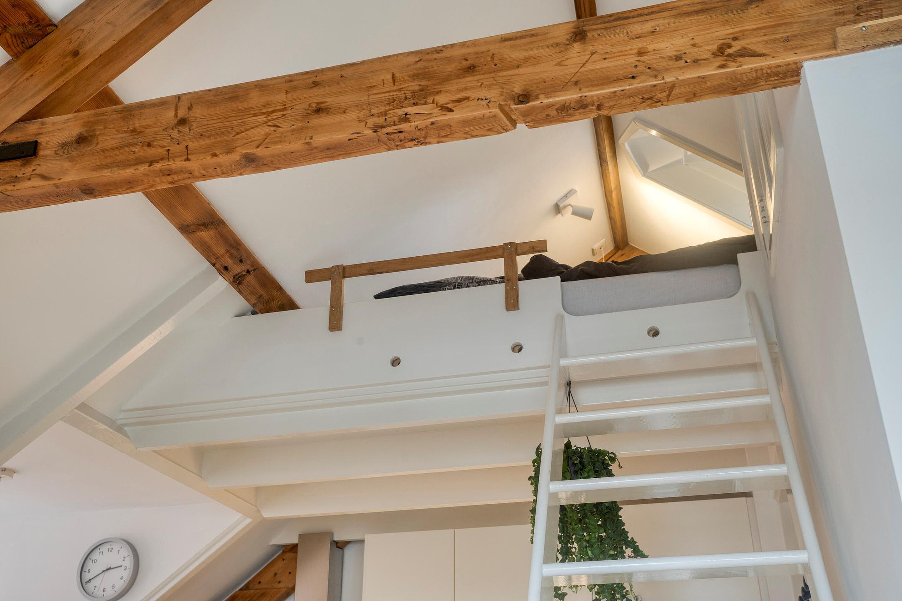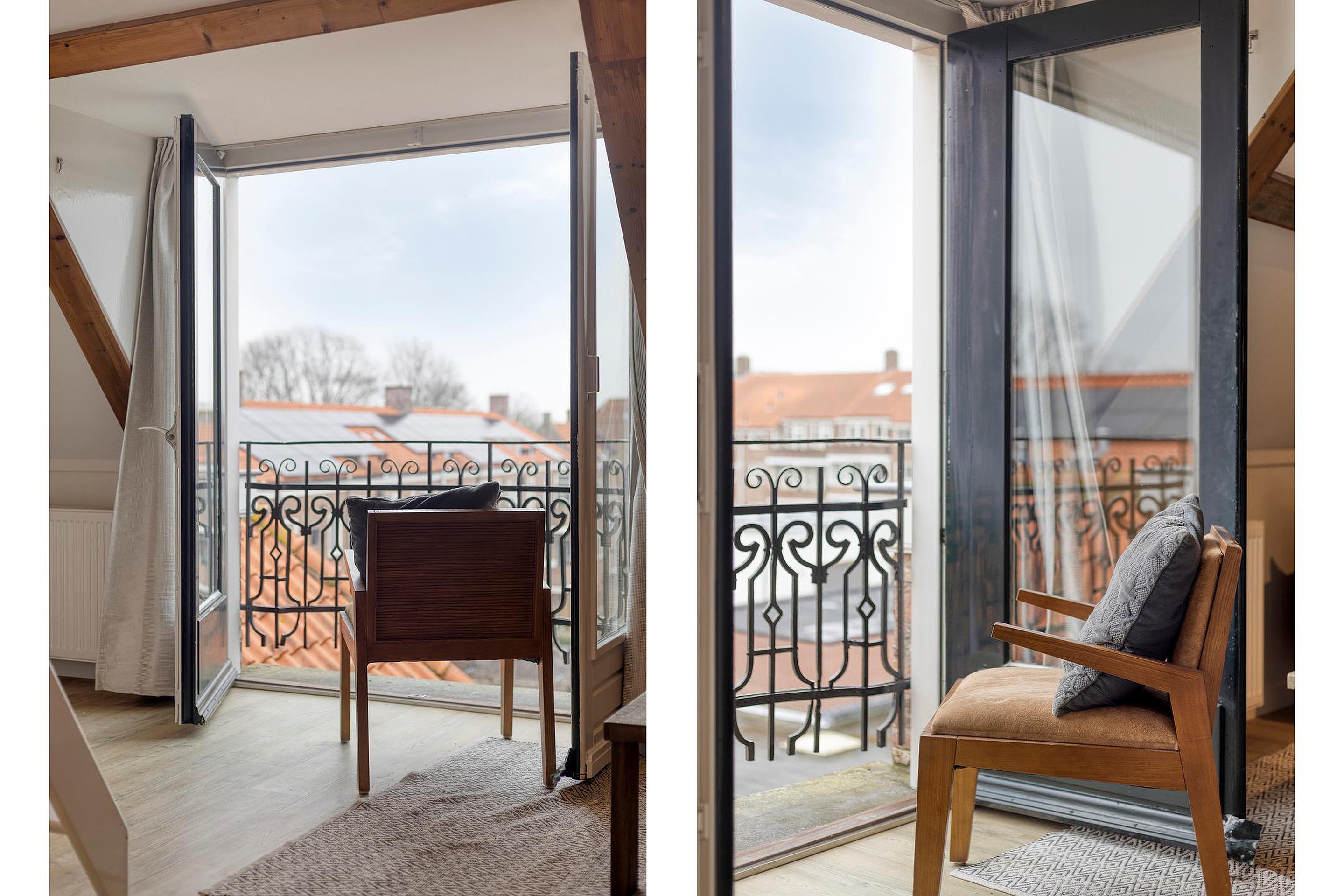 Woonkamer met complete keuken en een fijne lichtinval, ook door het zijraam. Er zijn enkele inbouwkasten gemaakt, erg praktisch. De trap brengt je op de slaapzolder, onder de kap, wat een sfeer. En als bonus: met de deuren van het frans balkonnetje open, zit je hier heerlijk in de ochtend en middagzon met een leuk stadszicht….hier zit je als een ‘prins of prinses’!