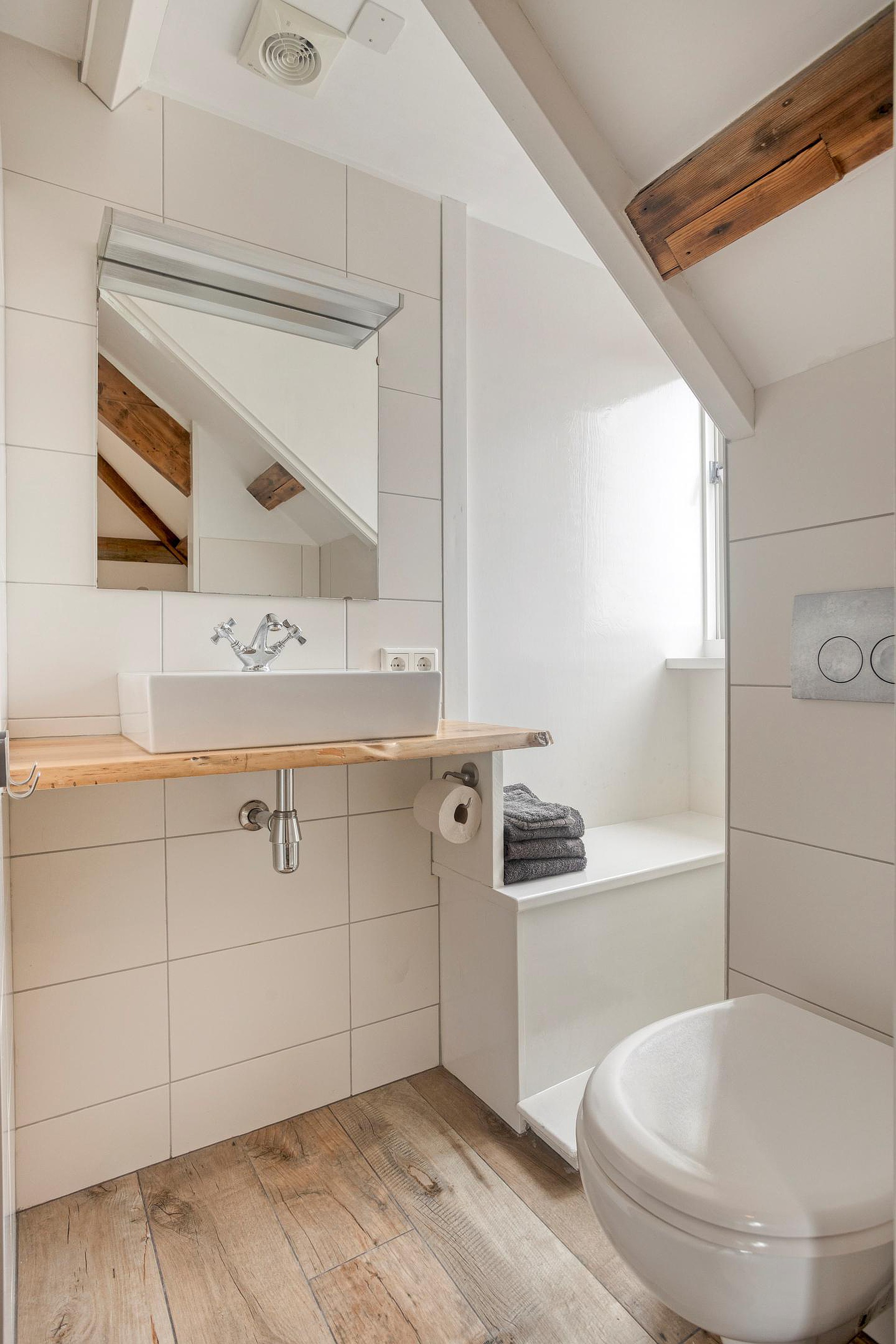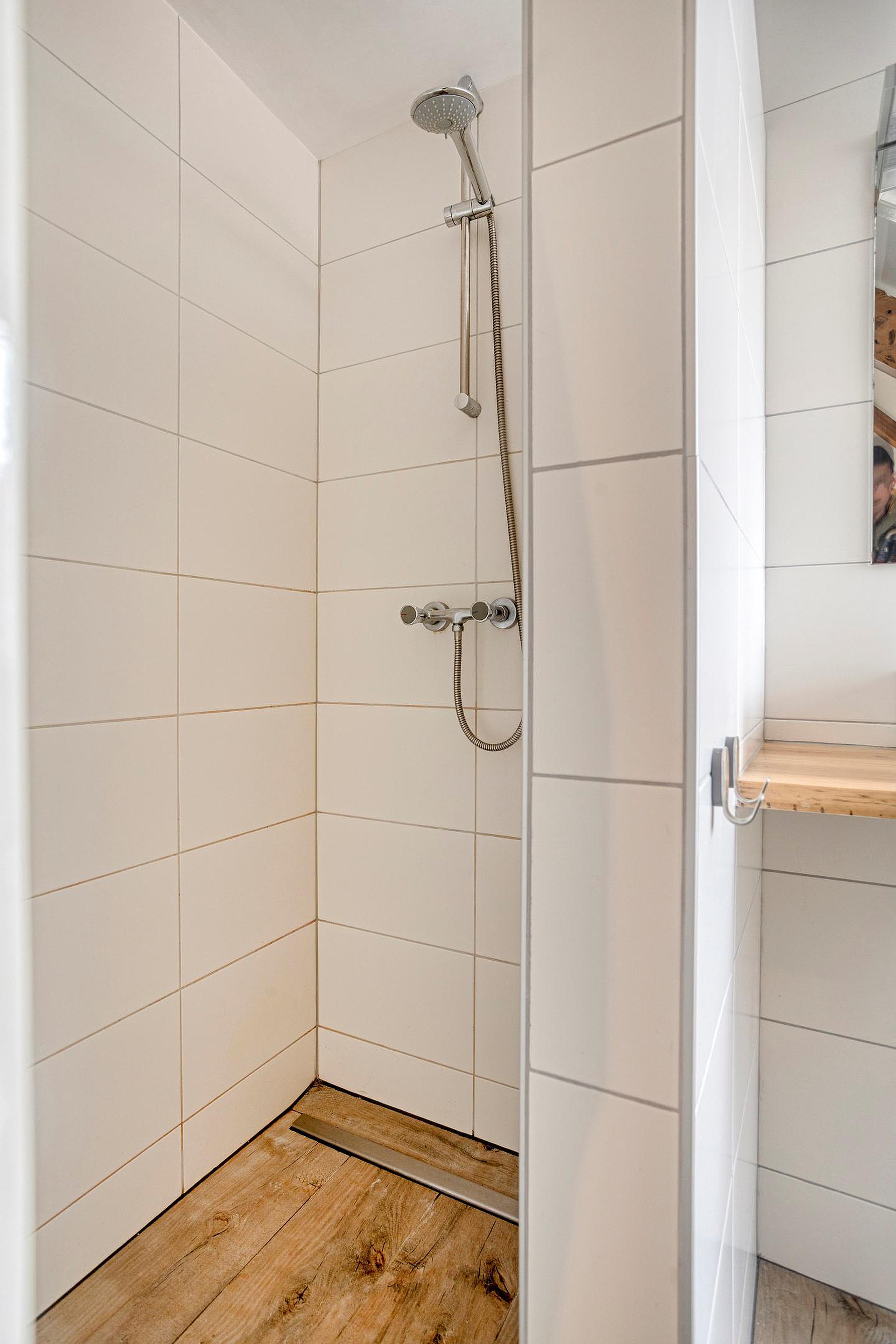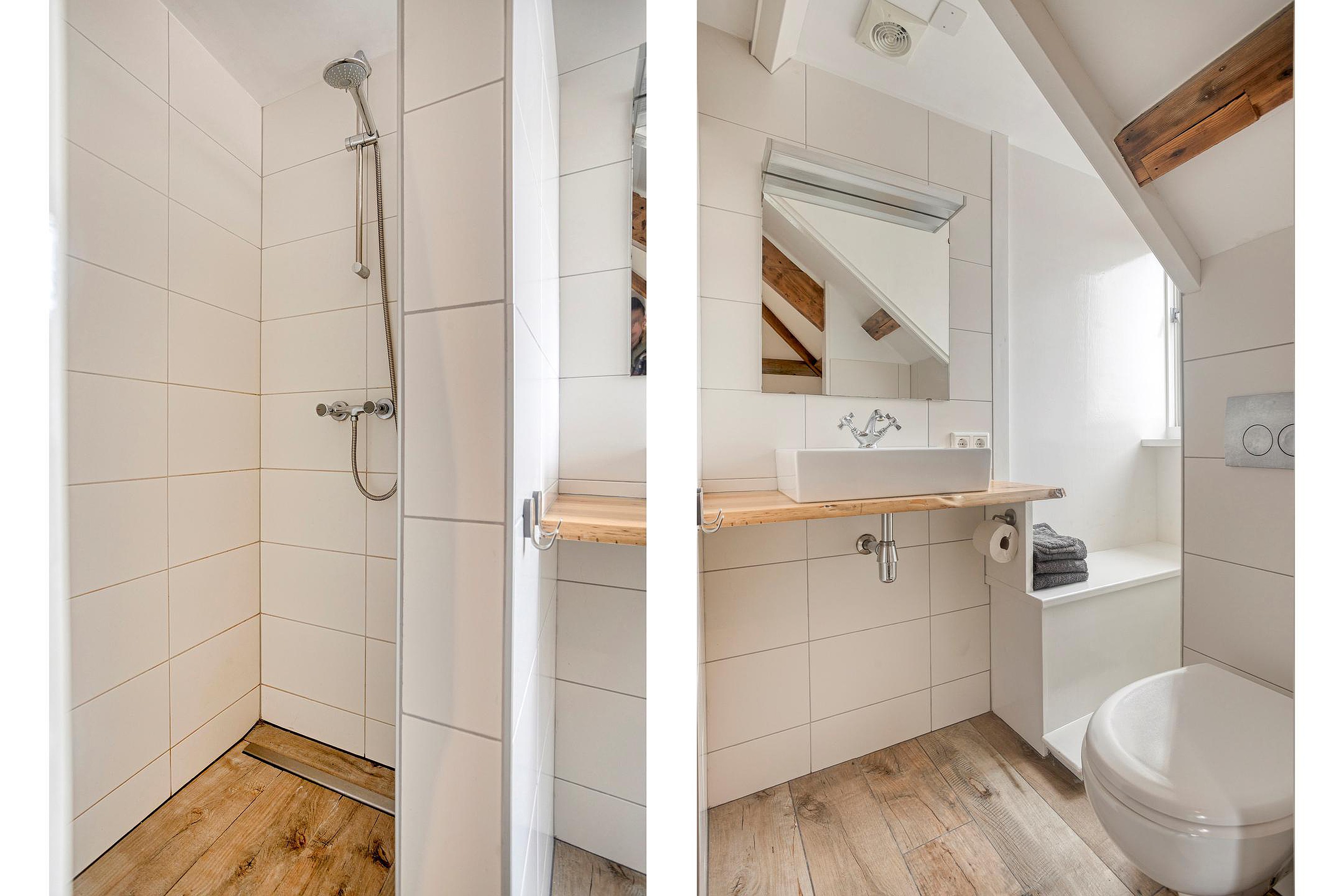 De badkamer is voorzien van een inloopdouche, wastafel en het toilet.
