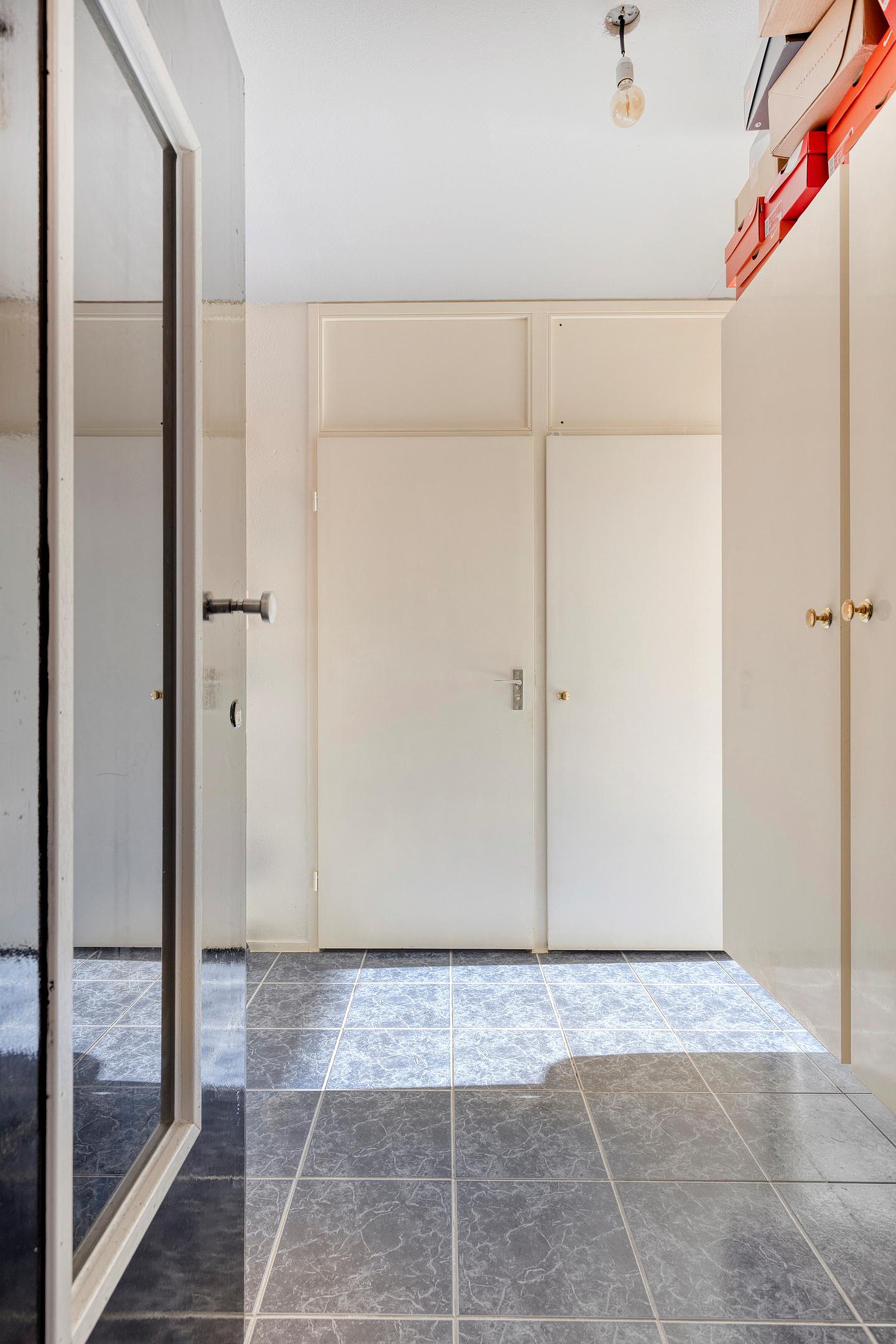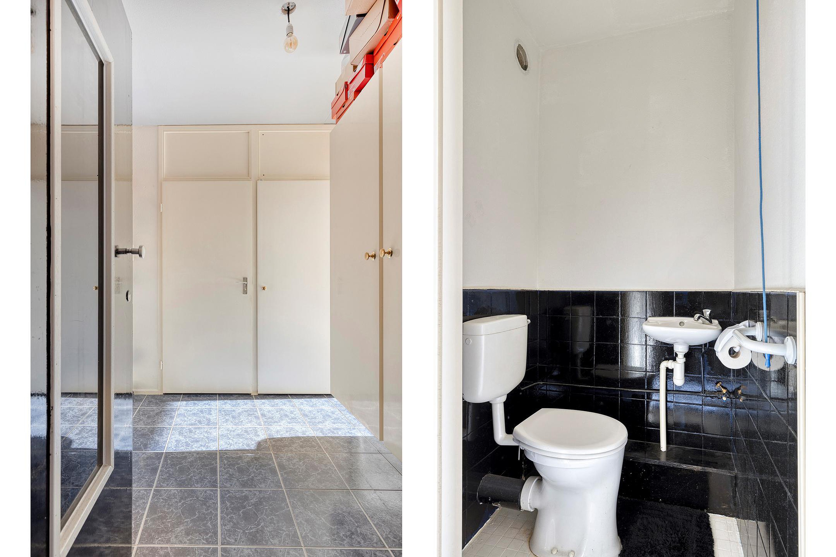 Entree, hal met vaste kasten en meterkast waarvan de groepen zijn vernieuwd. Het toilet met fonteintje.
