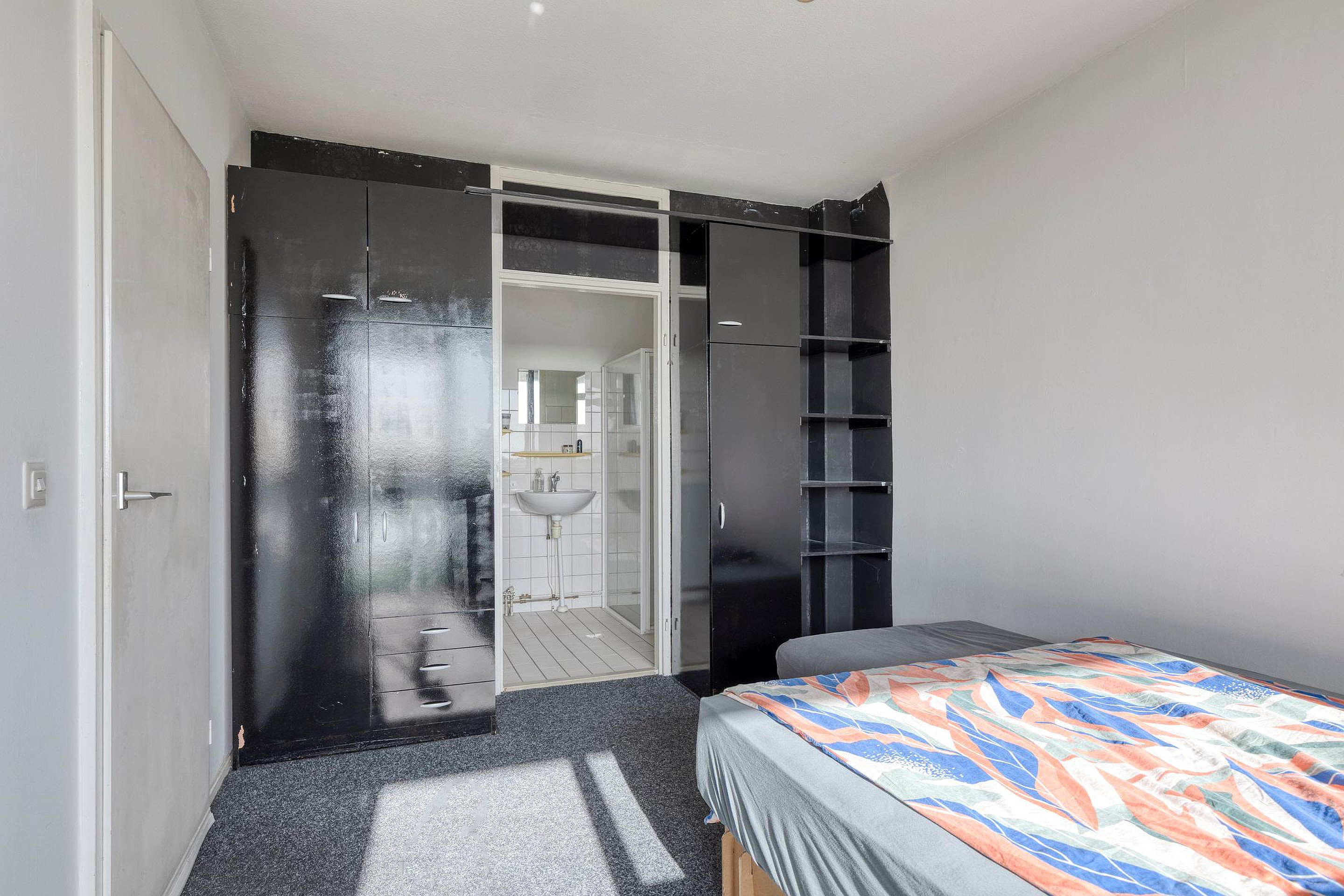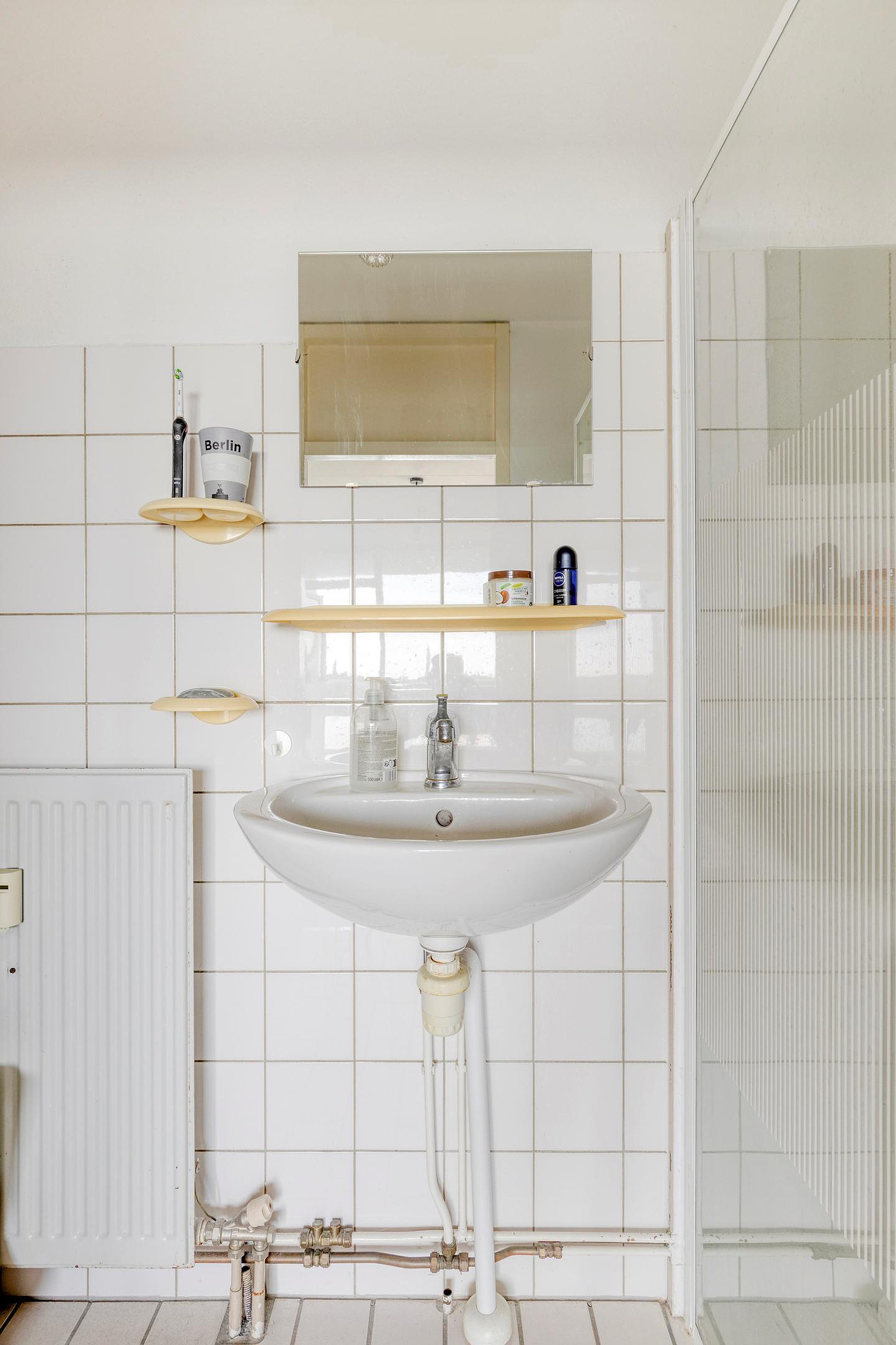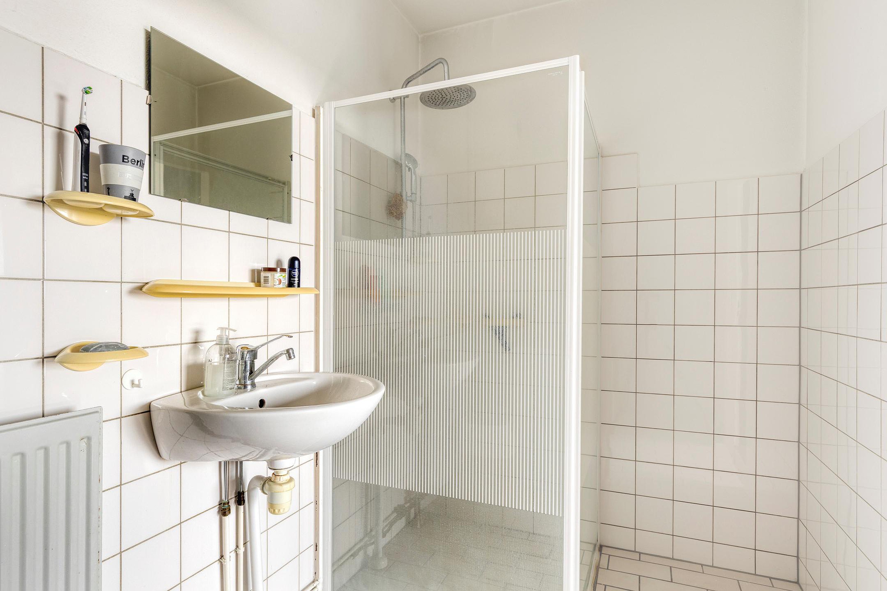 Doorlopend vanuit de woonkamer is de slaapkamer bereikbaar met aansluitend de badkamer met douche, wastafel en de wasmachine aansluiting.
