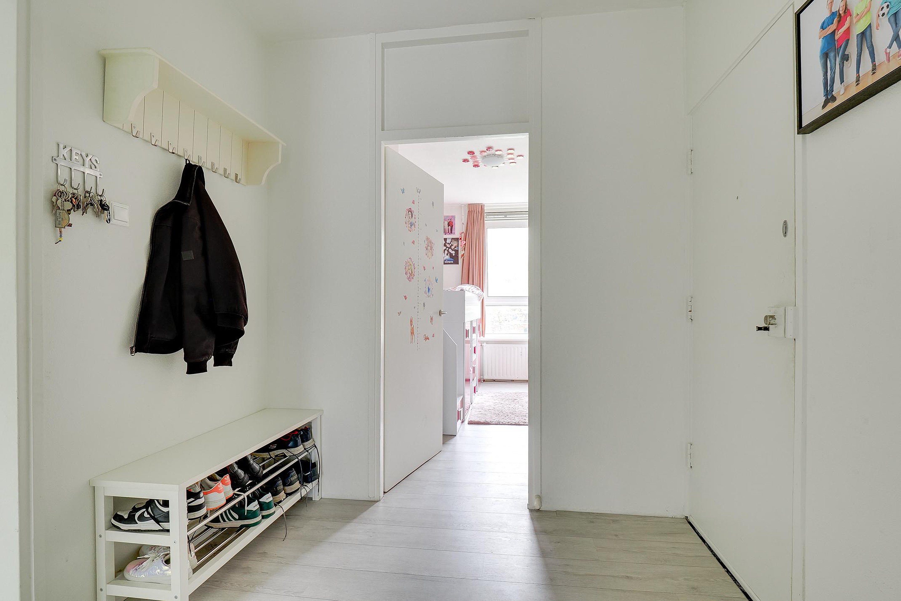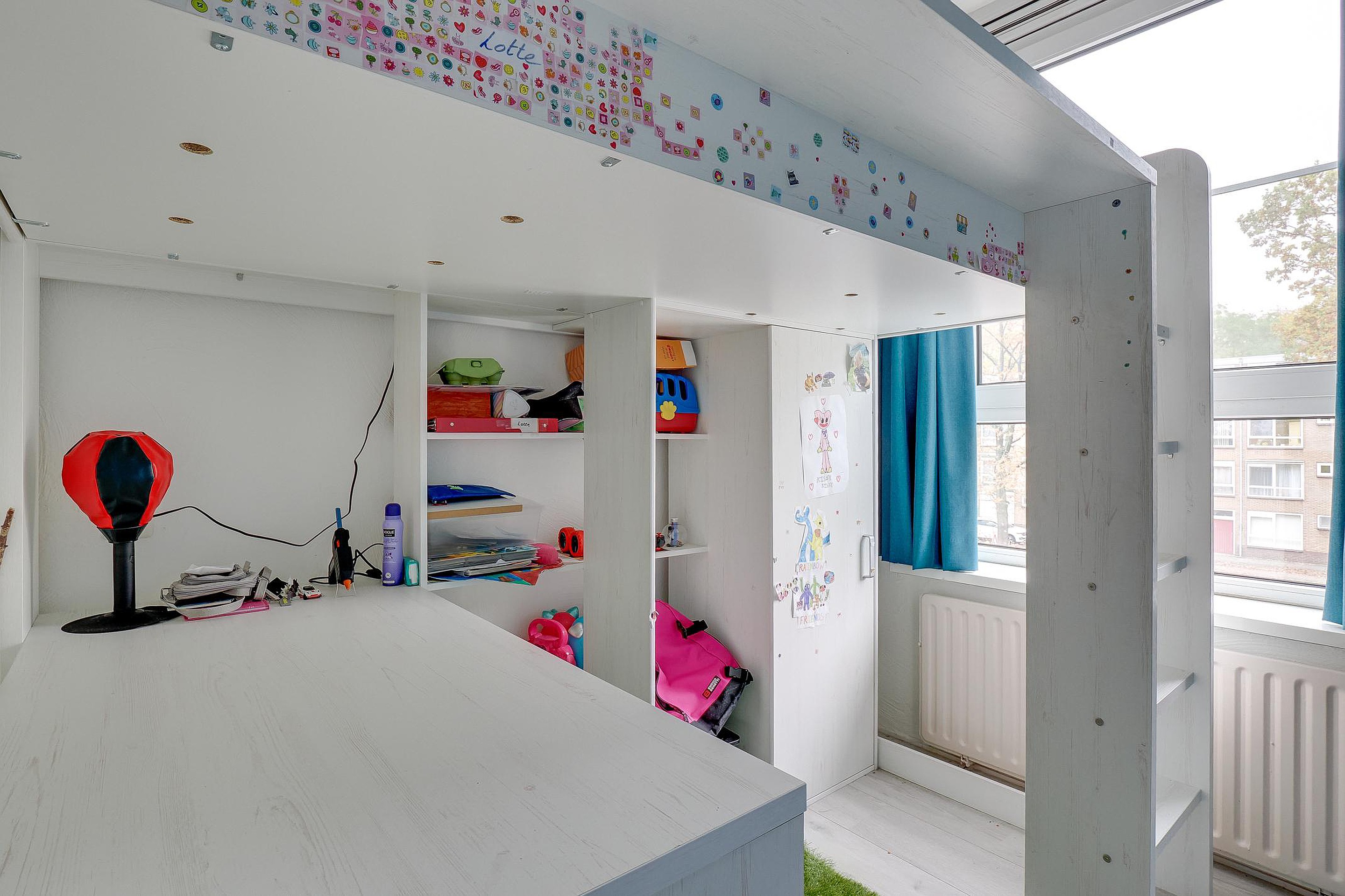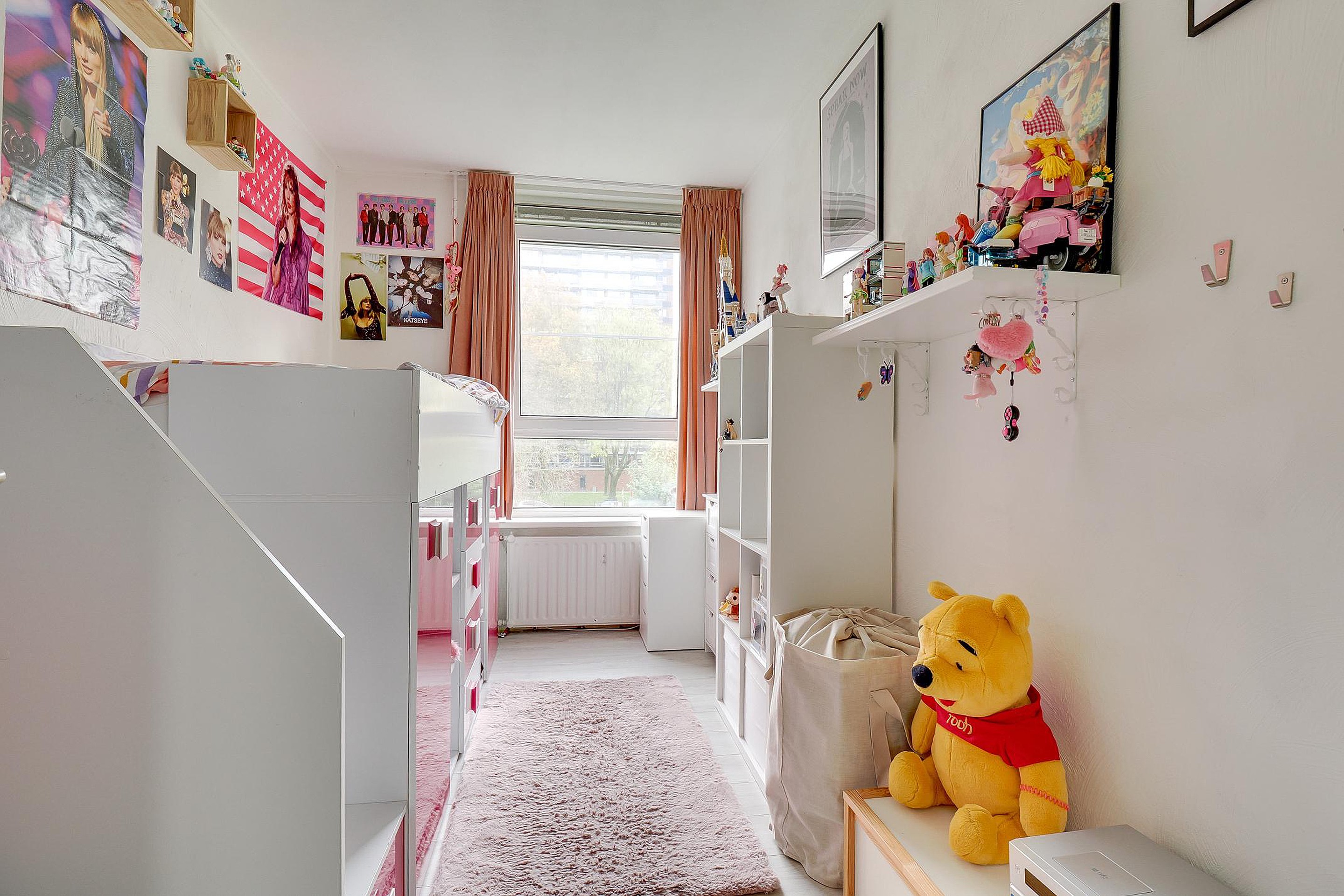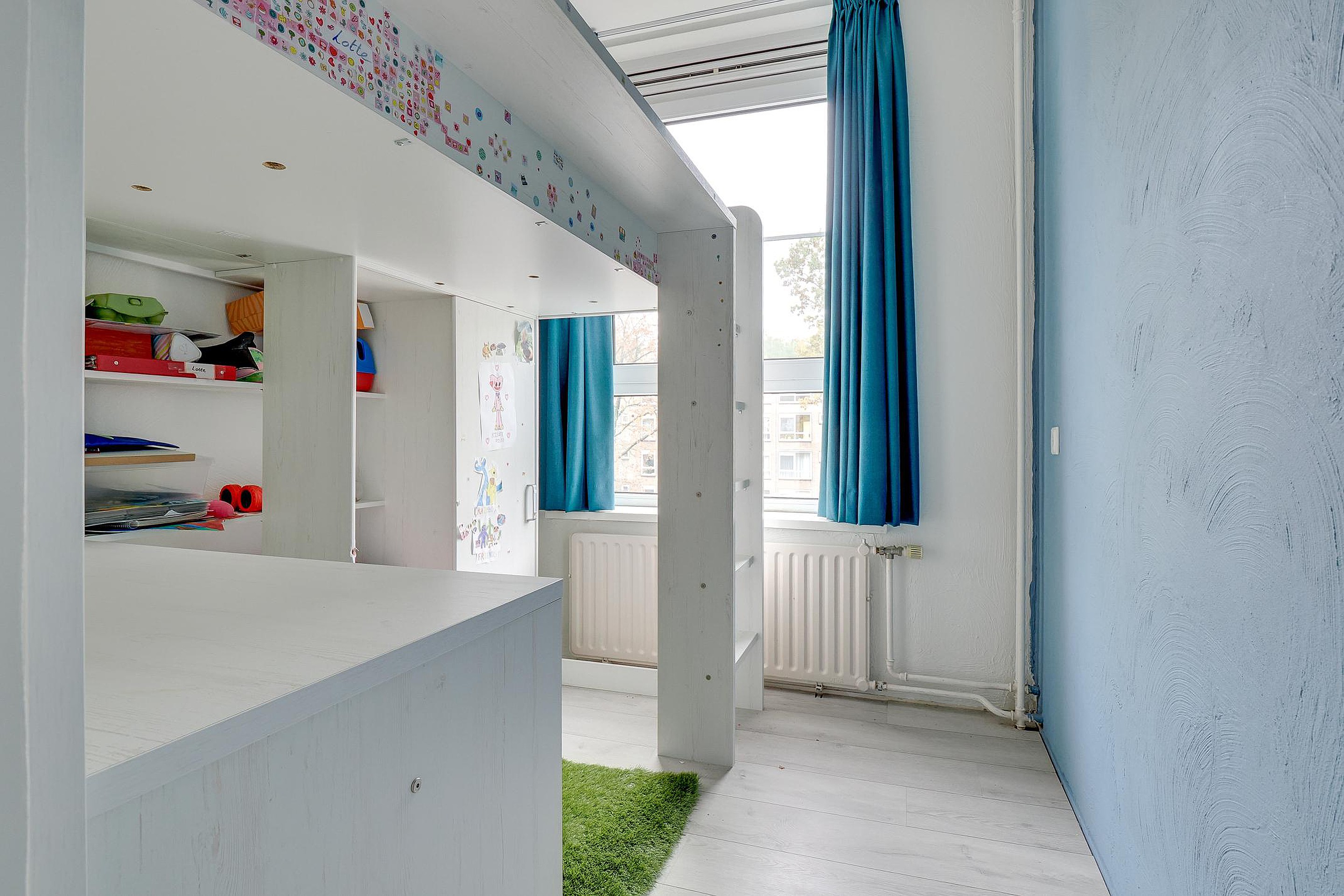 Het appartement beschikt verder over in totaal vier slaapkamers, waarvan er één is opgedeeld in twee kleinere kamers. Perfect voor een gezin, thuiswerkplek of logeerkamer. Daarnaast zijn er een mooi afgewerkte badkamer, een separaat toilet en twee vaste bergkasten aanwezig. De indeling zorgt overal voor een praktische en efficiënte benutting van de ruimte.