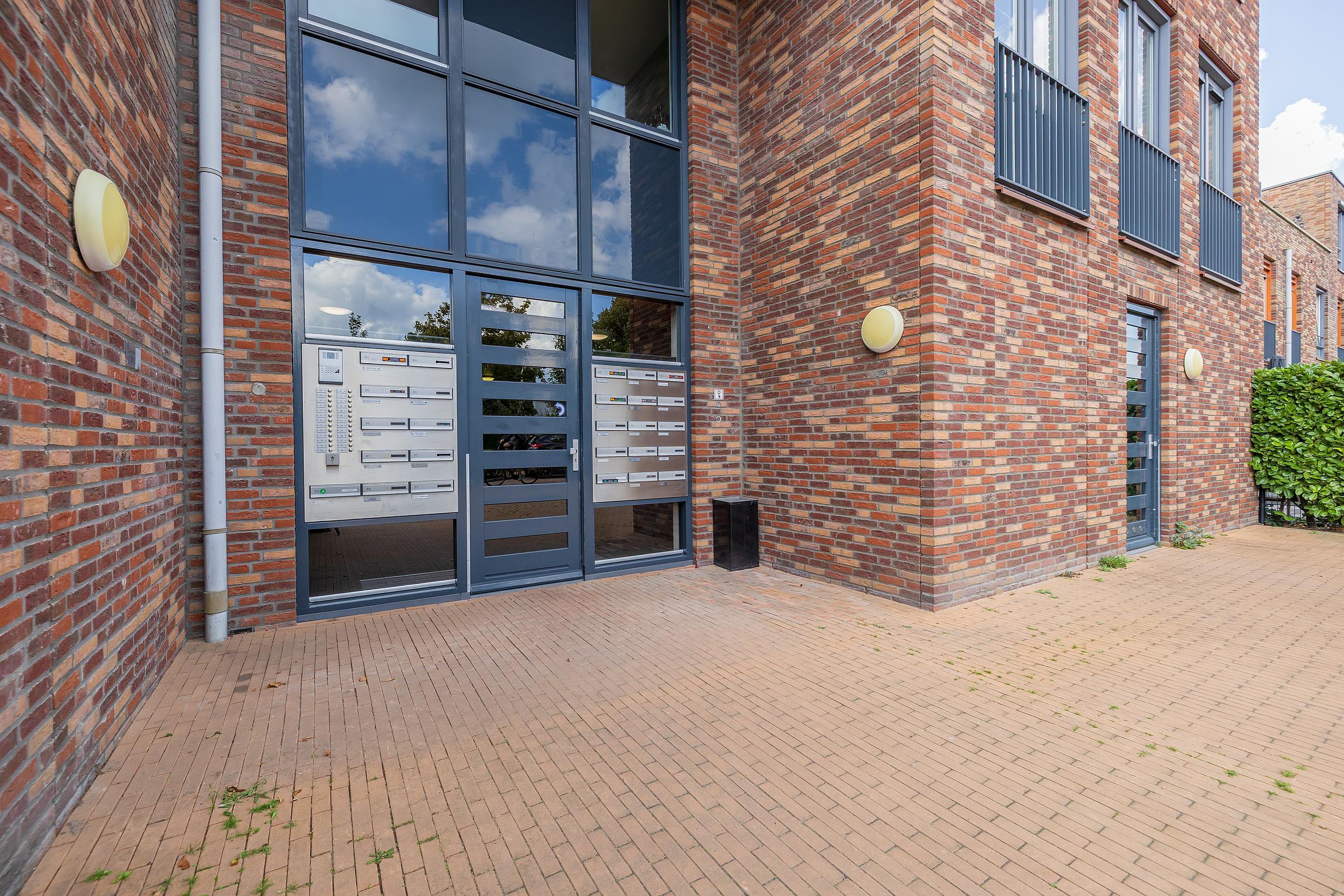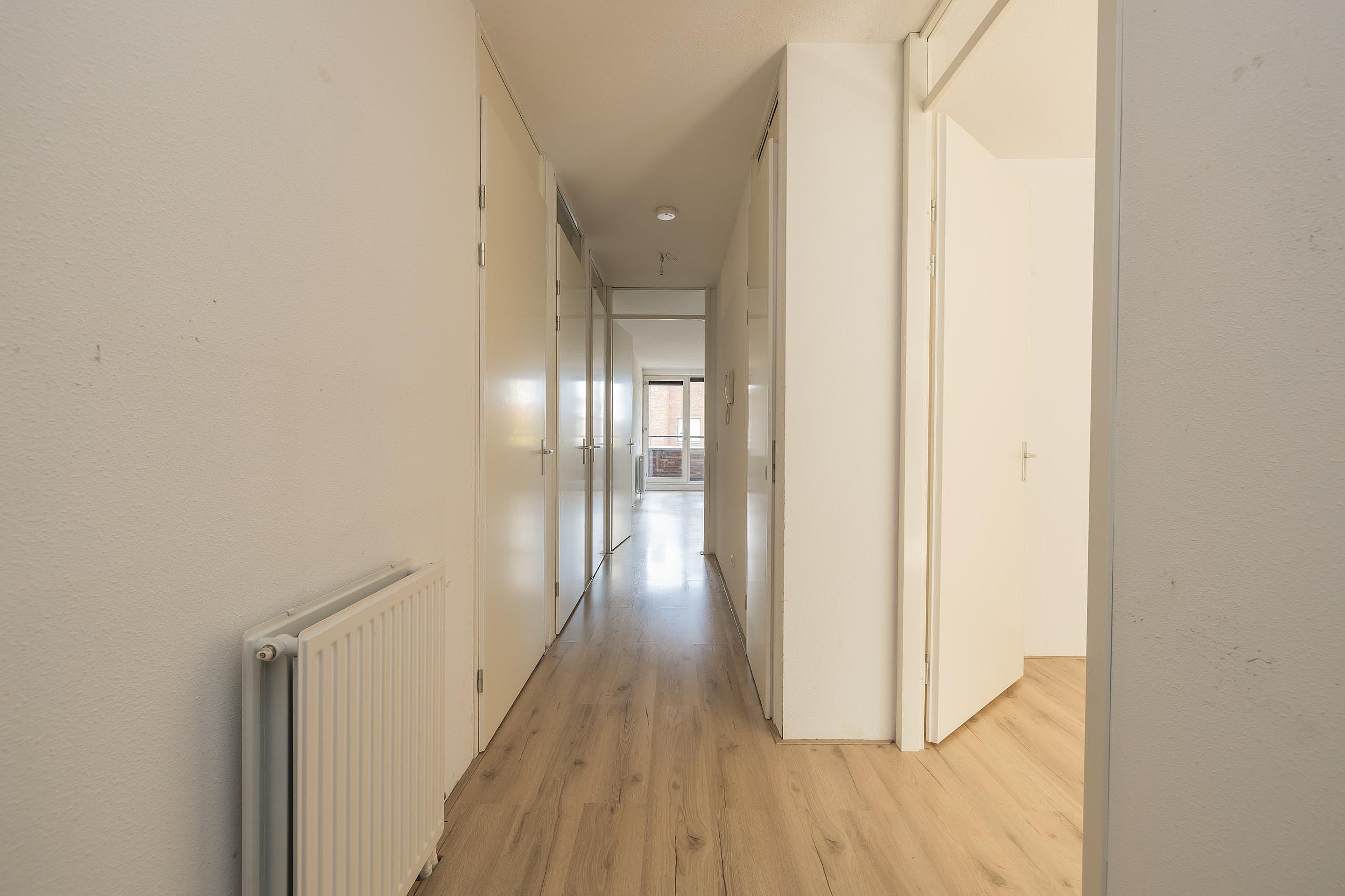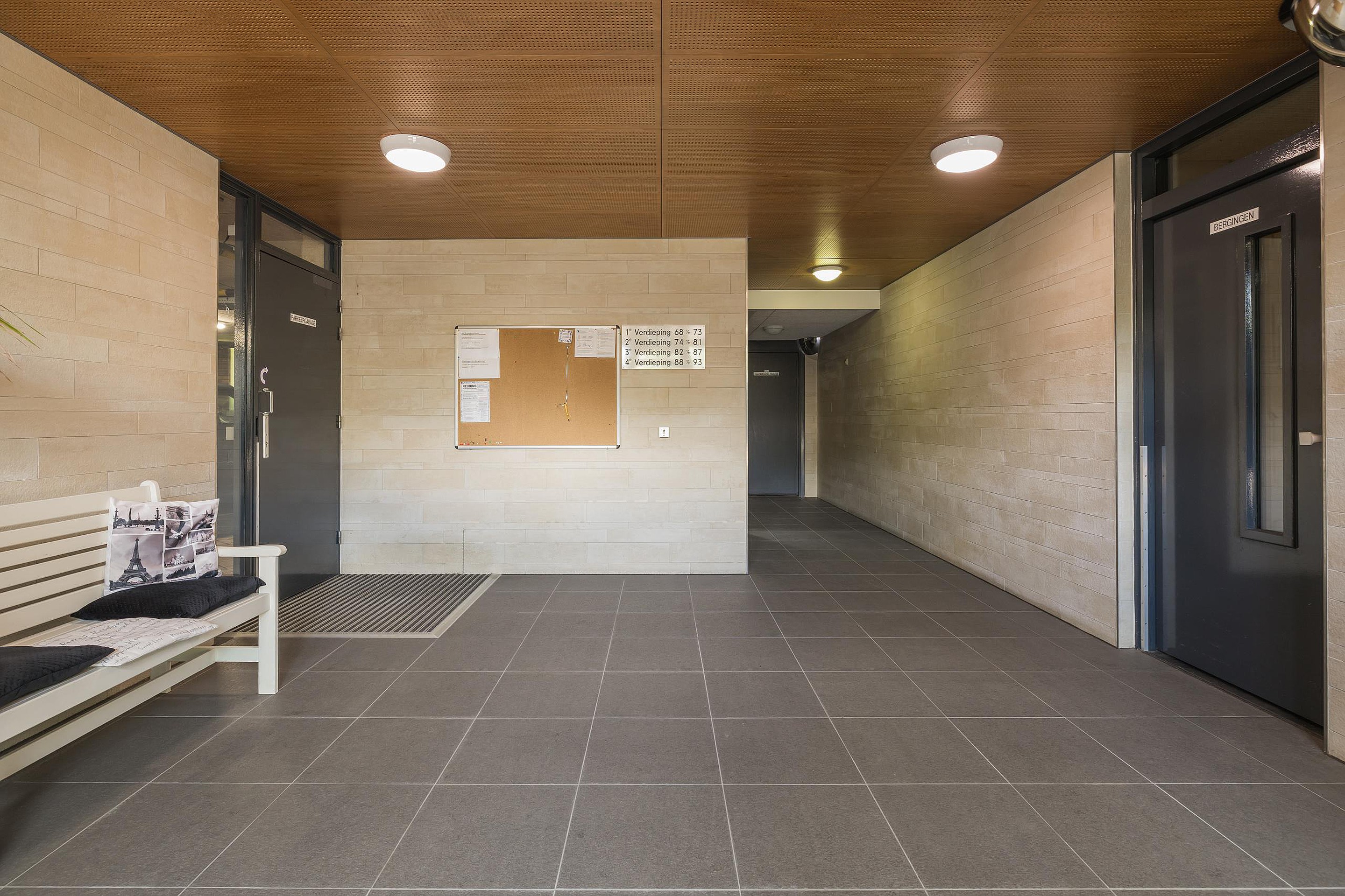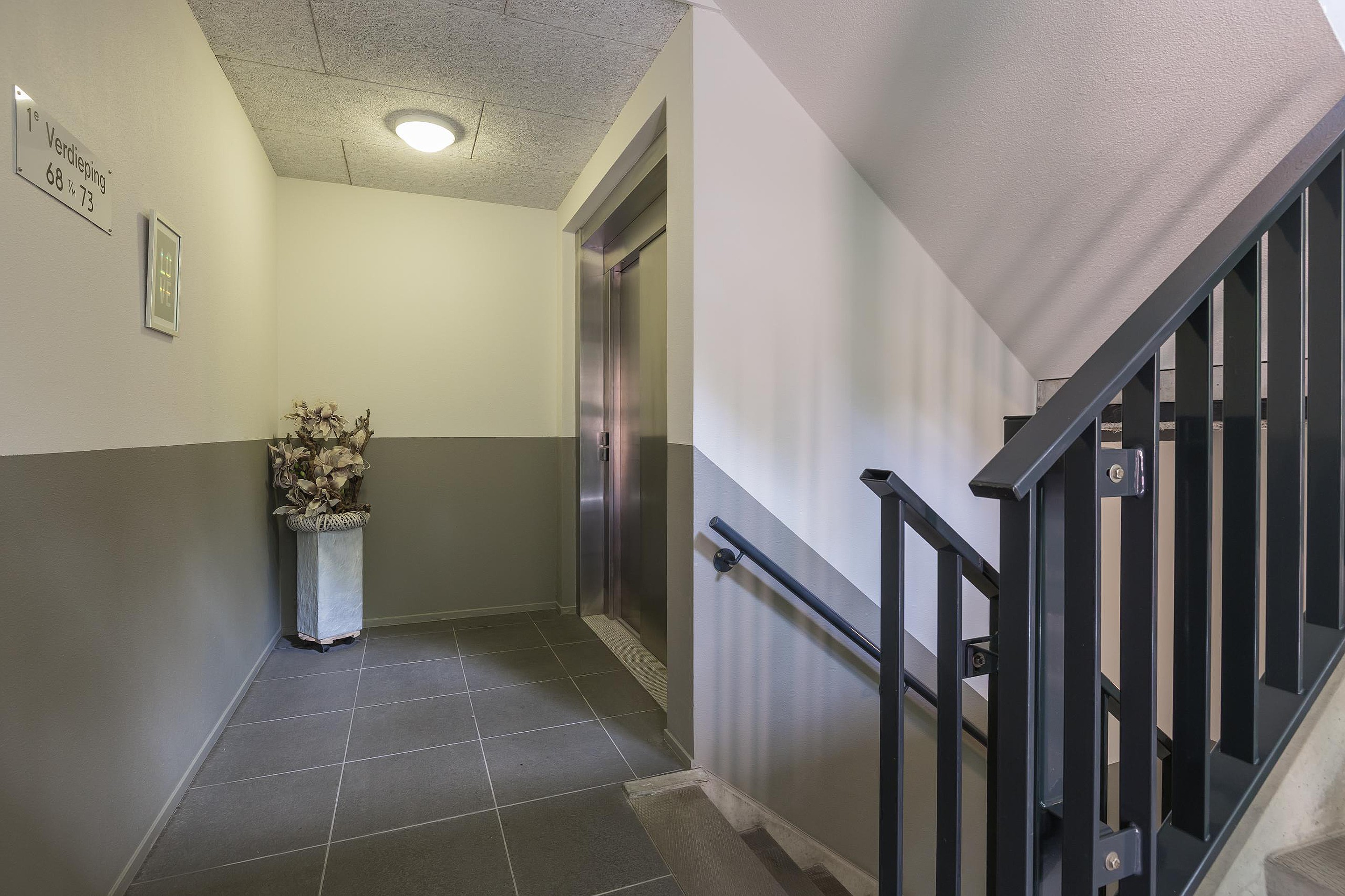 Centrale entree, een ruime hal met de lift en de het trappenhuis, via de hal is de parkeergarage te bereiken en de berging. Het appartement ligt op de eerste woonlaag en is zowel met de lift als het trappenhuis te bereiken. Entree appartement, een ruime hal met de meterkast, de intercom en de toiletruimte met een wandcloset en een fonteitje. De eerste slaapkamer is gelegen aan de galerijzijde en is voorzien van een suskast. Via de hal is de inpandige berging bereikbaar met de opstelling van de CV-ketel (Intergas), het expansievat en de ventilatie-unit. De badkamer is aangenaam ruim en voorzien van een douchcabine en een wastafelmeubel. De woonkamer heeft een lichte laminaatvloer en een open keuken met diverse inbouwapparatuur zoals een 4-pits gaskookplaat, een vaatwasser, een spoelbak, een koelkast en een vriezer. Via de woonkamer is het balkon te bereiken. De tweede volwaardige slaapkamer is gelegen aan de voorzijde.