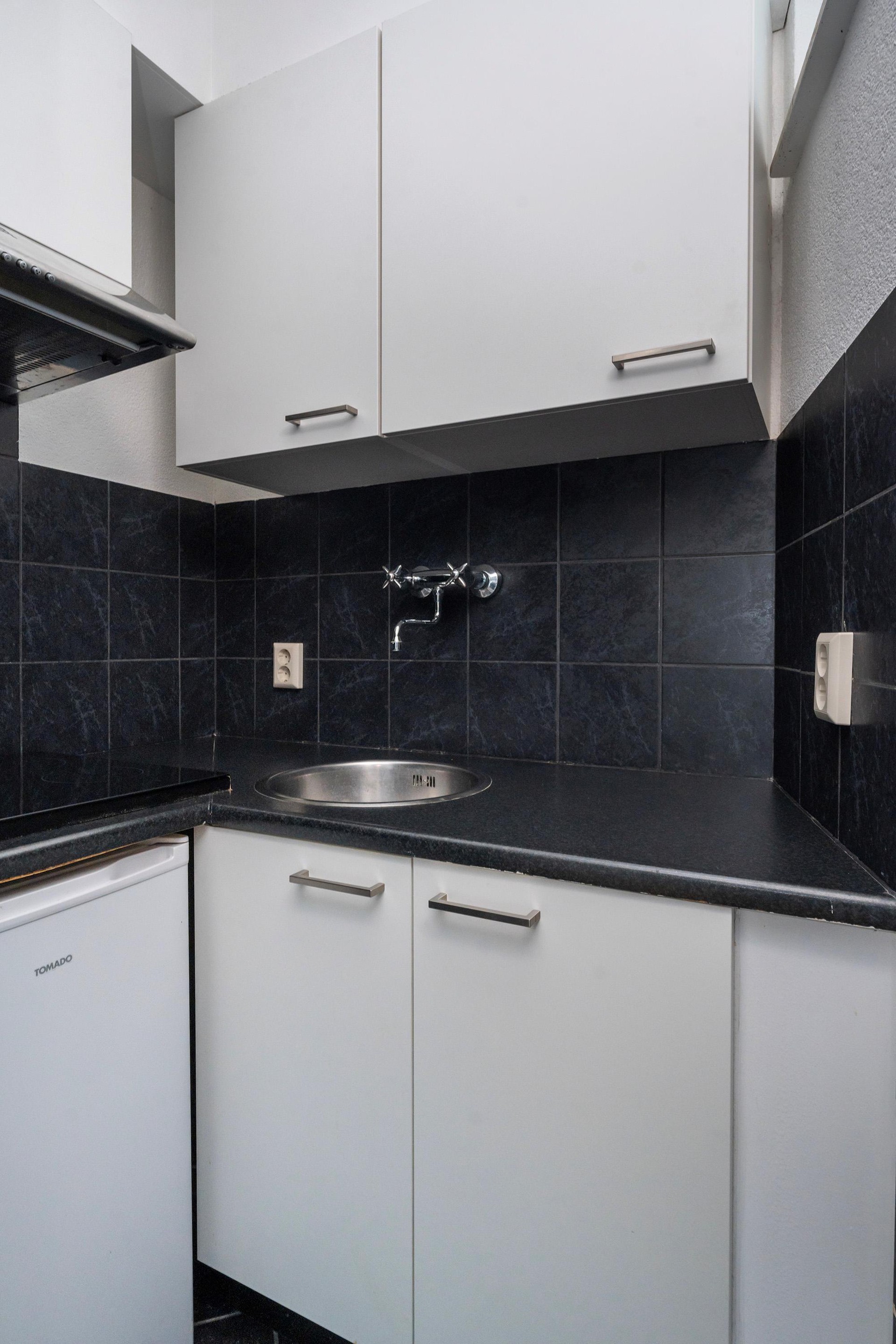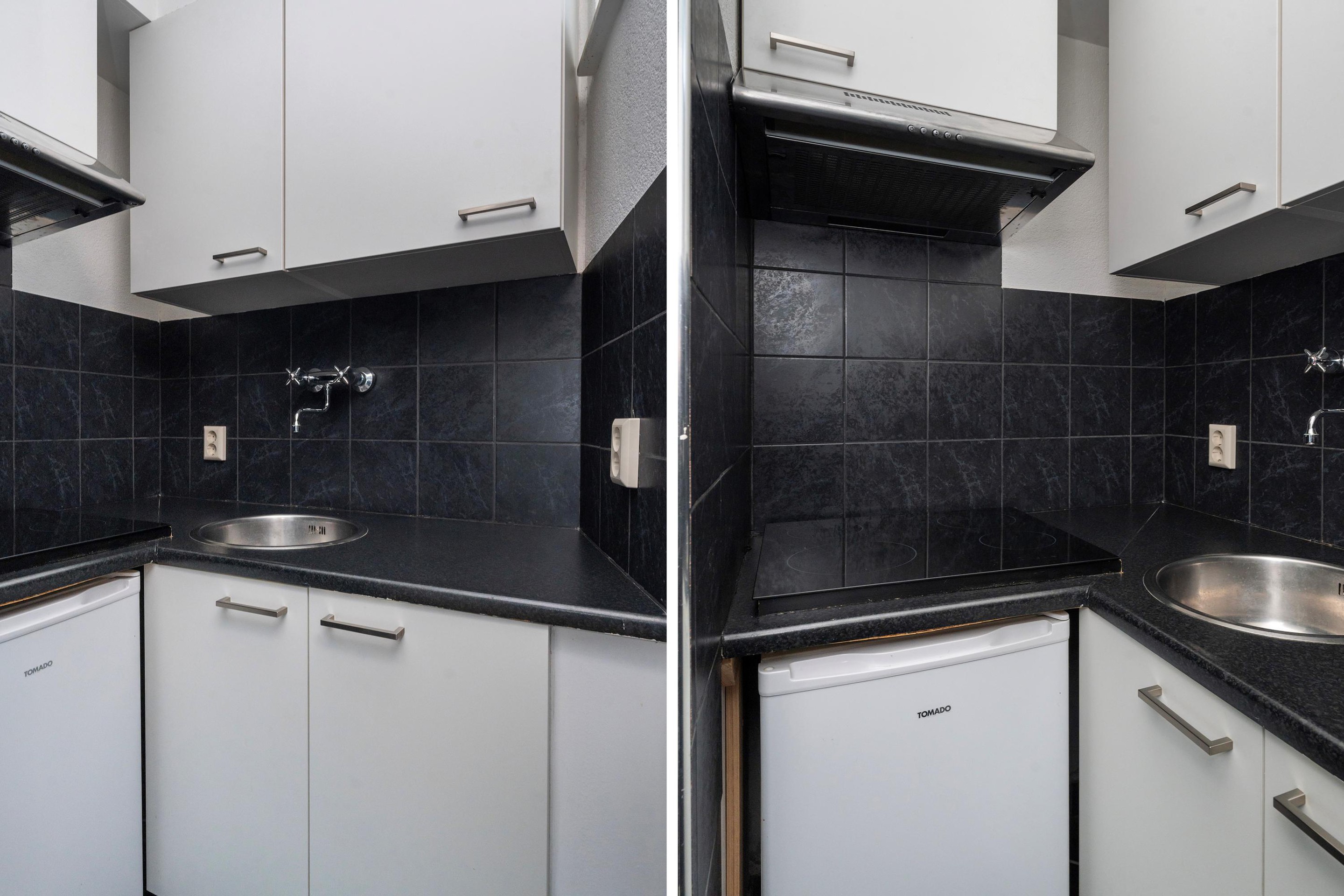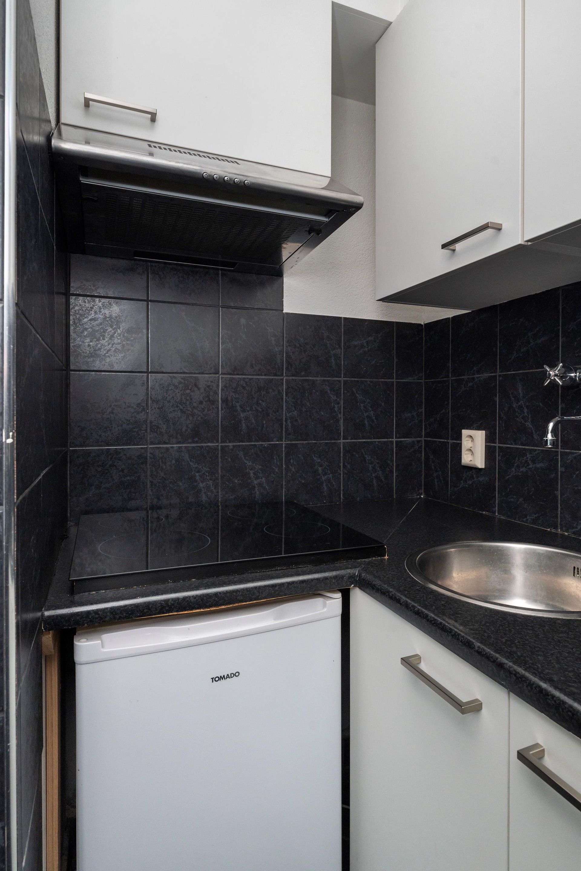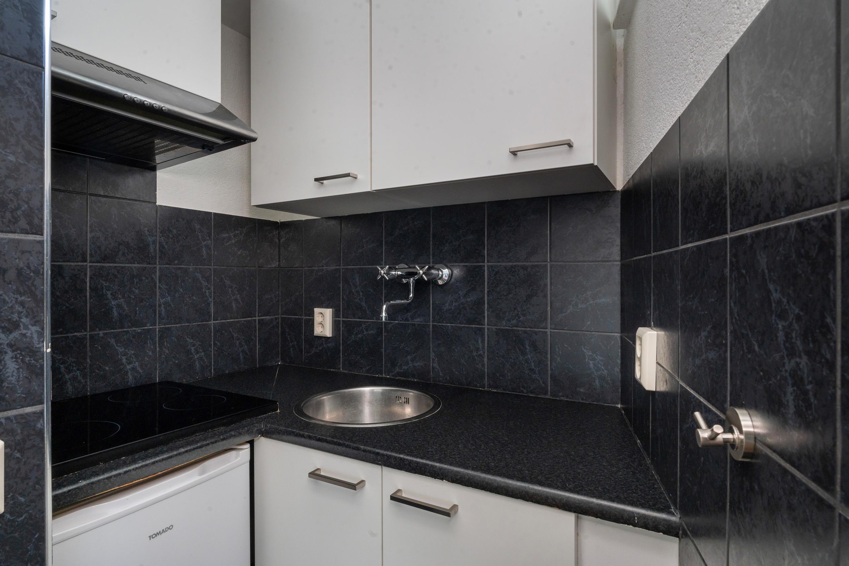 De kitchenette is netjes uitgevoerd in zwart/witte kleurstelling en voorzien van een kunststof werkblad, spoelbak, elektrische kookplaat, afzuigkap en een losse koelkast.