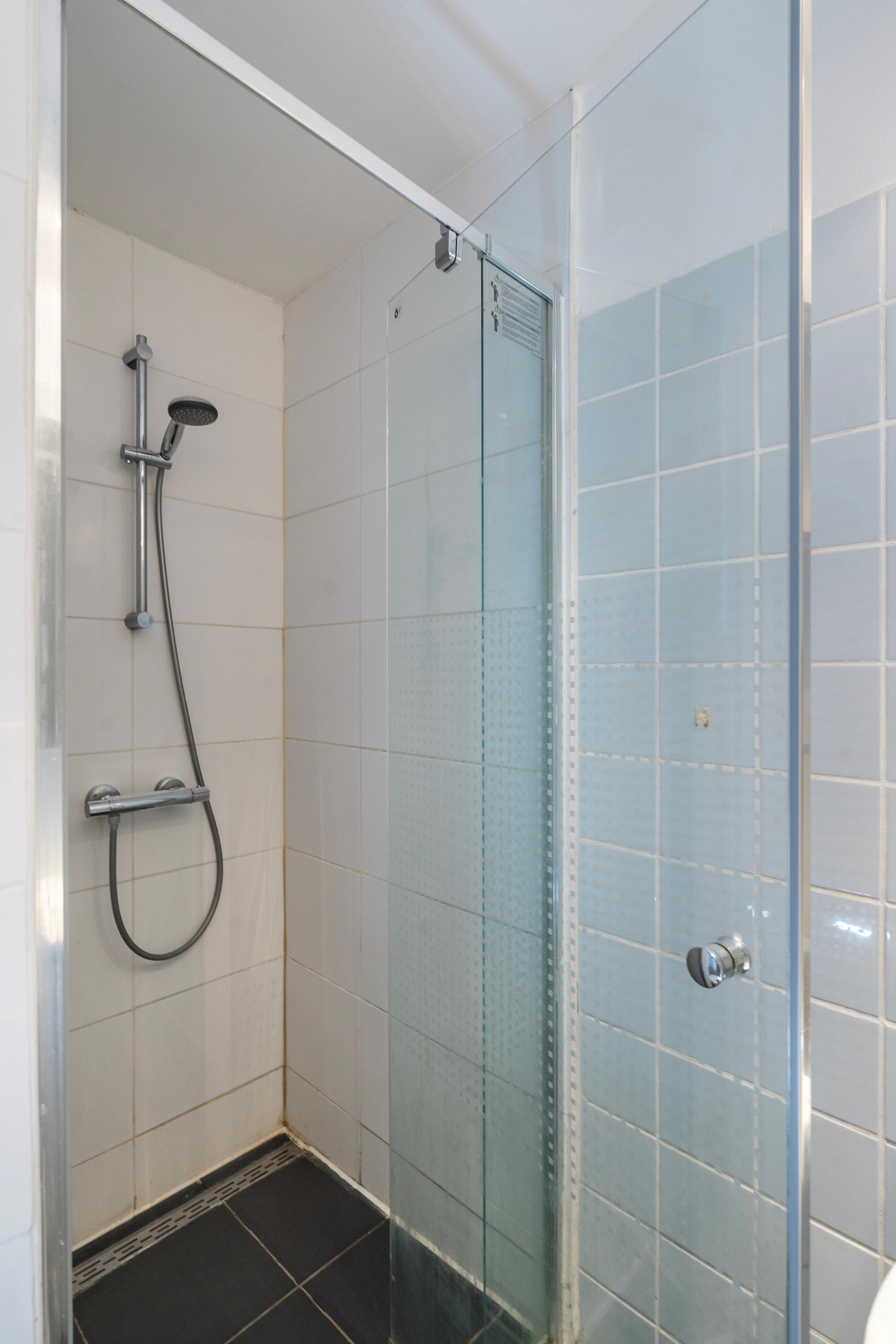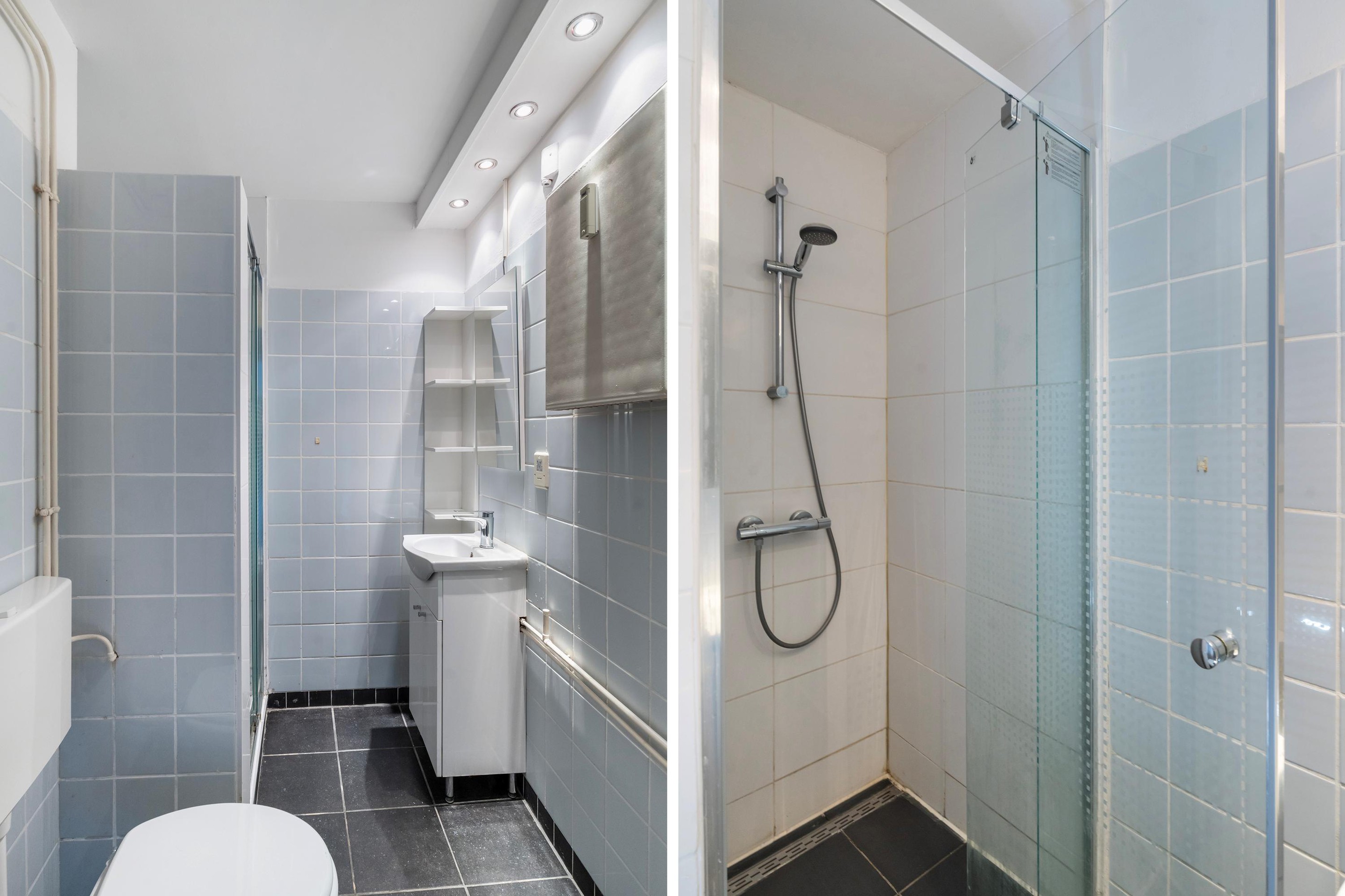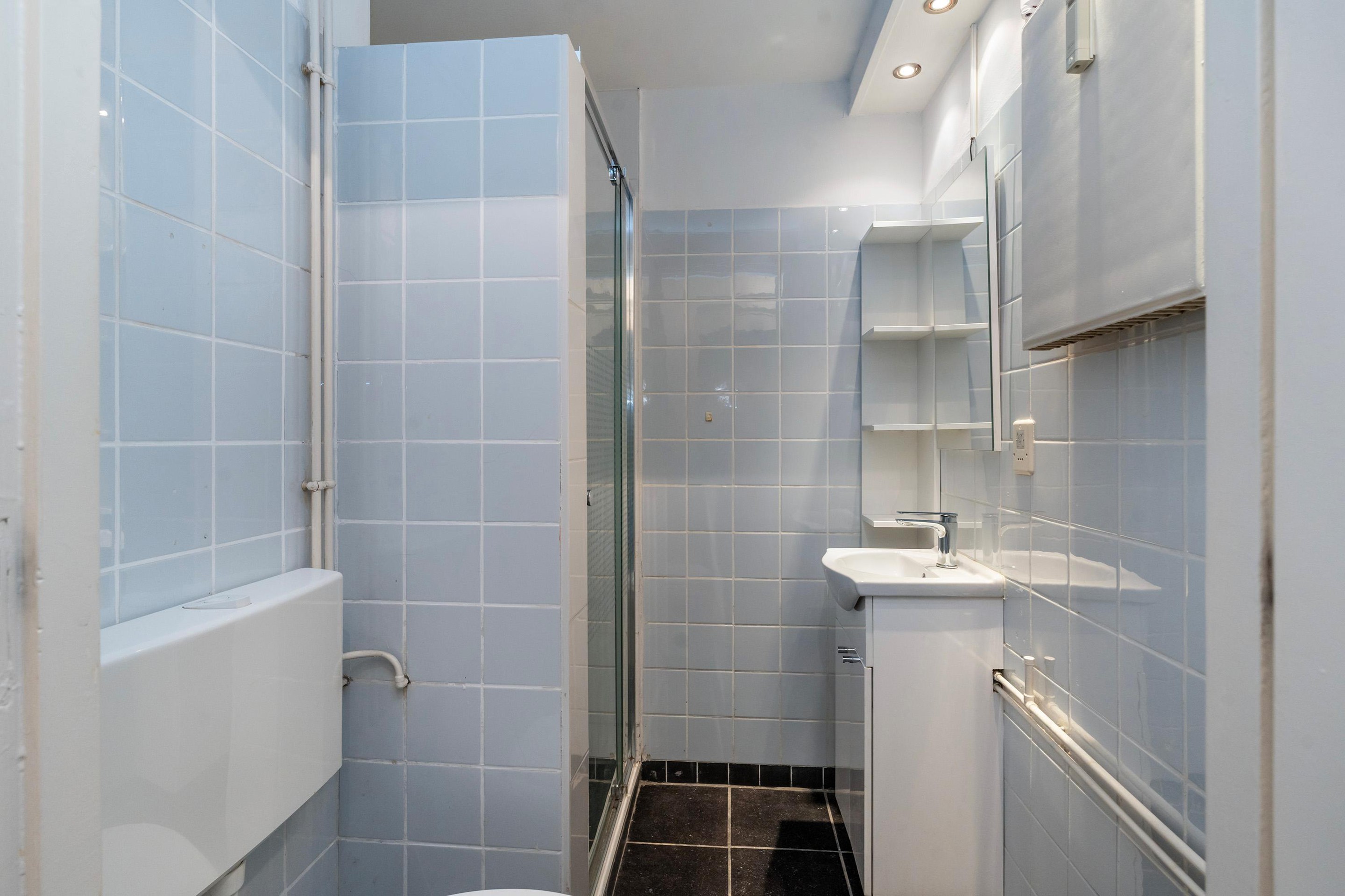 De slaapkamer is lekker ruim, ca. 13m2 groot en heeft 2 kunststof kozijnen. Er is voldoende ruimte voor een 2 persoons bed, een kledingkast en/of een bureau om lekker aan te werken. De badkamer is lichtblauw betegeld en voorzien van een doucheruimte, toilet en een wastafelmeubel.