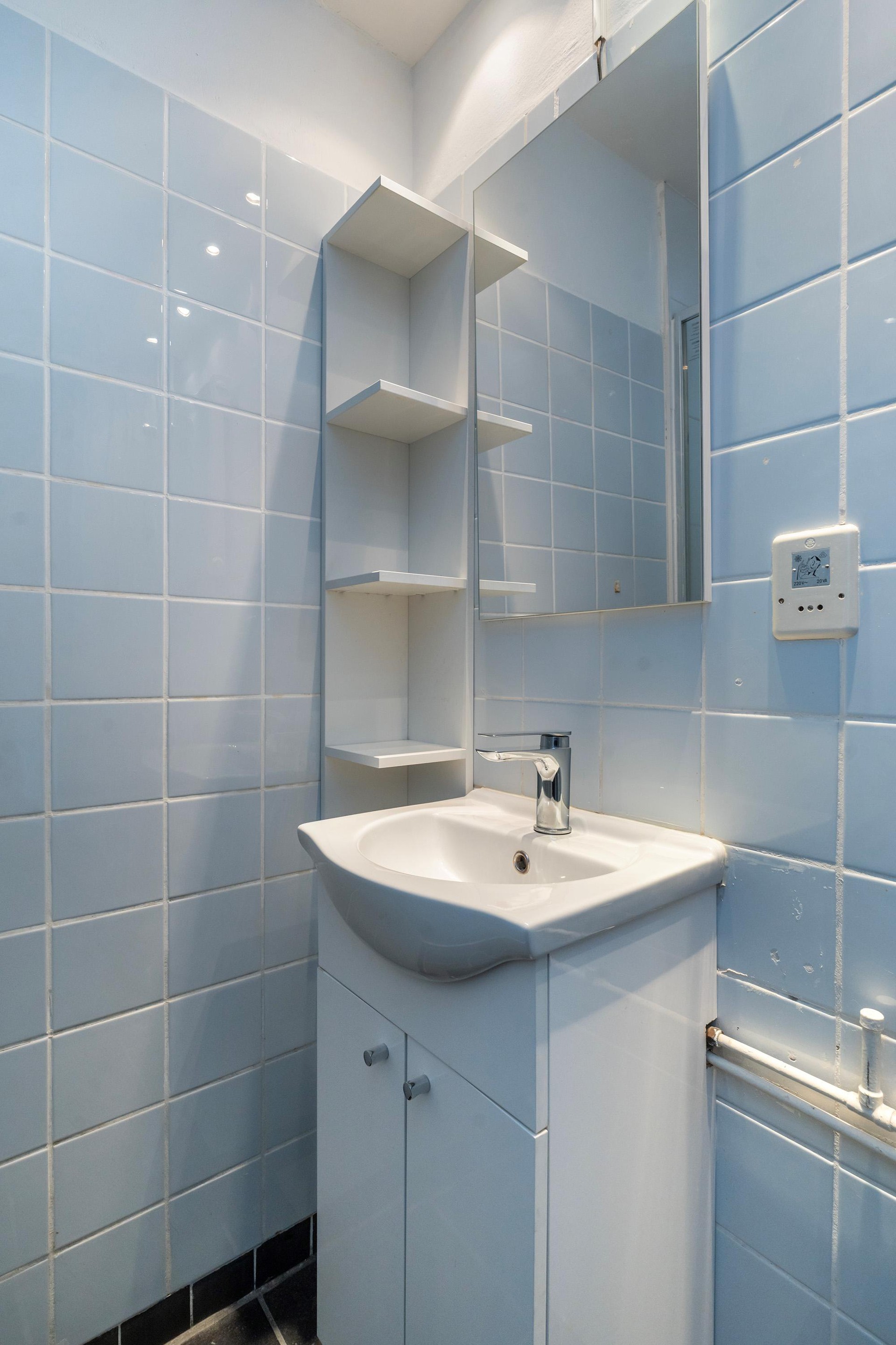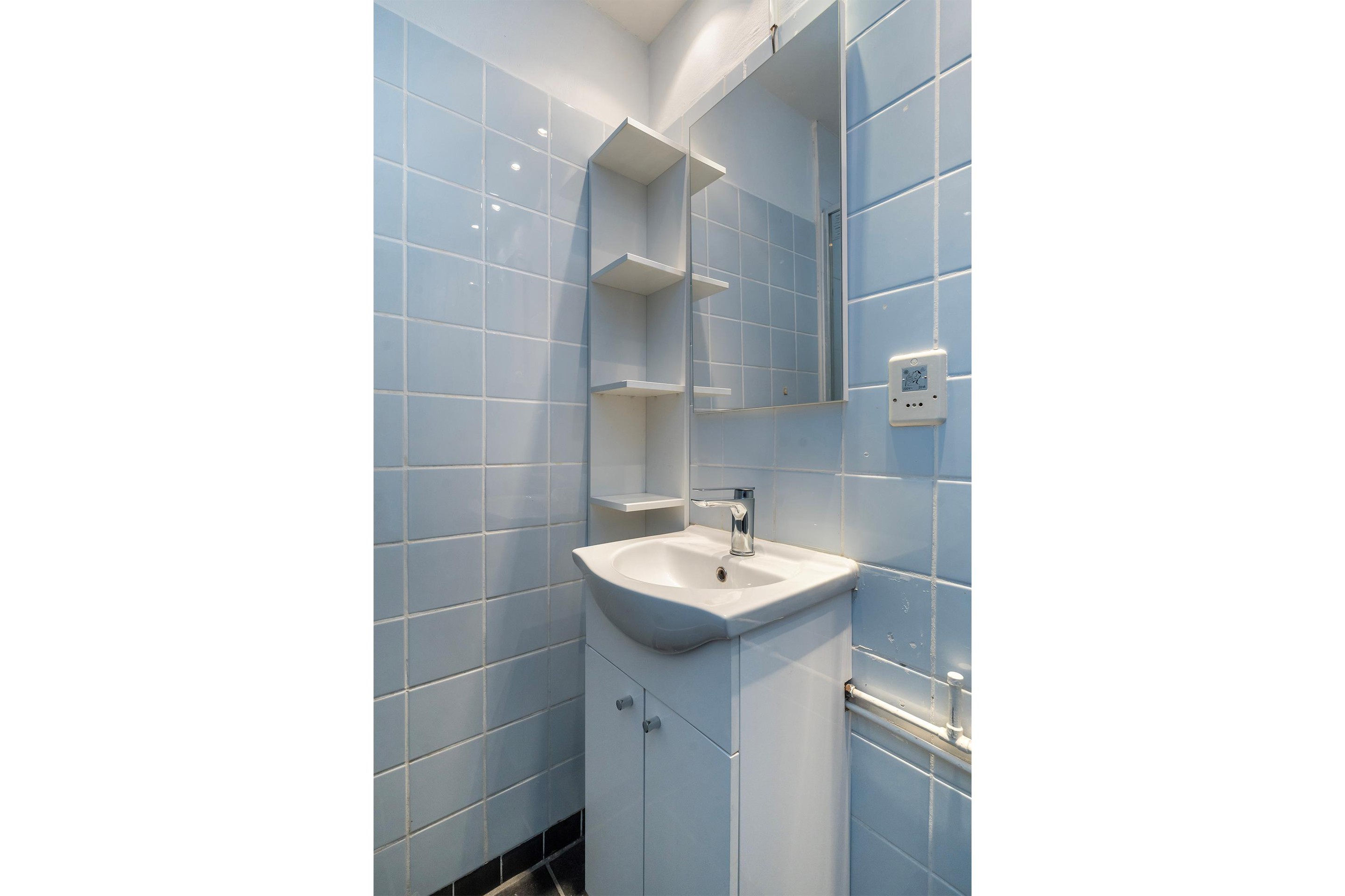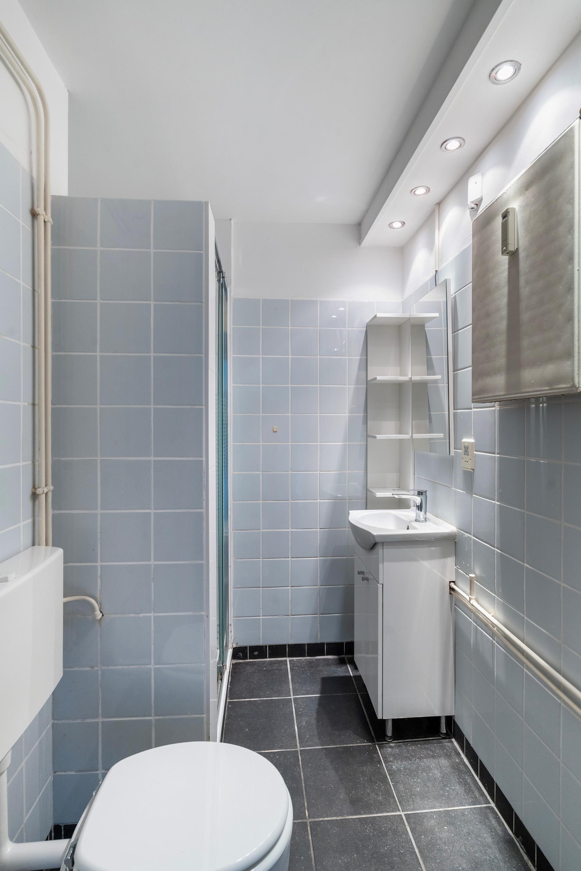De slaapkamer is lekker ruim, ca. 13m2 groot en heeft 2 kunststof kozijnen. Er is voldoende ruimte voor een 2 persoons bed, een kledingkast en/of een bureau om lekker aan te werken. De badkamer is lichtblauw betegeld en voorzien van een doucheruimte, toilet en een wastafelmeubel.