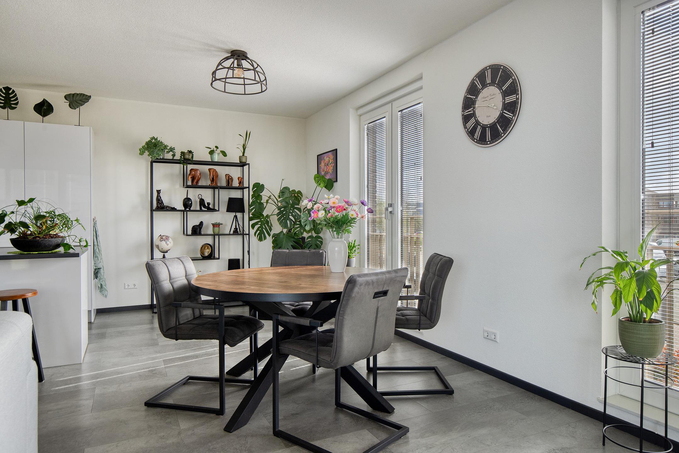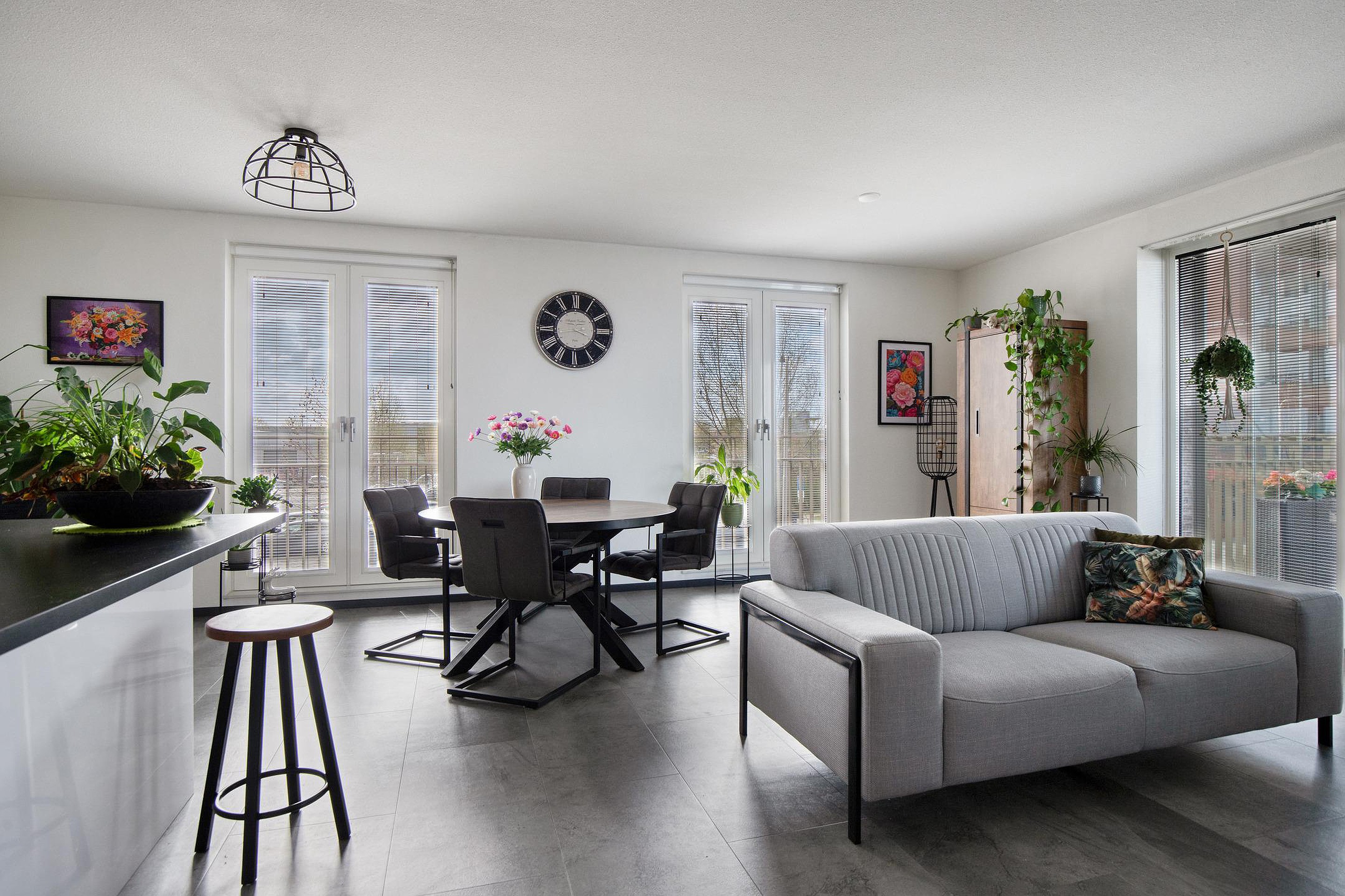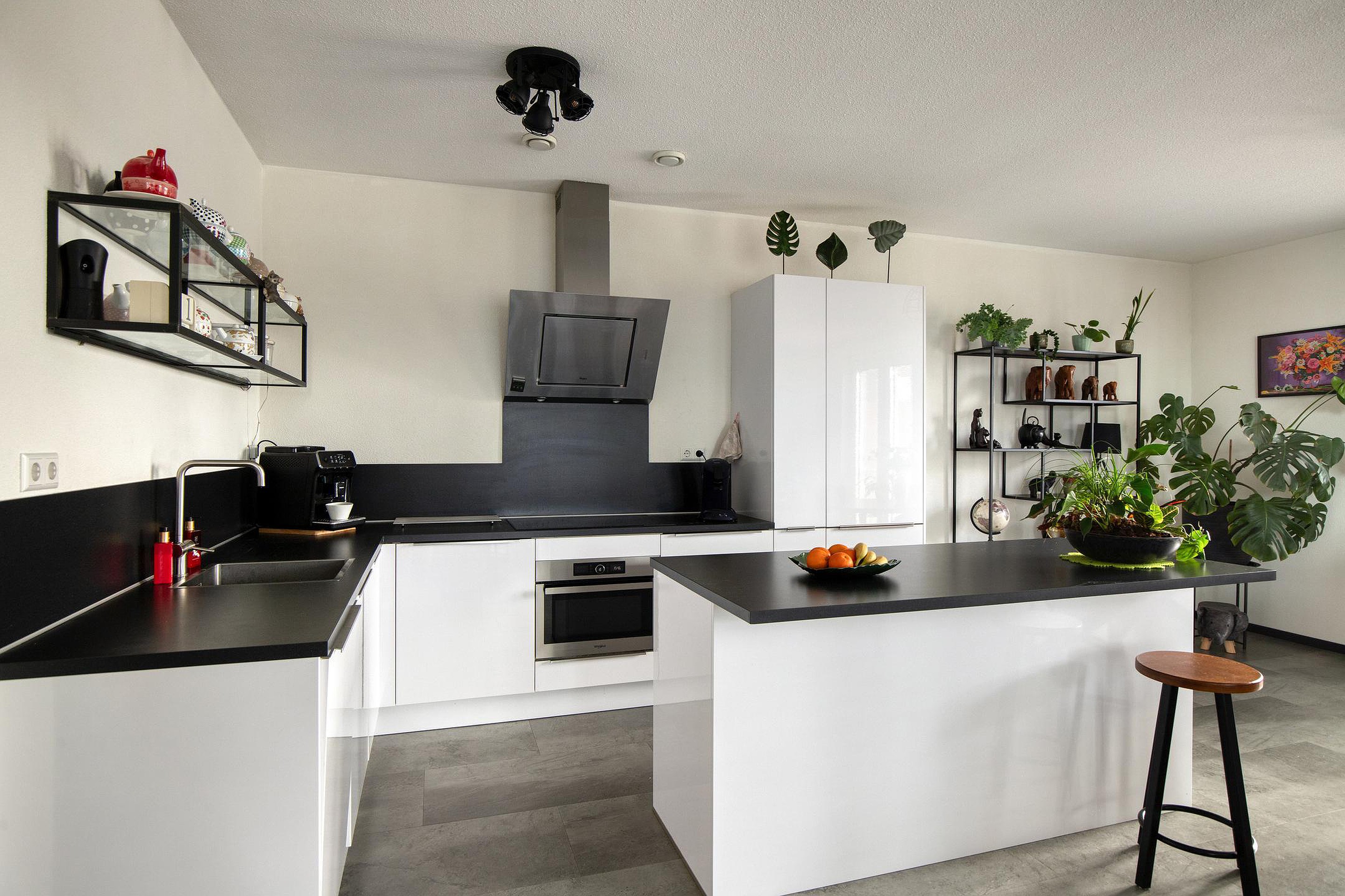 De woonkamer is licht, ruim en voelt direct comfortabel aan. Grote raampartijen en openslaande deuren naar het balkon zorgen voor een fijne connectie met buiten. De open keuken sluit hier naadloos op aan en is uitgevoerd in een moderne, tijdloze stijl met kookeiland—perfect voor wie houdt van koken én gezelligheid. Uiteraard voorzien van inbouwapparatuur en volop werkruimte.