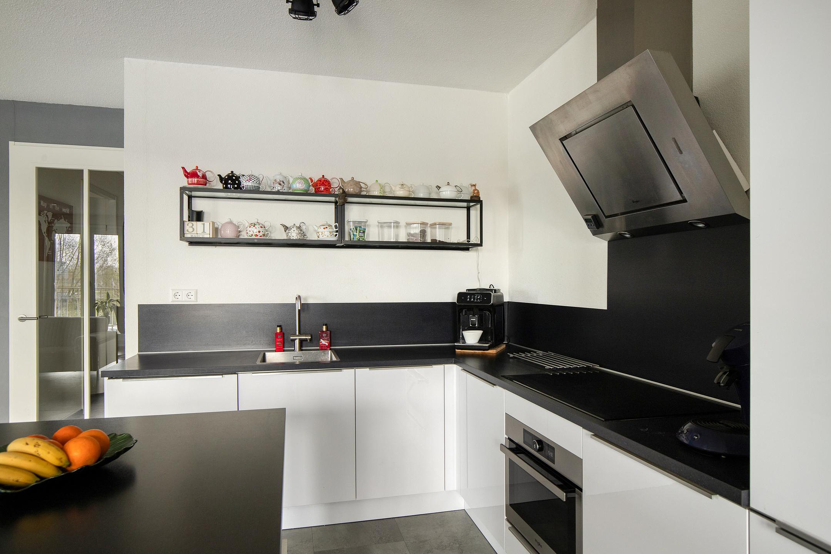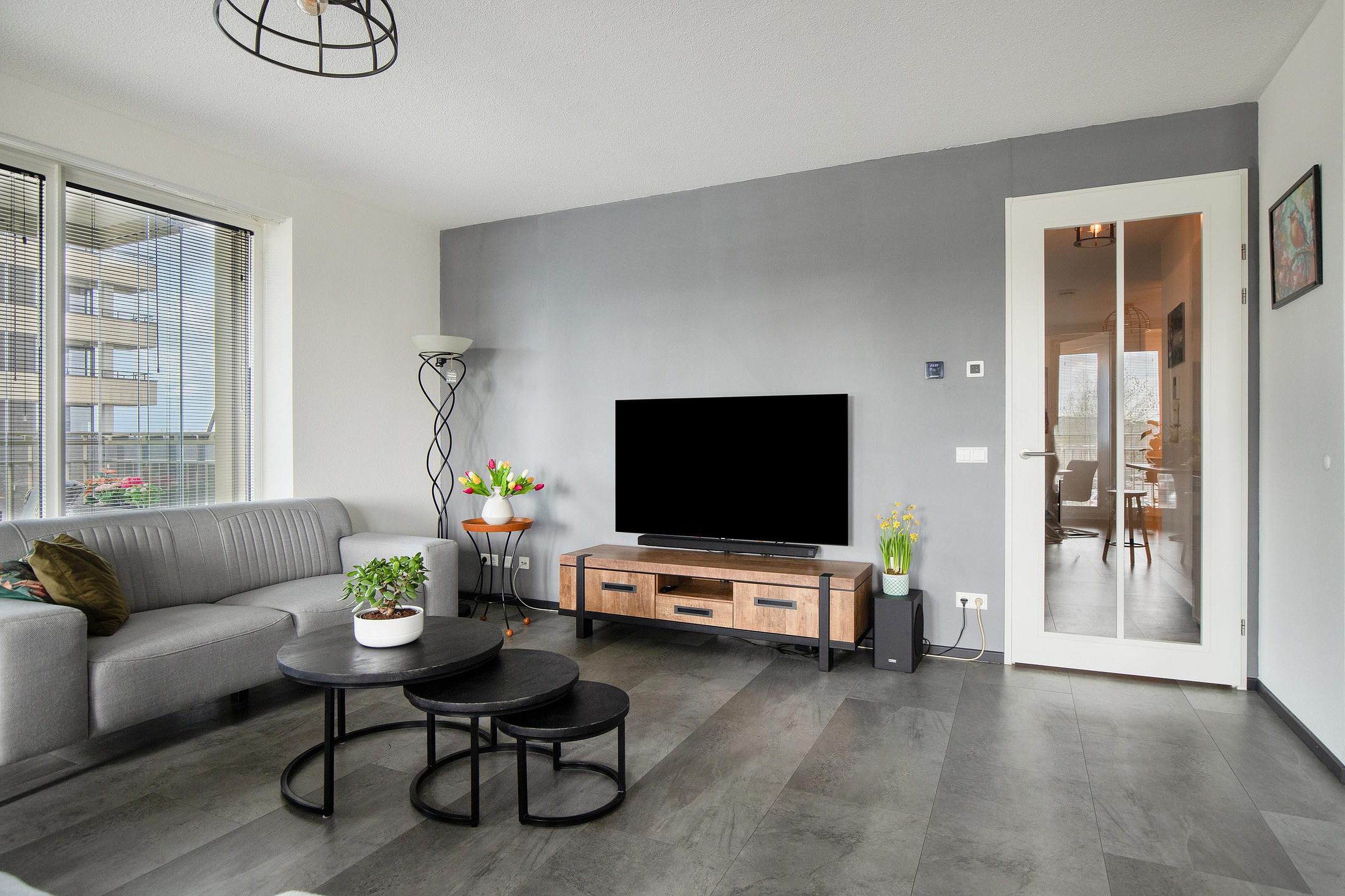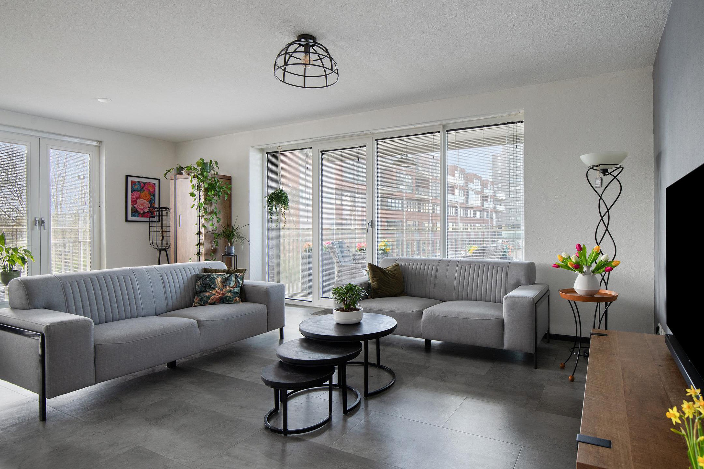 De woonkamer is licht, ruim en voelt direct comfortabel aan. Grote raampartijen en openslaande deuren naar het balkon zorgen voor een fijne connectie met buiten. De open keuken sluit hier naadloos op aan en is uitgevoerd in een moderne, tijdloze stijl met kookeiland—perfect voor wie houdt van koken én gezelligheid. Uiteraard voorzien van inbouwapparatuur en volop werkruimte.