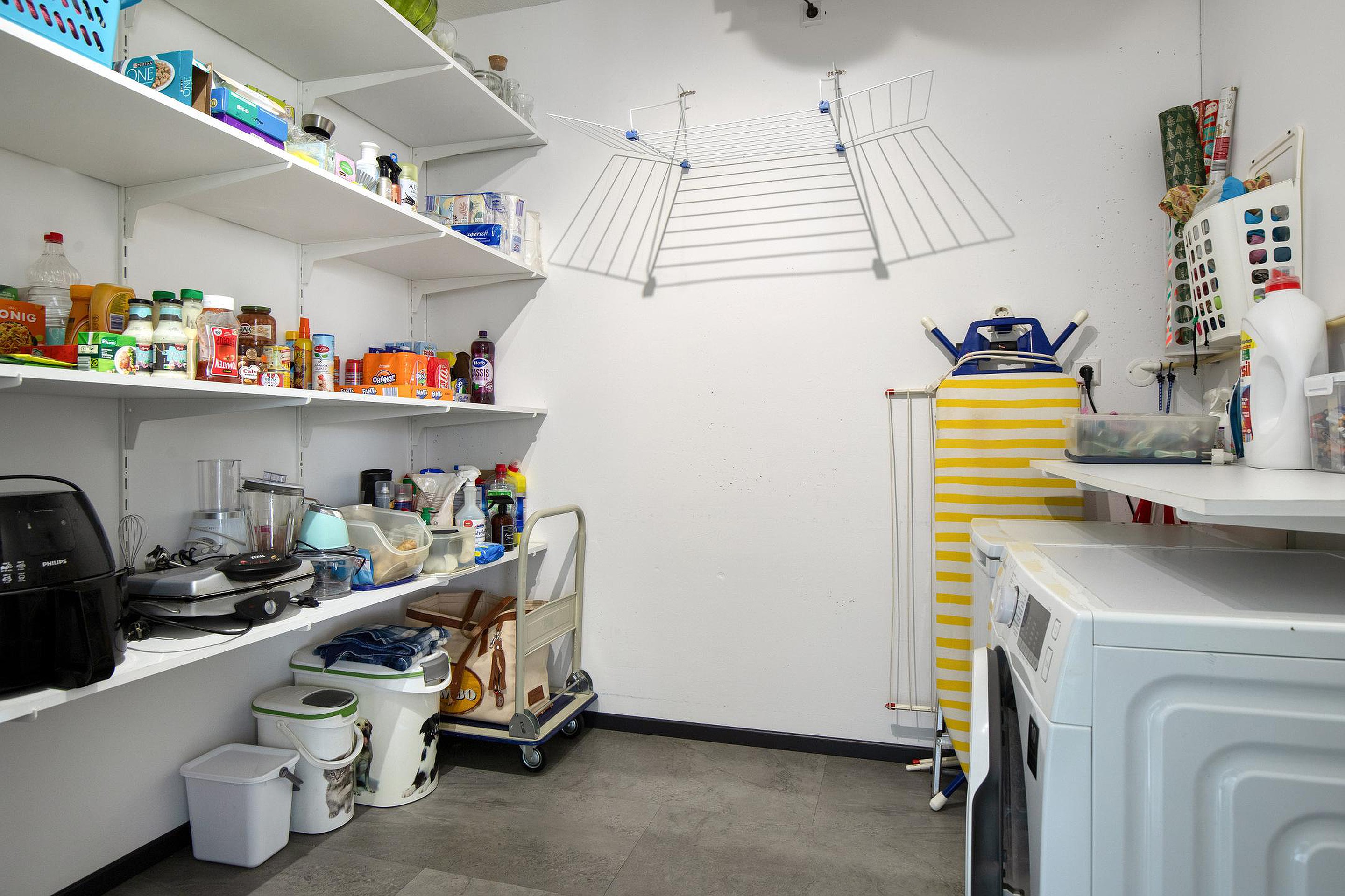 Ruime bijkeuken met praktische planken, aansluiting wasapparatuur, combiketel en mechanische ventilatie.