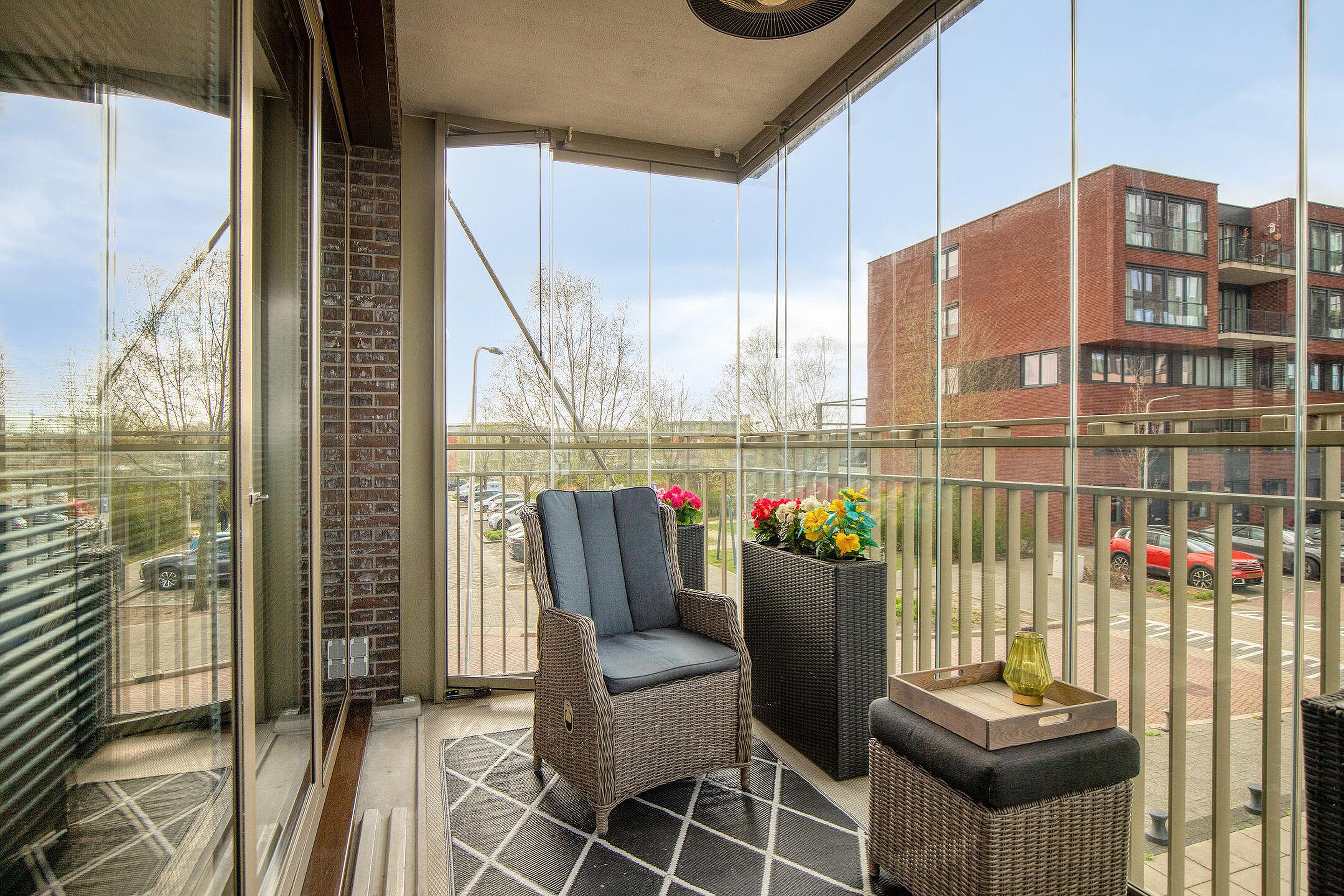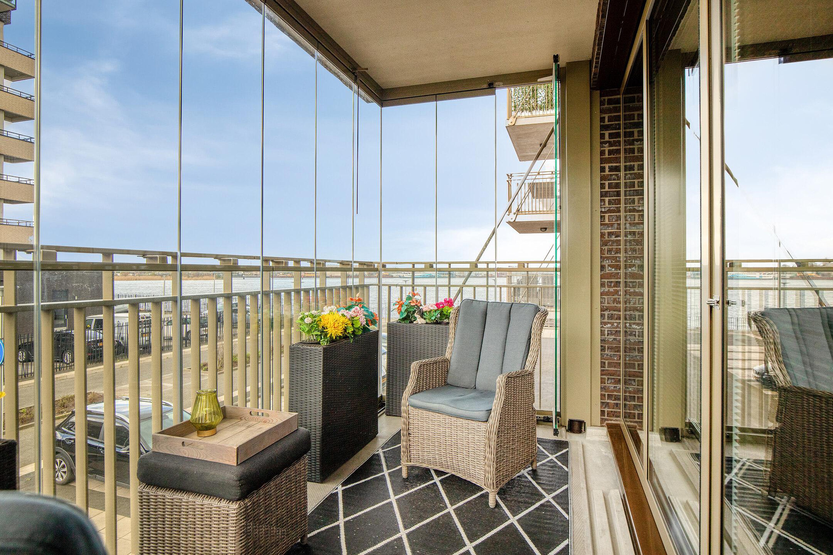 Het balkon is lekker ruim, biedt zicht op het water en is volledig afsluitbaar middels glazen vouwwand.