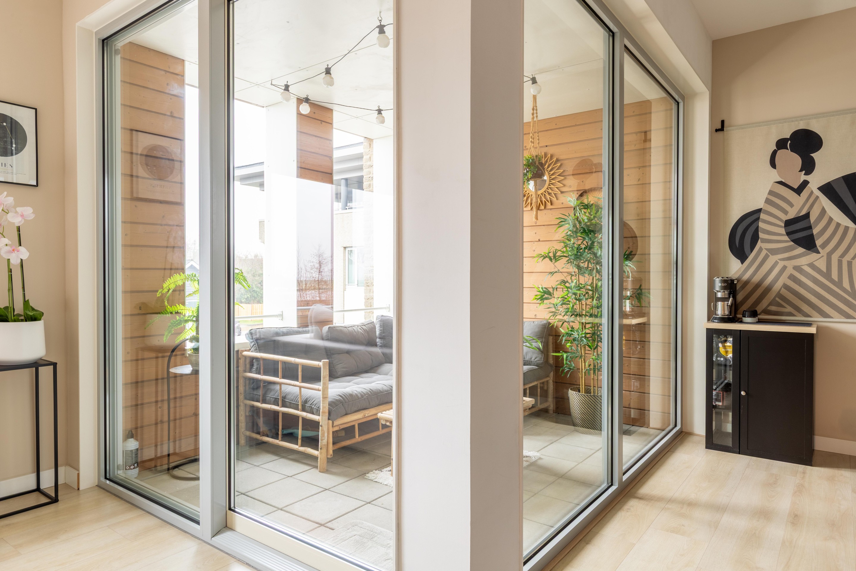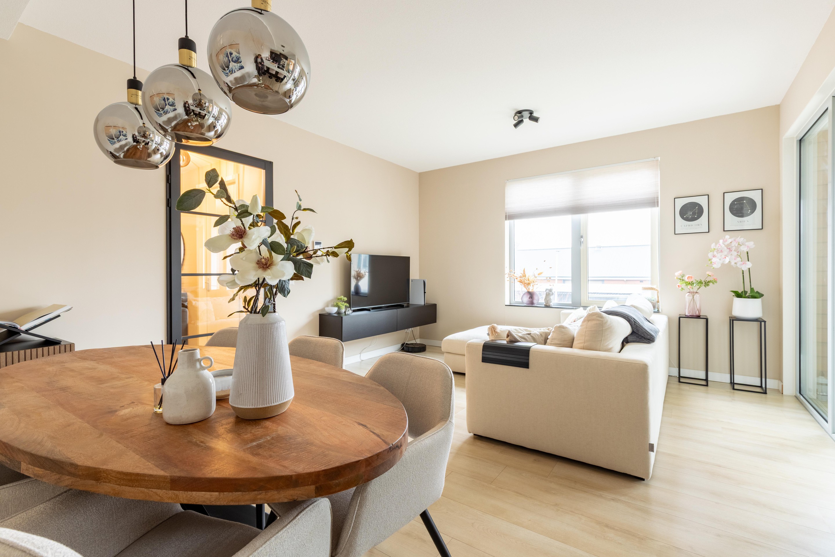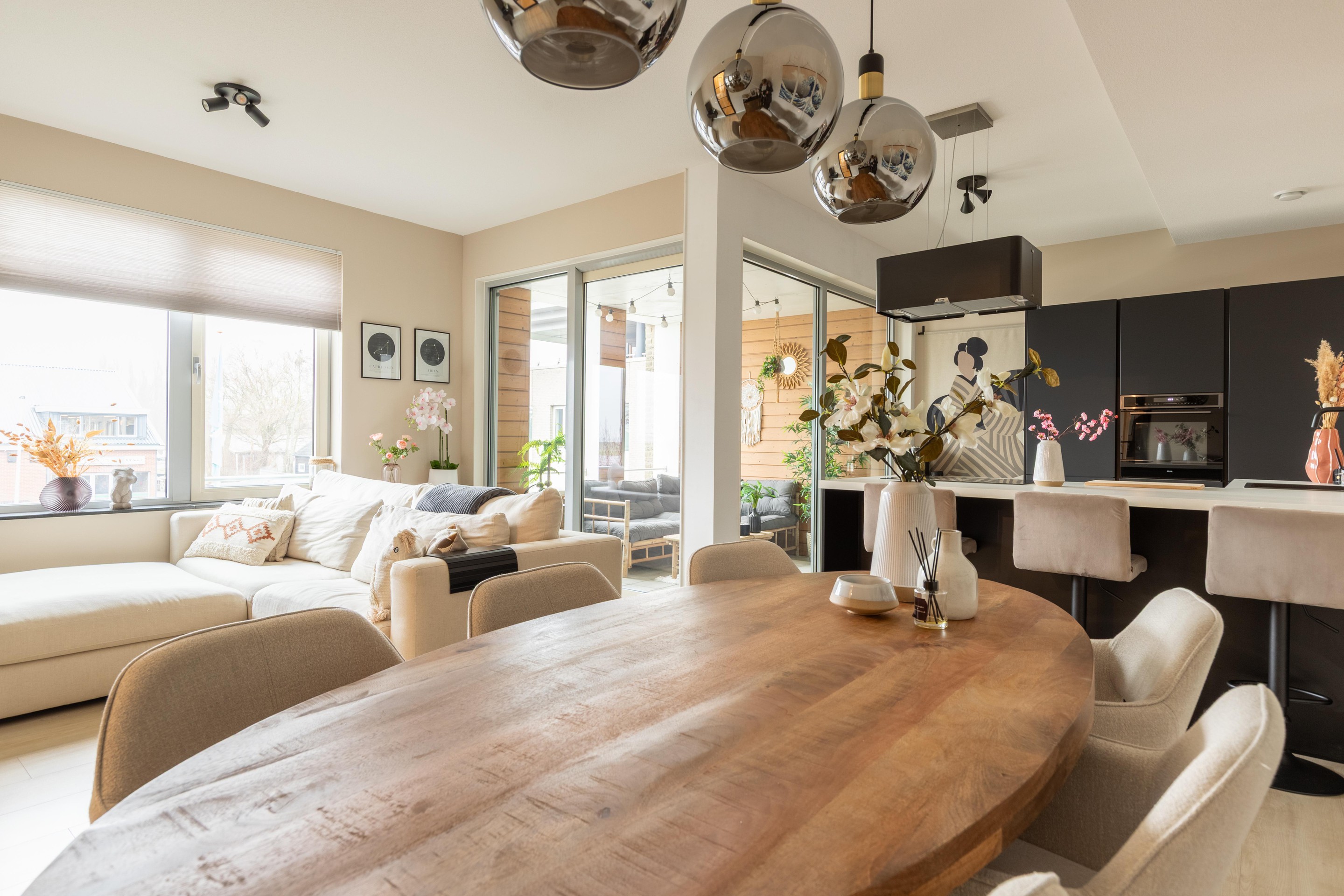 De ruime woonkamer aan de voorzijde van de woning kenmerkt zich door de moderne afwerking. De luxe open keuken is van alle gemakken voorzien en sluit naadloos aan op de leefruimte, waardoor een fijne plek is ontstaan om te koken en te ontspannen. Vanuit de woonkamer heeft u bovendien toegang tot het inpandige balkon, waar u in alle rust kunt genieten van het uitzicht en de buitenlucht.