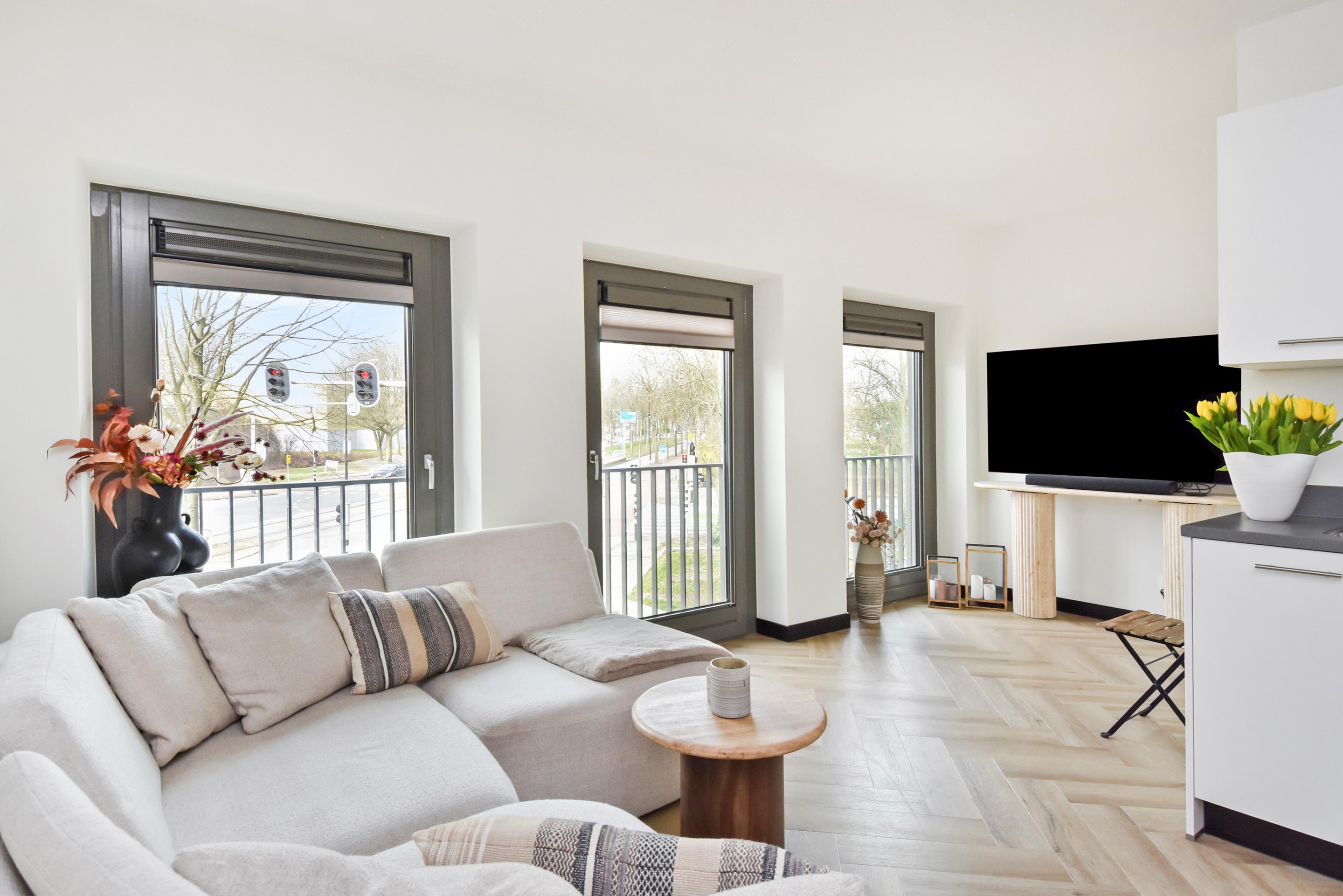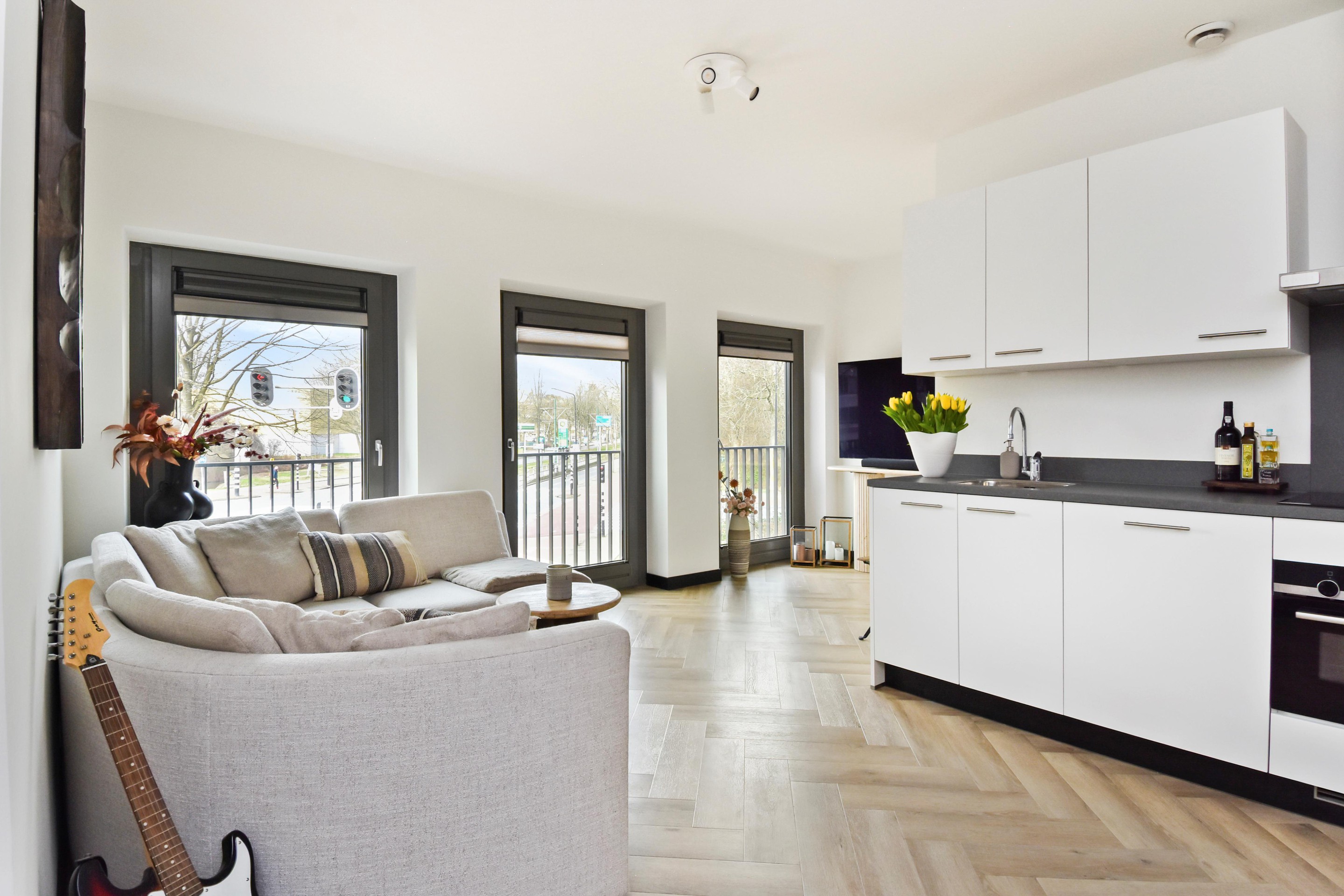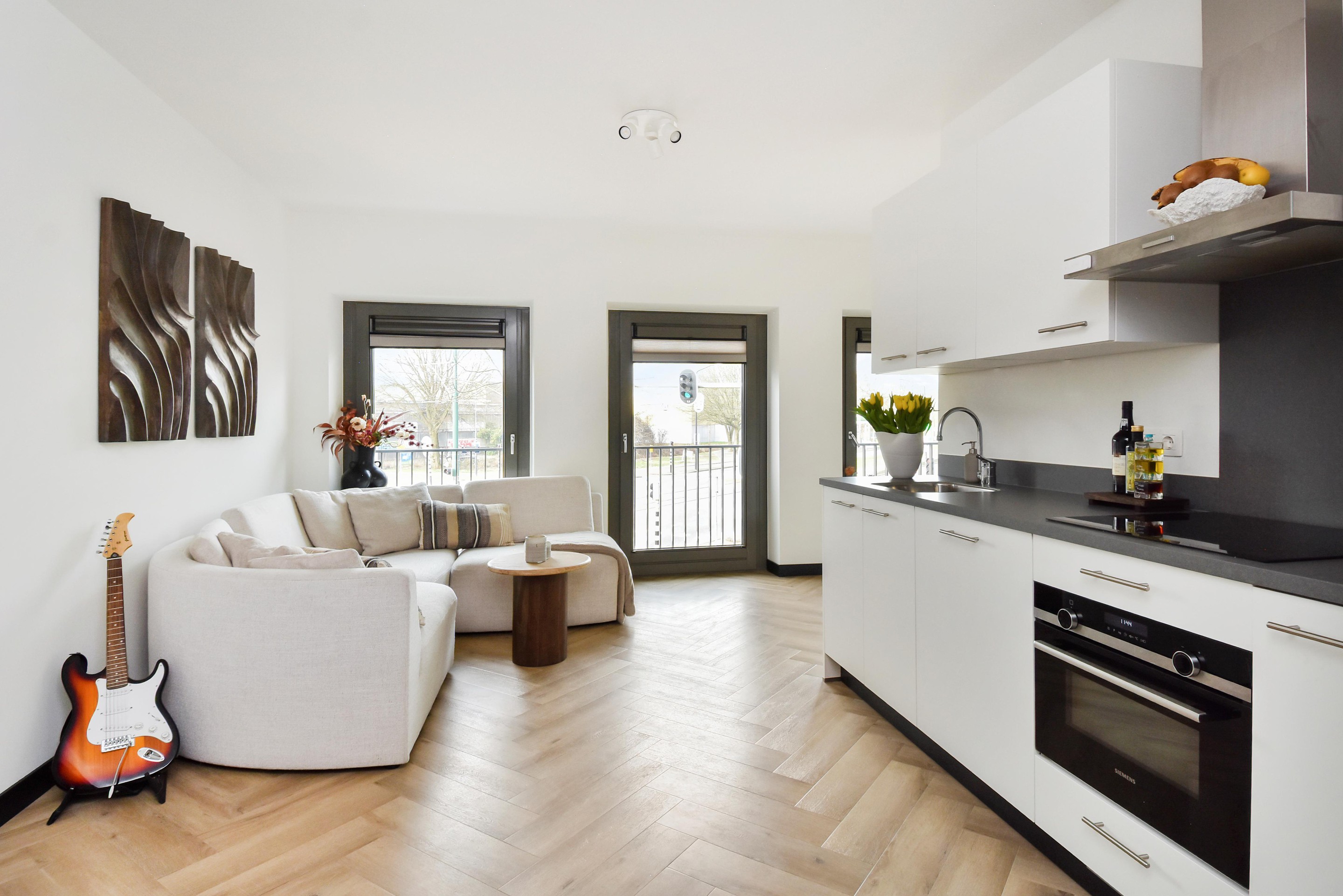 De lichte woonkamer is strak afgewerkt en beschikt over grote raampartijen die zorgen voor veel daglicht en een ruimtelijk gevoel. De open keuken heeft een moderne uitstraling en is uitgerust met diverse inbouwapparatuur, waaronder een koelkast, Siemens combi-oven, inductiekookplaat en vaatwasser.
