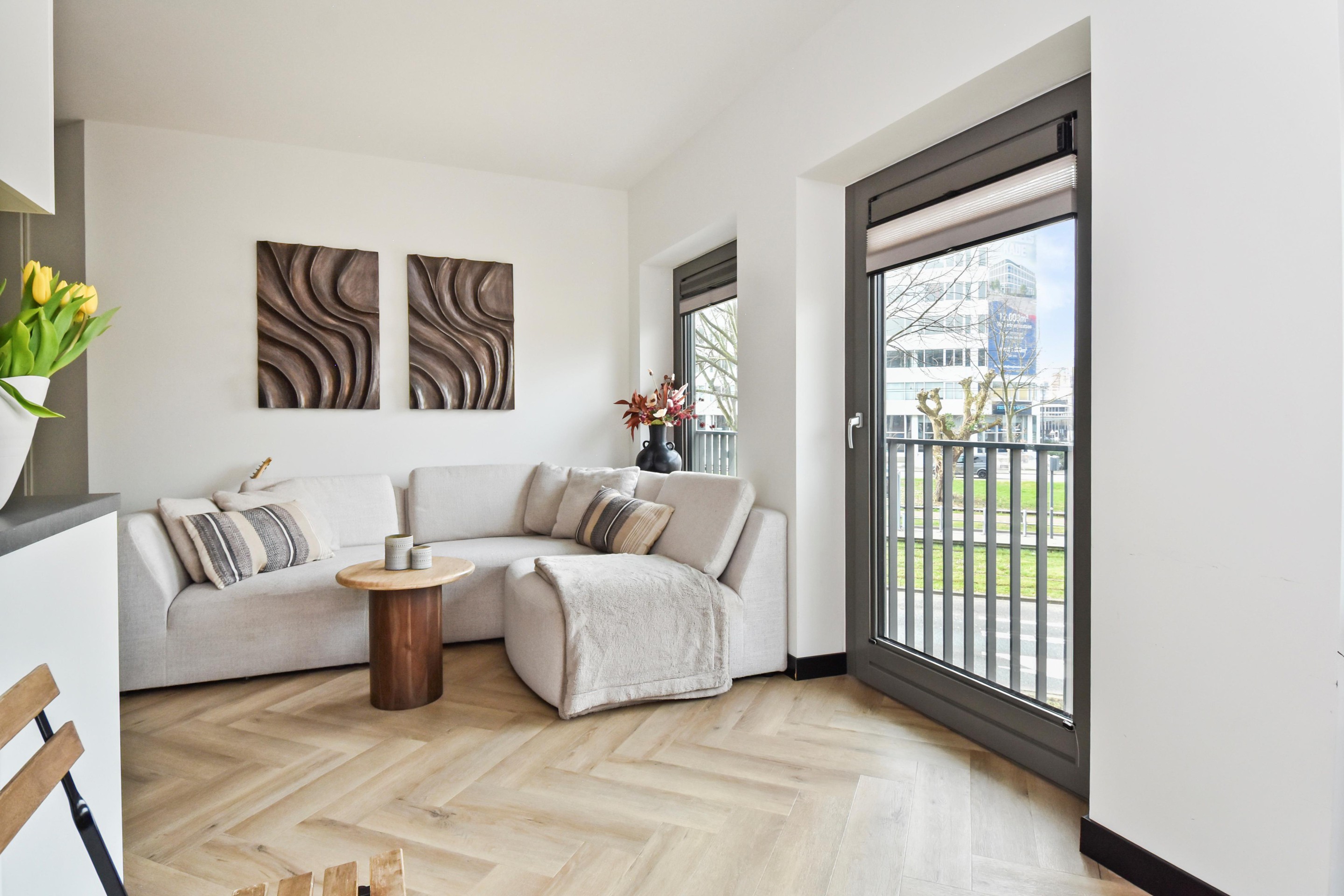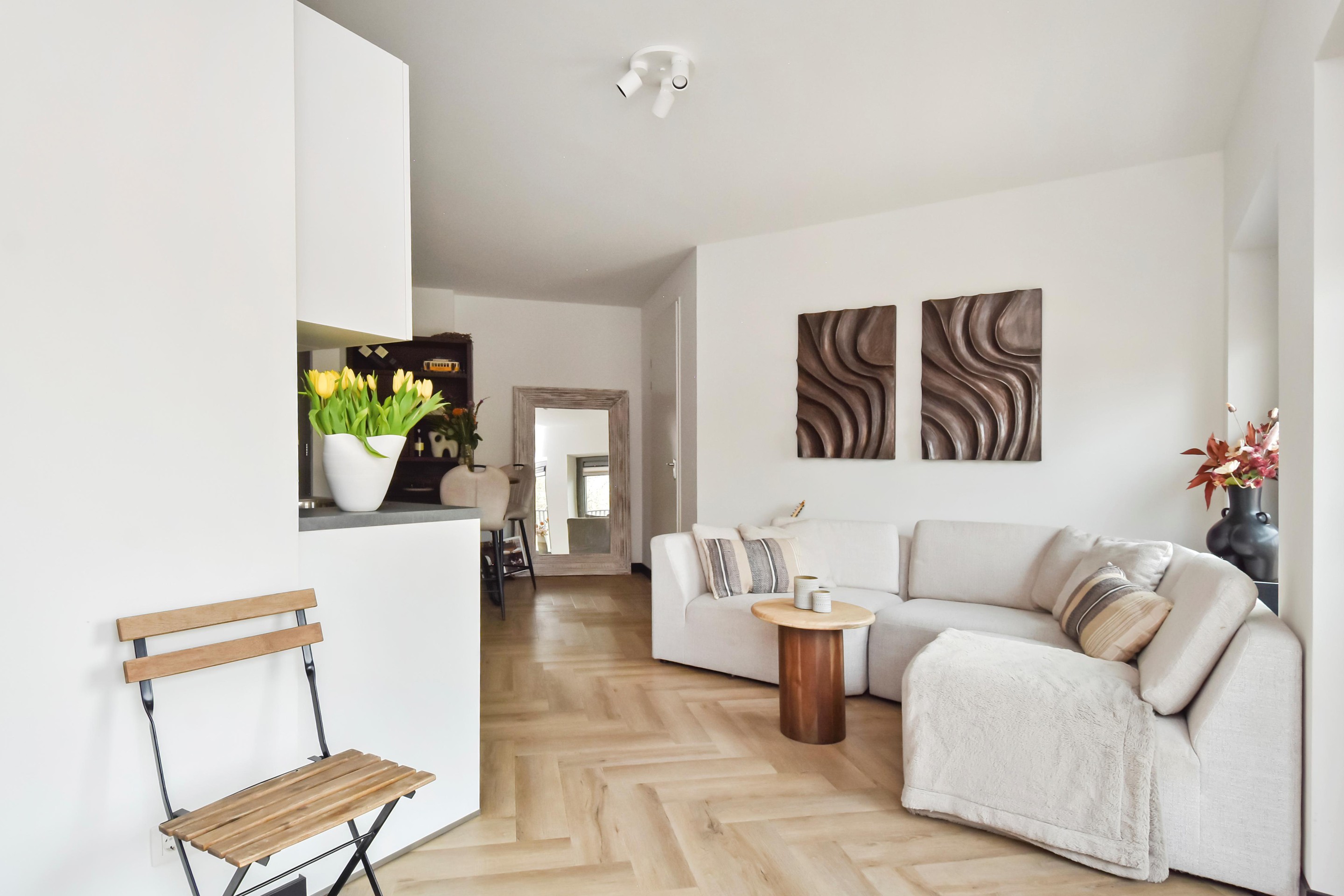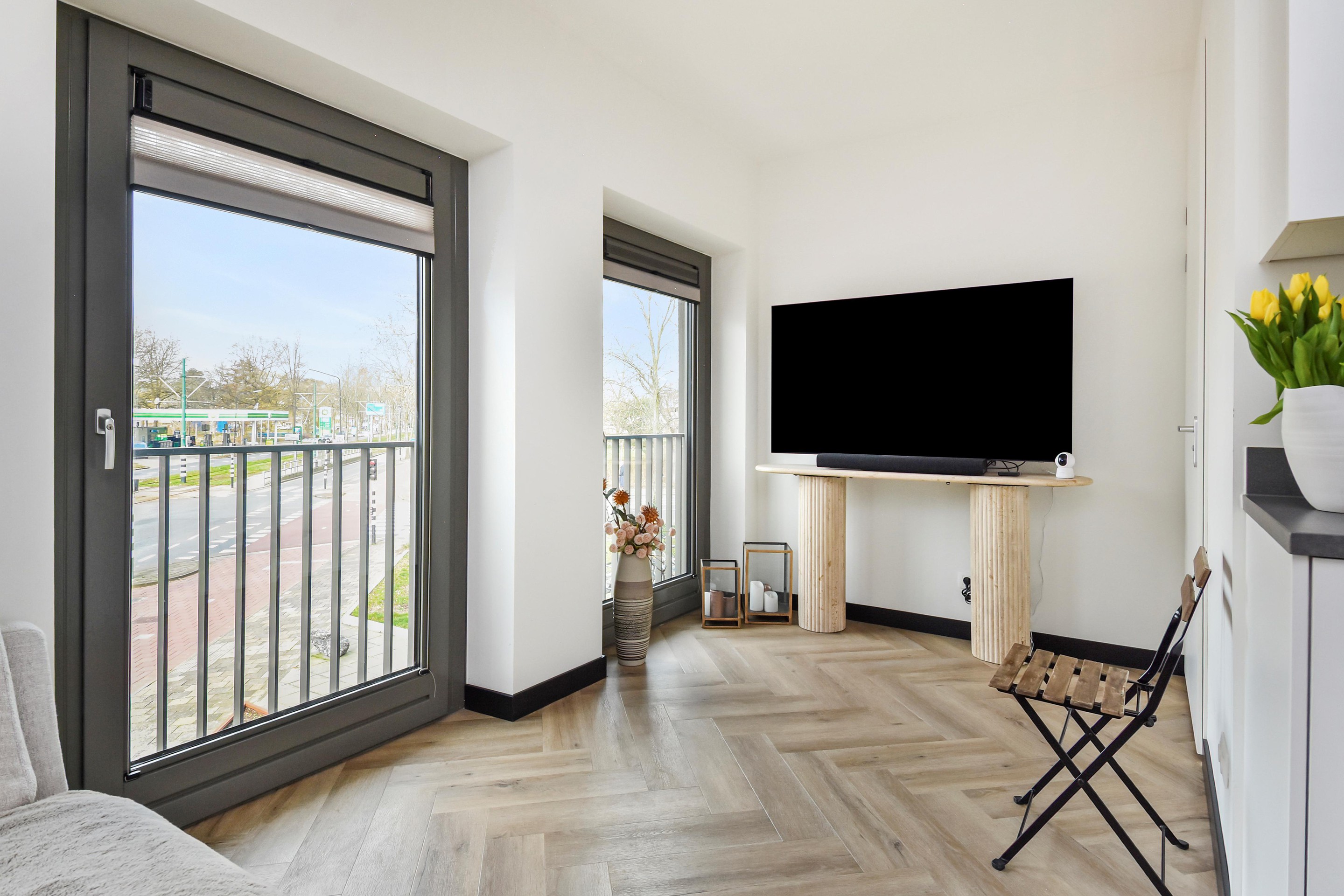 De lichte woonkamer is strak afgewerkt en beschikt over grote raampartijen die zorgen voor veel daglicht en een ruimtelijk gevoel. De open keuken heeft een moderne uitstraling en is uitgerust met diverse inbouwapparatuur, waaronder een koelkast, Siemens combi-oven, inductiekookplaat en vaatwasser.