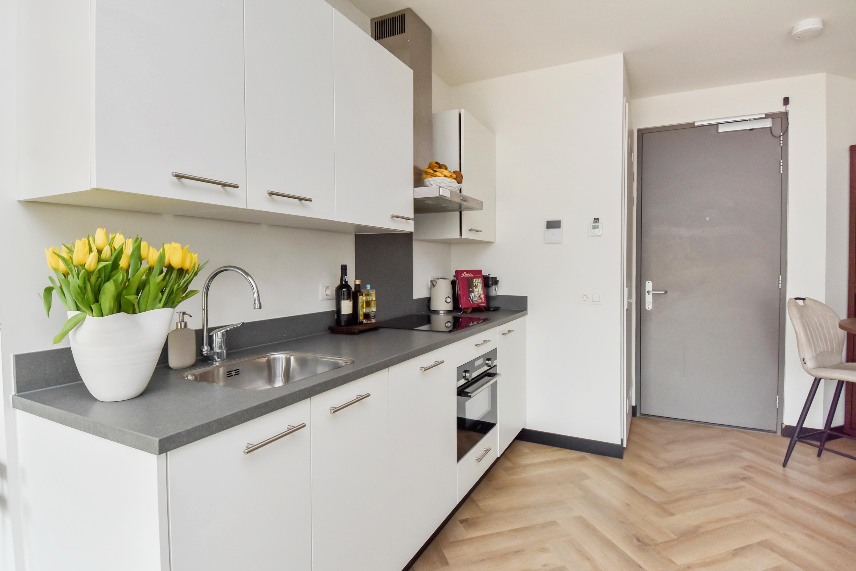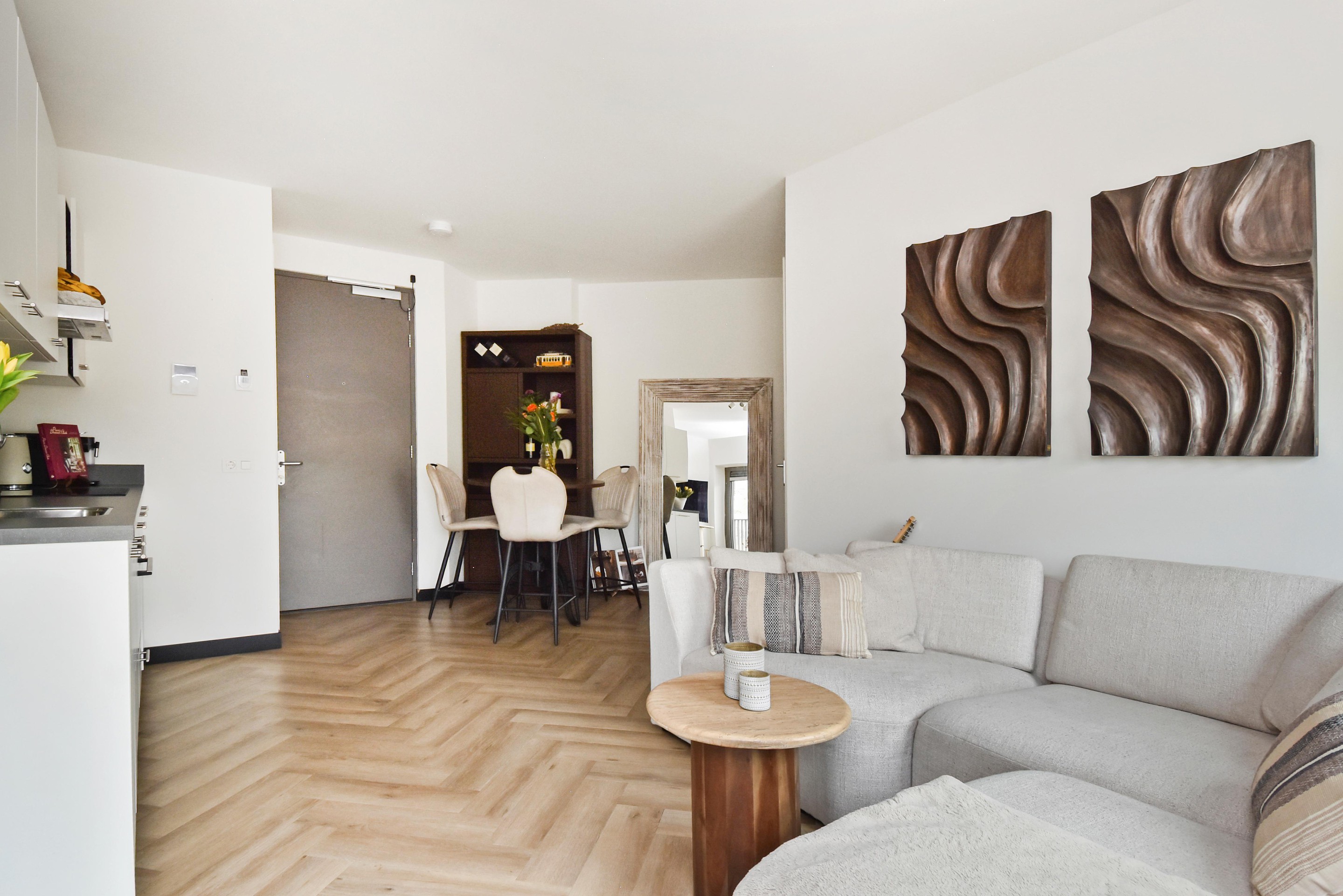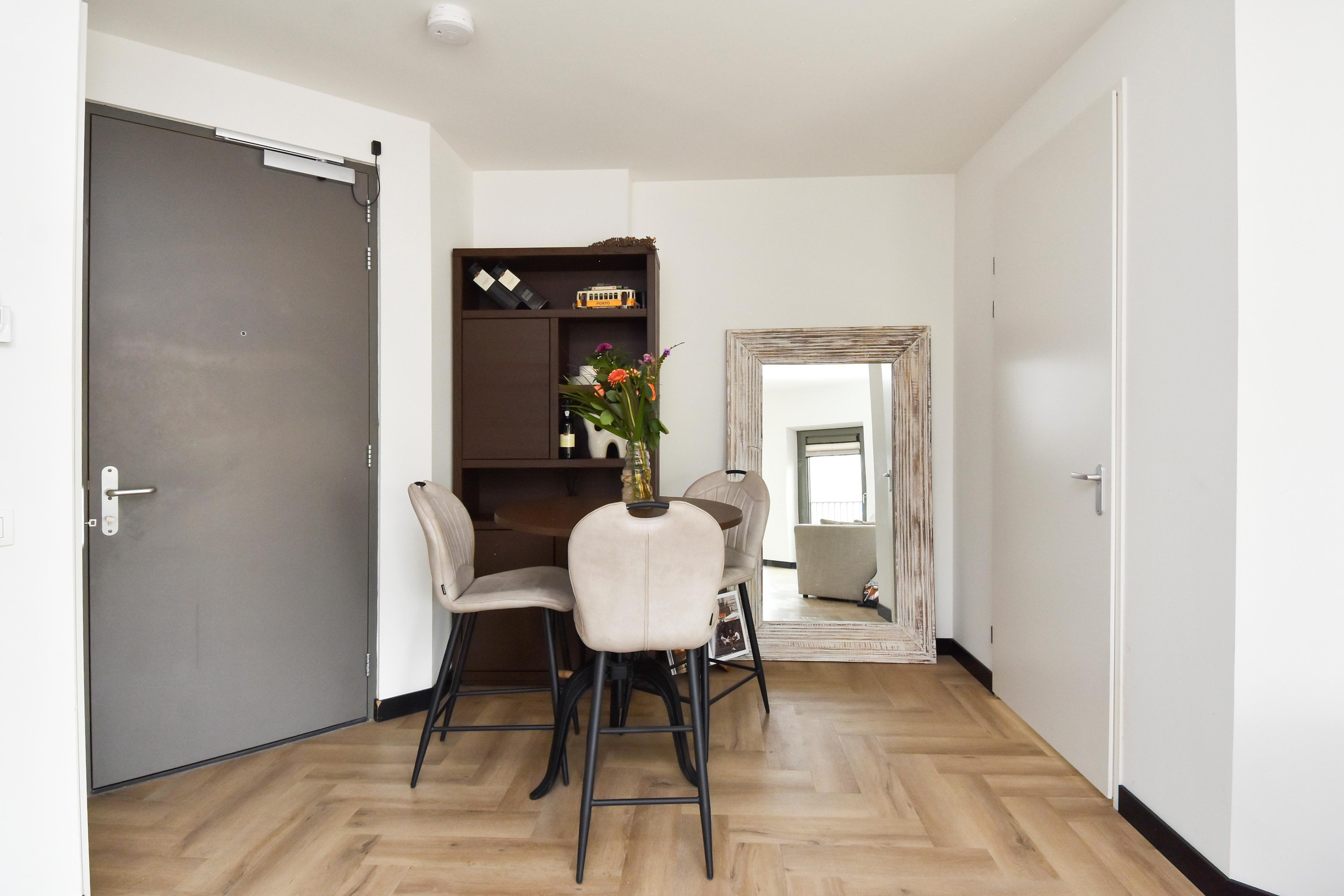 Entree van het appartement met een stijlvolle visgraat PVC-vloer, perfect in combinatie met de aanwezige vloerverwarming en -koeling.