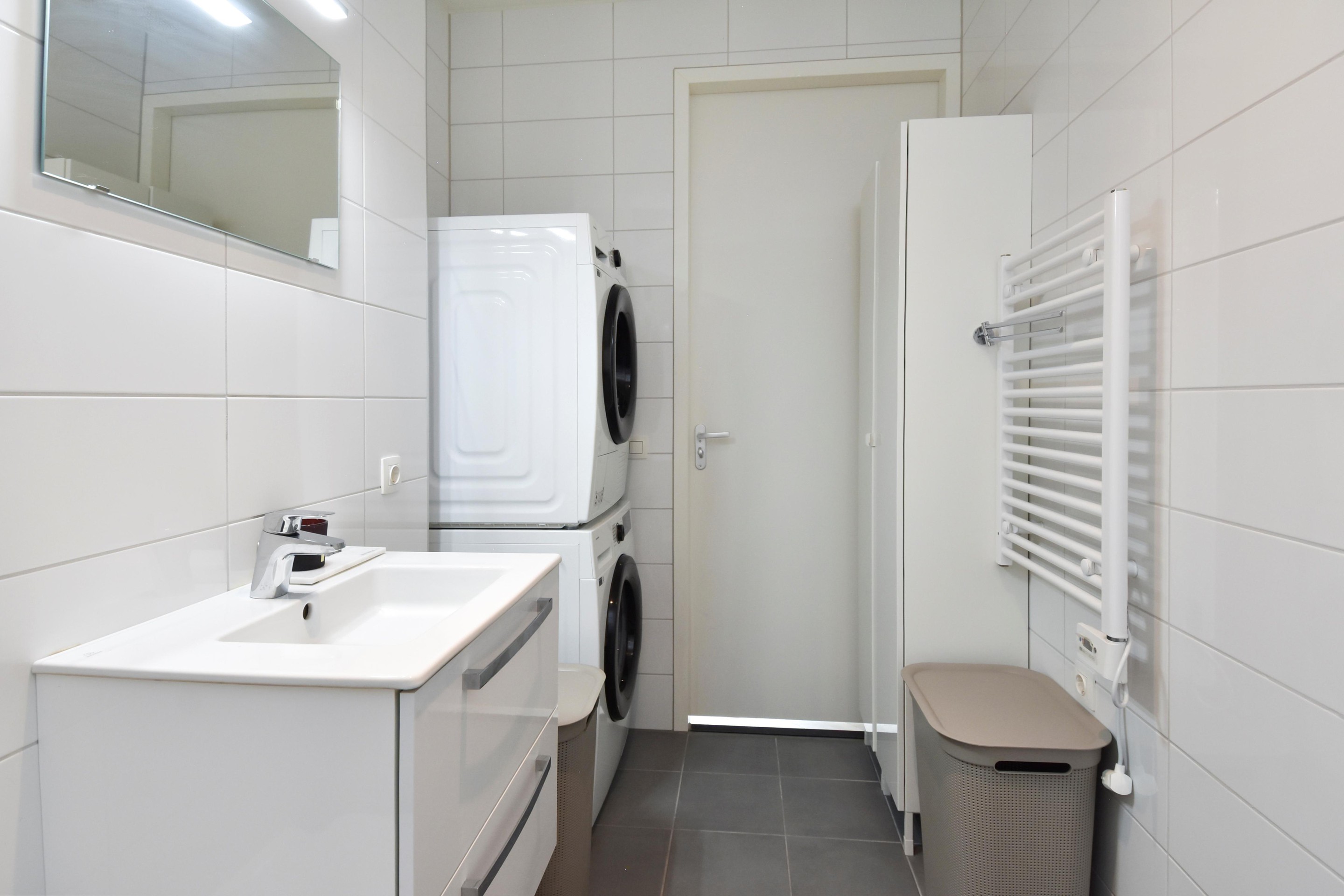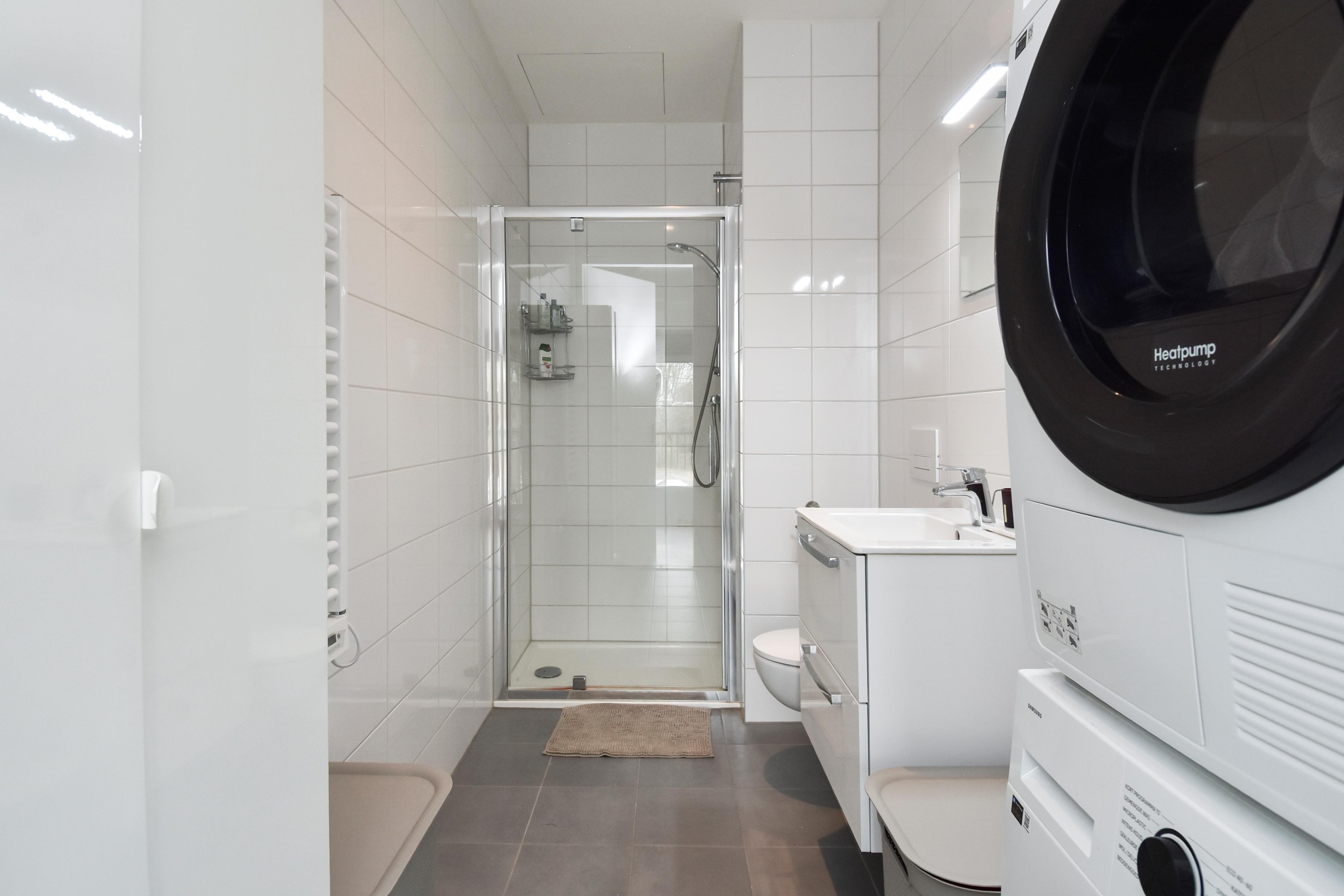 De moderne badkamer is compleet uitgevoerd met een inloopdouche, zwevend toilet, wastafelmeubel, handdoekradiator en een praktische opstelplaats voor de wasmachine.
