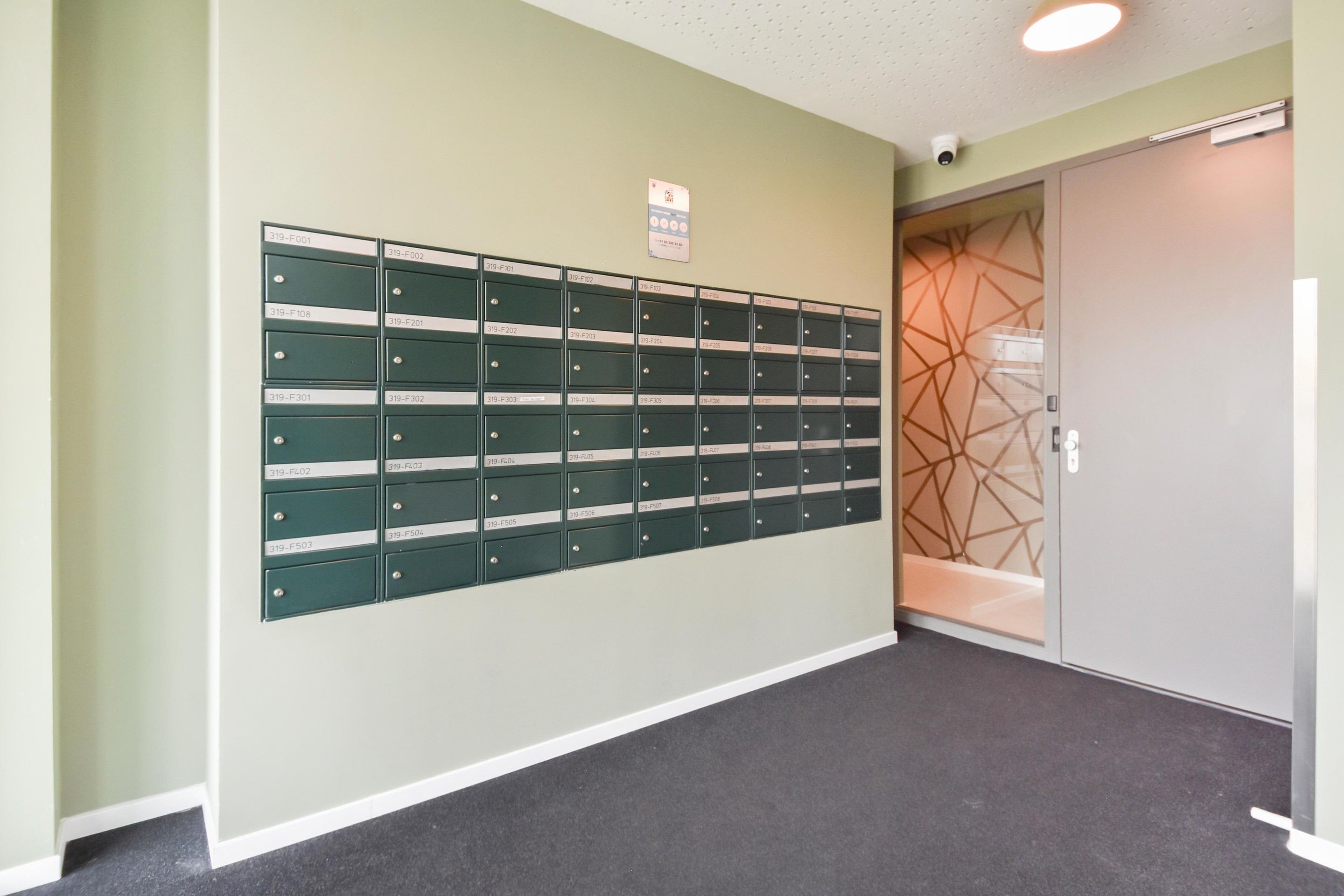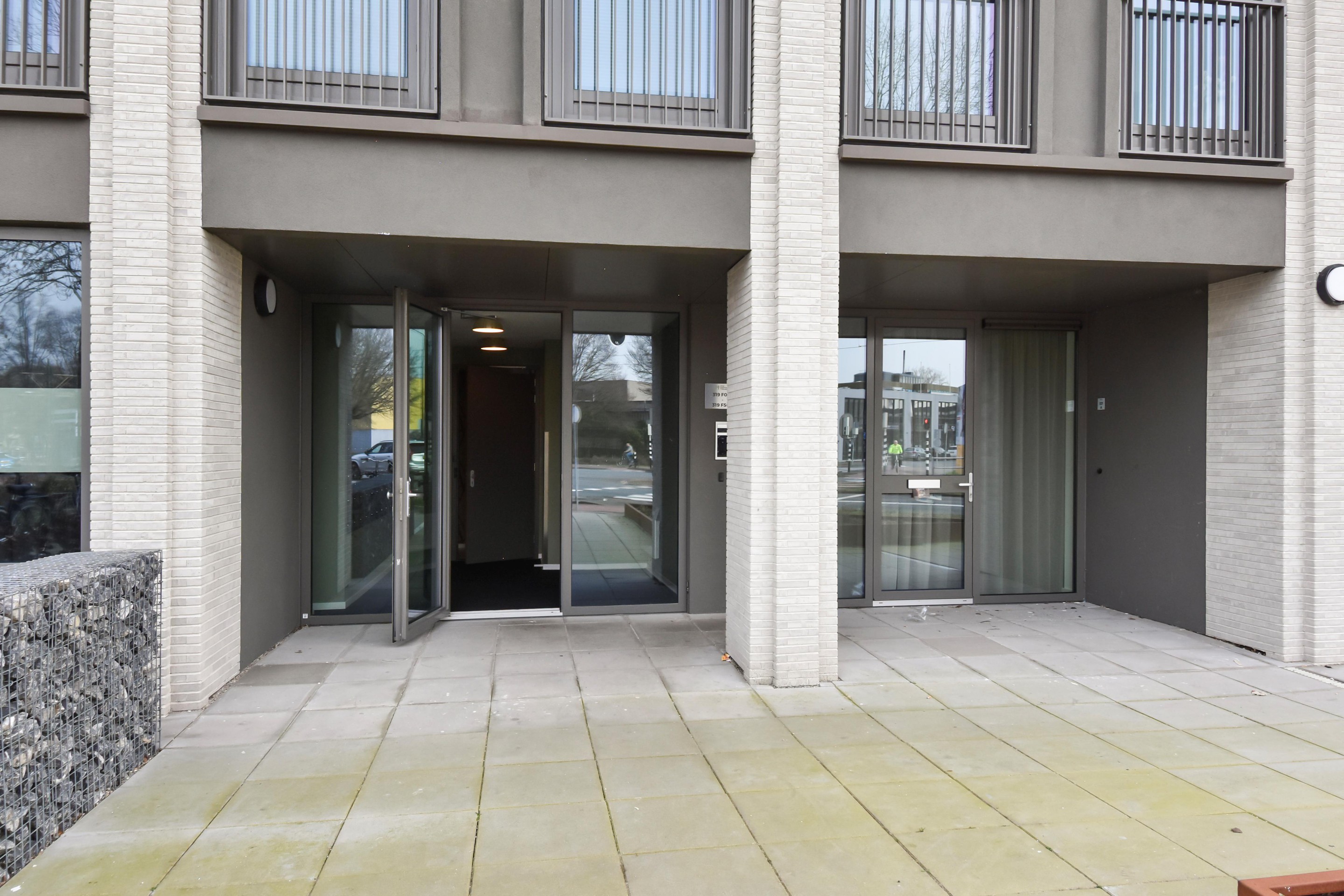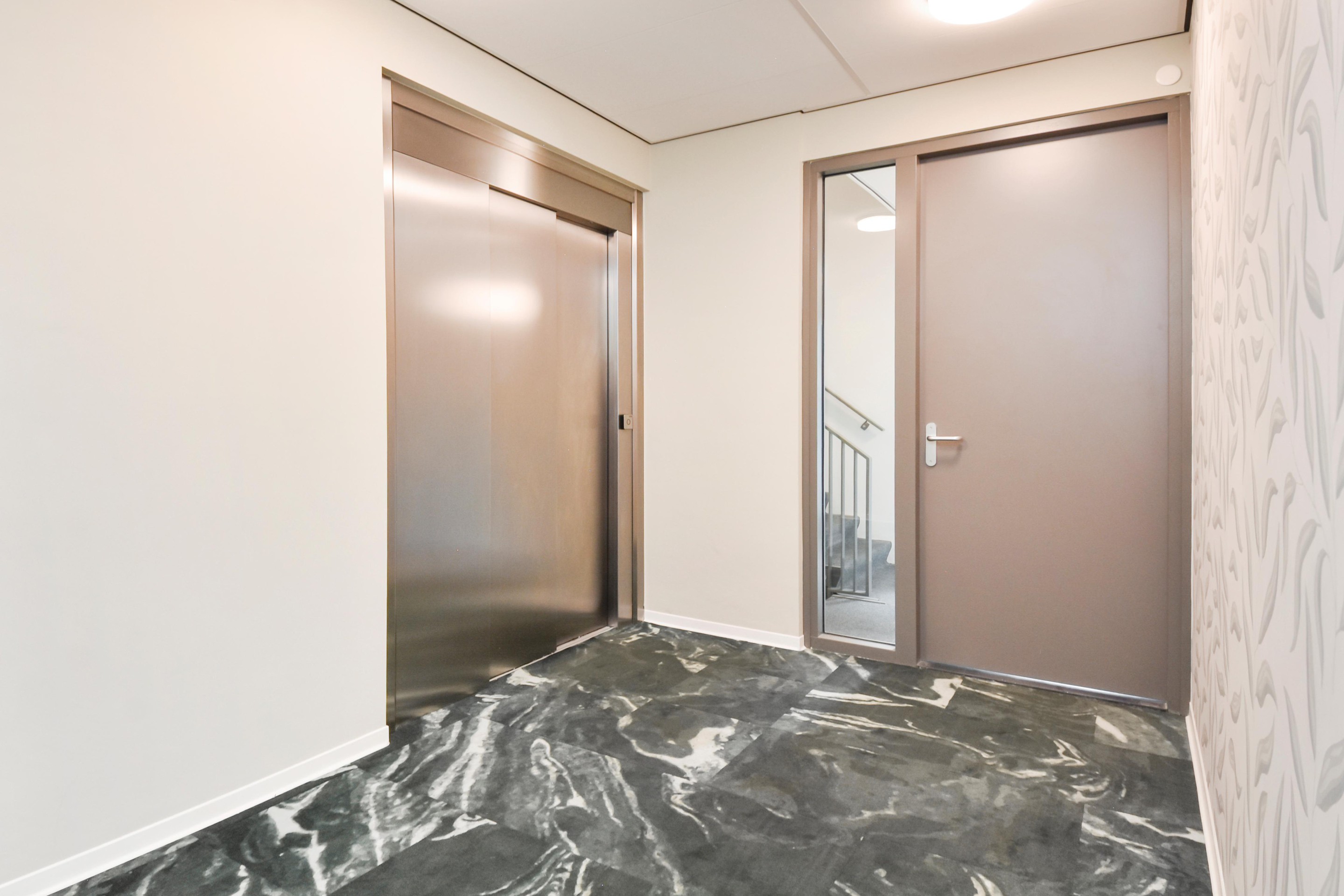 Afgesloten entree met brievenbussen- en bellentableau met camera. Representatieve centrale hal met lift en trap naar de eerste verdieping.