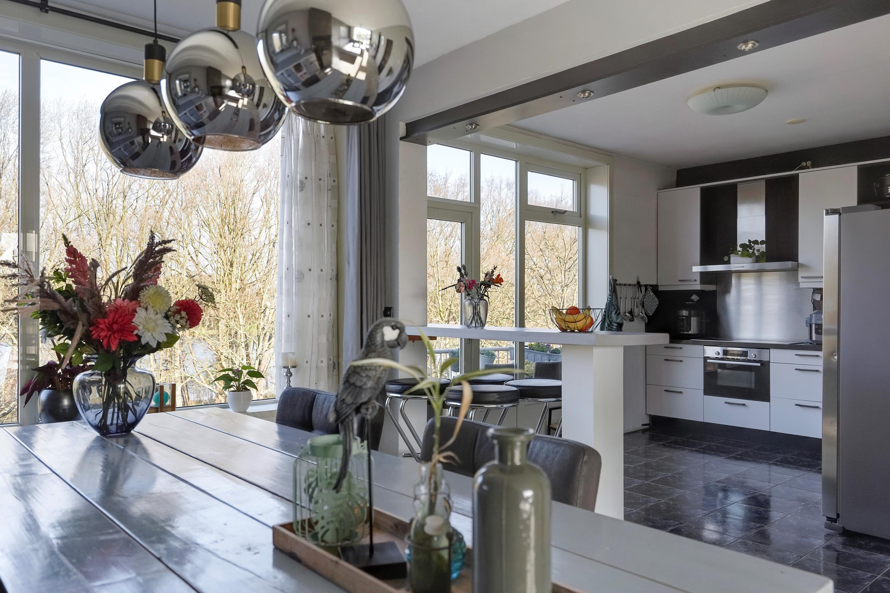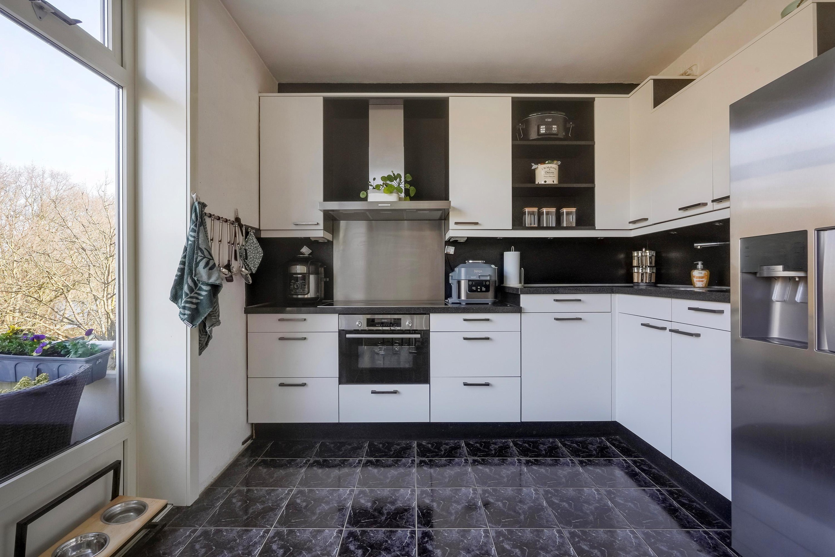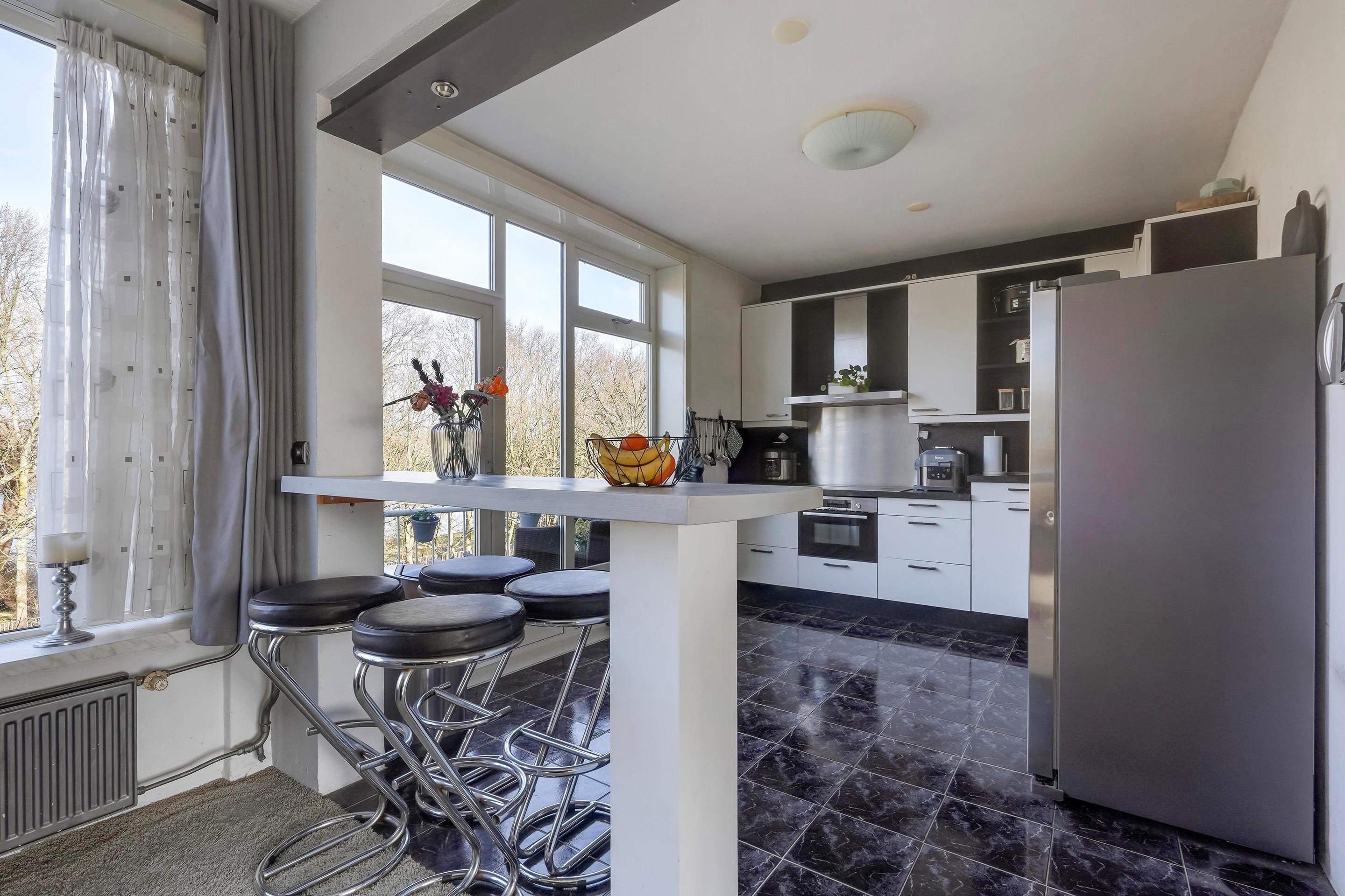 De open keuken, die voorheen als slaapkamer diende, is praktisch ingericht en voorzien van diverse inbouwapparatuur, waaronder een 4-pits keramische kookplaat, oven, afzuigkap en vaatwasser (vernieuwd in 2020). De losse Amerikaanse koelkast blijft achter. Vanuit de woonkamer heeft u toegang tot twee balkons: een kleiner balkon aan de voorzijde en een ruim balkon aan de achterzijde met vrij uitzicht op het groen.