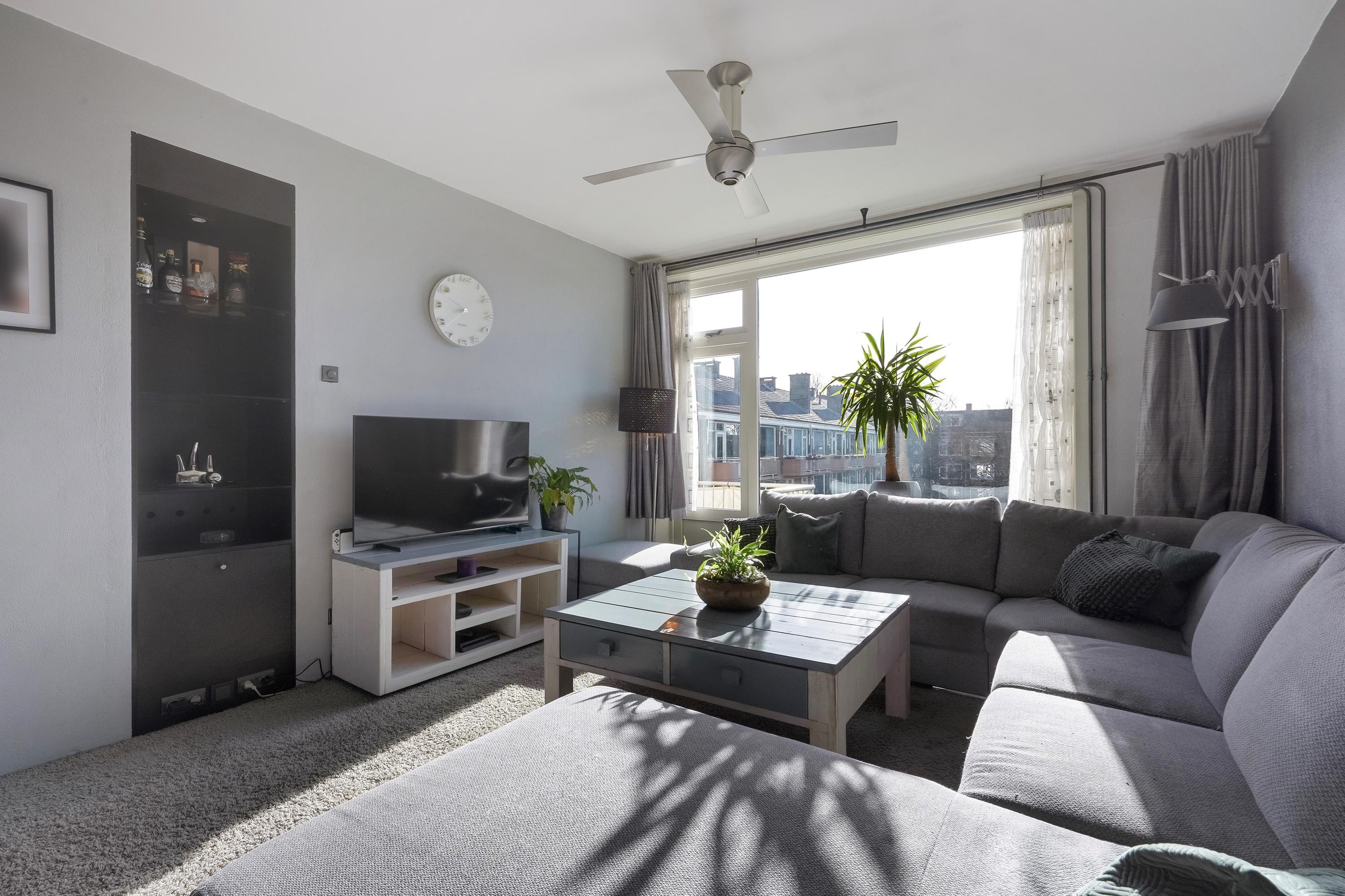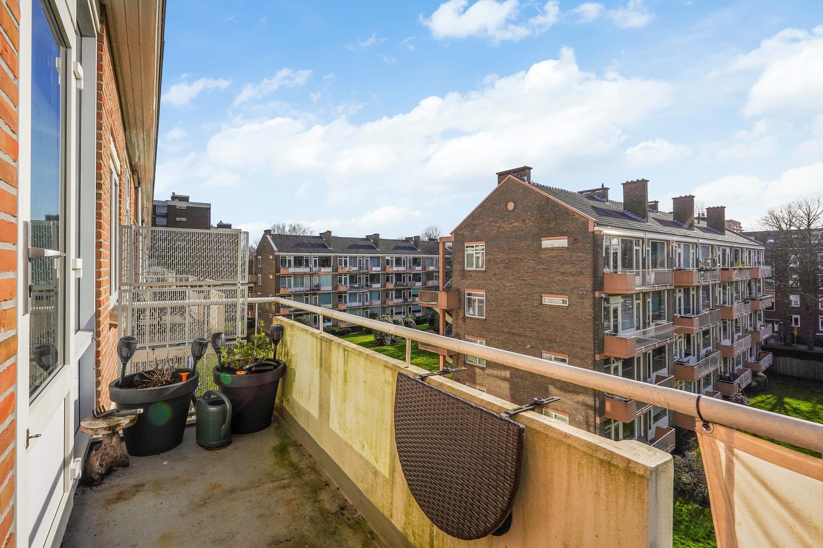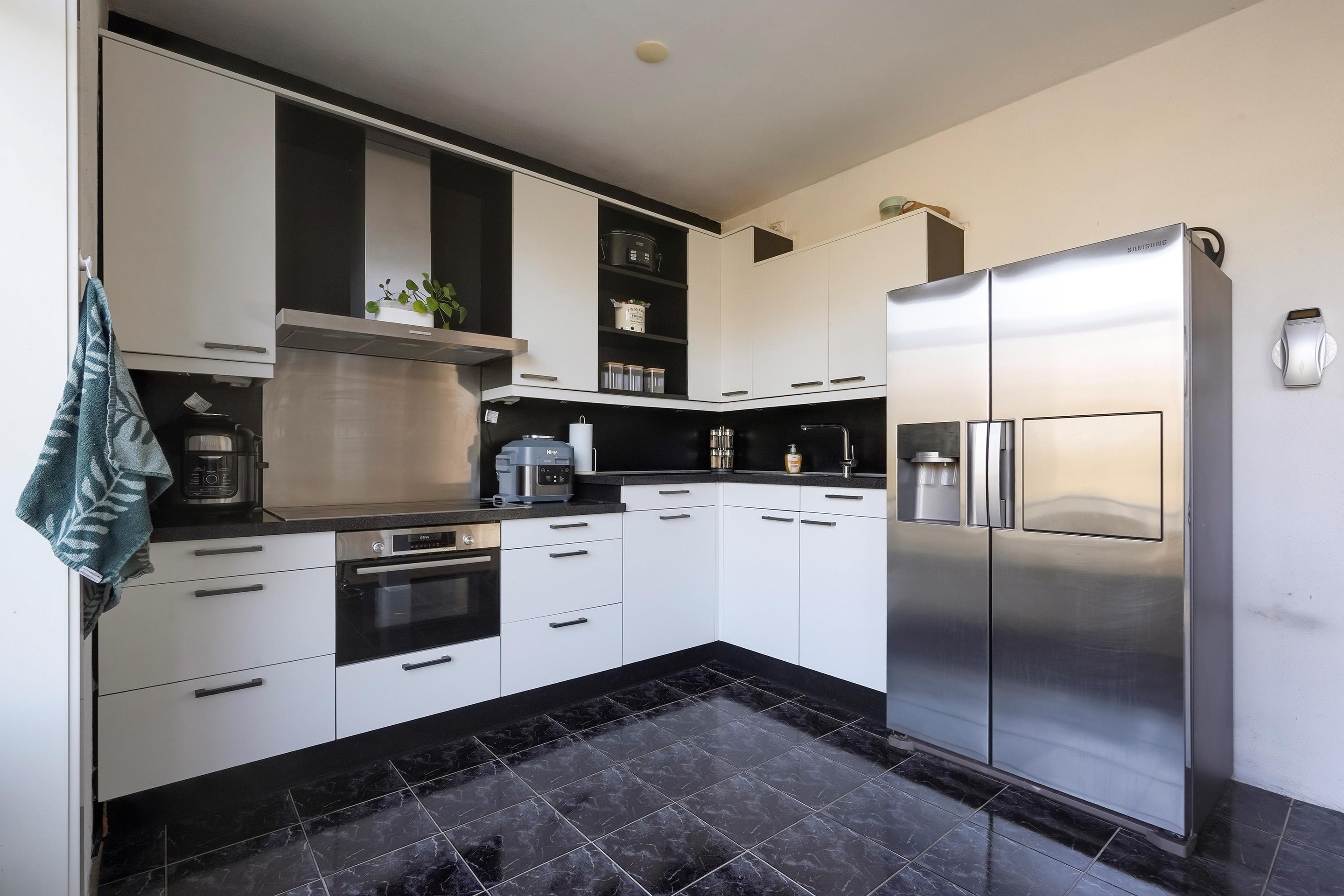 De open keuken, die voorheen als slaapkamer diende, is praktisch ingericht en voorzien van diverse inbouwapparatuur, waaronder een 4-pits keramische kookplaat, oven, afzuigkap en vaatwasser (vernieuwd in 2020). De losse Amerikaanse koelkast blijft achter. Vanuit de woonkamer heeft u toegang tot twee balkons: een kleiner balkon aan de voorzijde en een ruim balkon aan de achterzijde met vrij uitzicht op het groen.