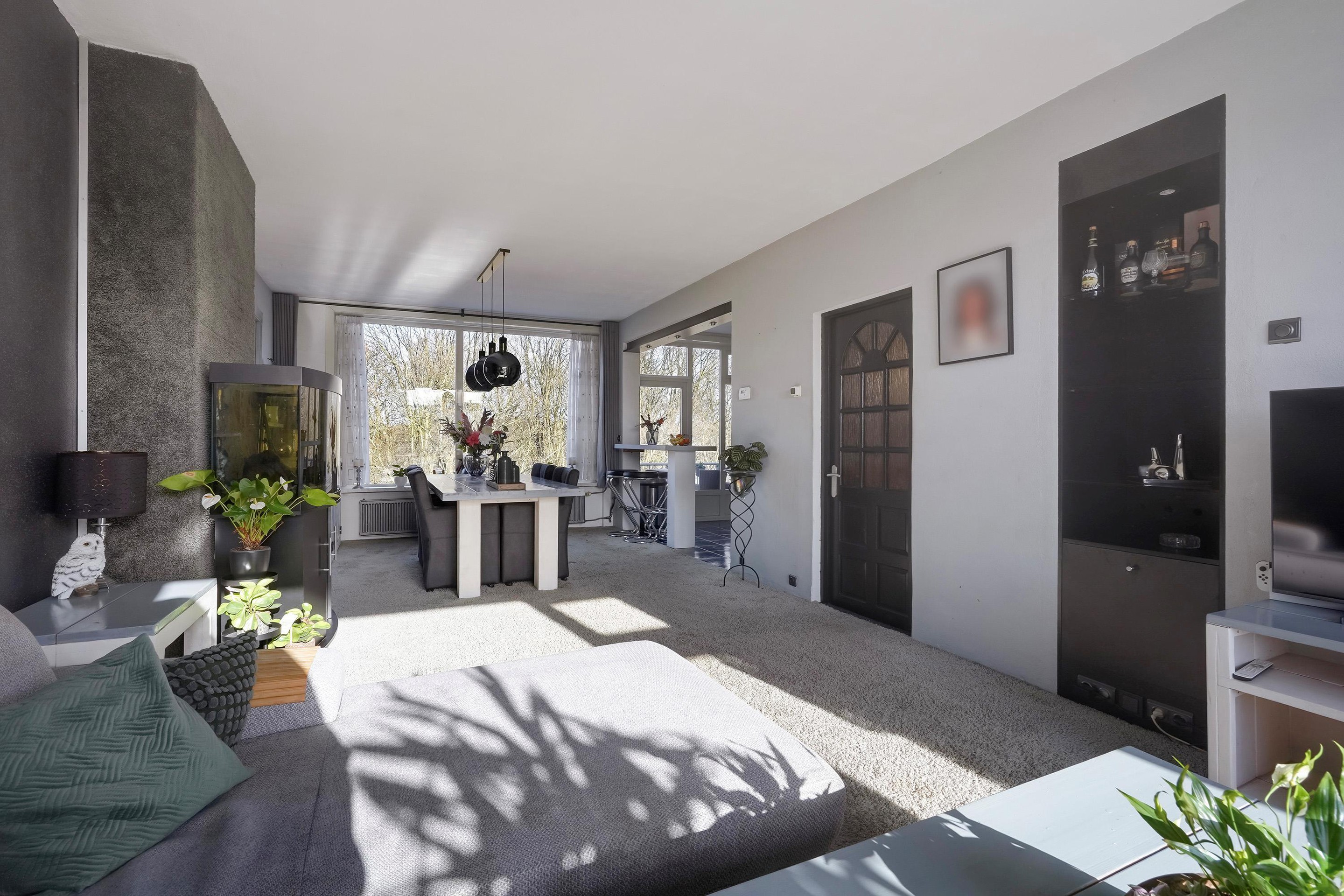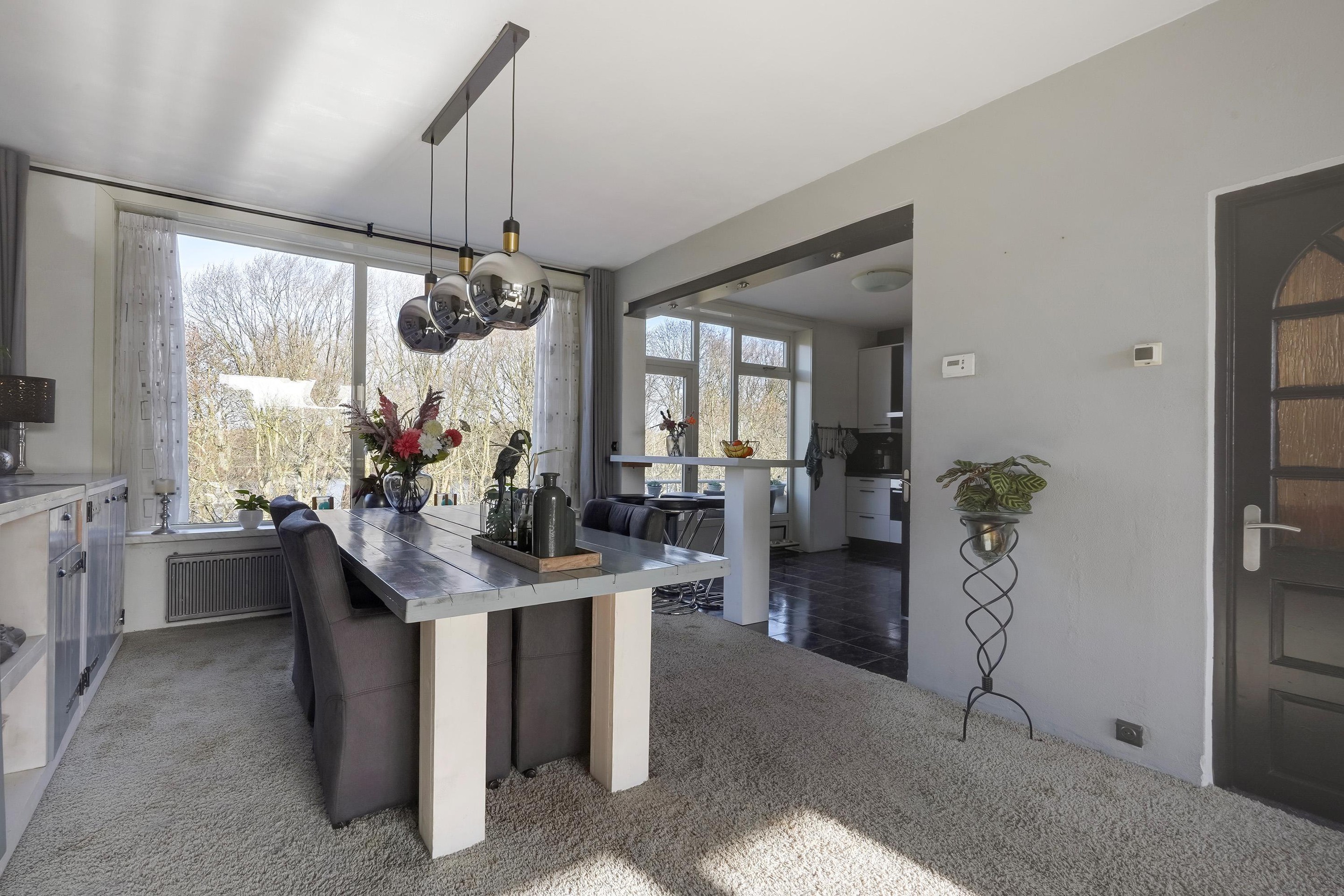 Via het afgesloten portiek bereikt u de entree van de woning op de eerste verdieping. De hal biedt toegang tot de meterkast, een handige voorraadkast en de verschillende vertrekken. De ruime woonkamer vormt het hart van de woning en profiteert van grote raampartijen aan zowel de voor- als achterzijde, wat zorgt voor een aangename lichtinval gedurende de dag.
