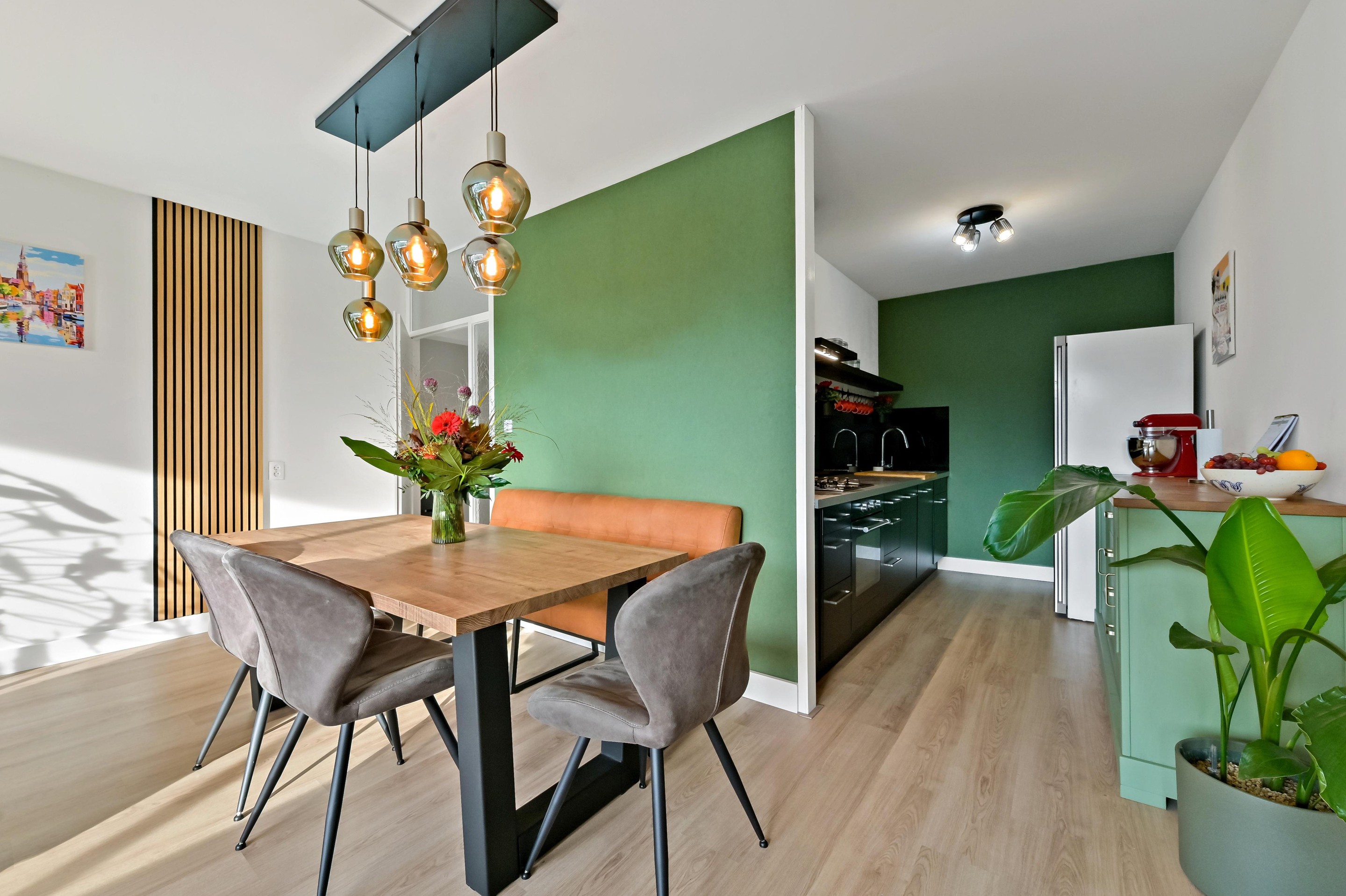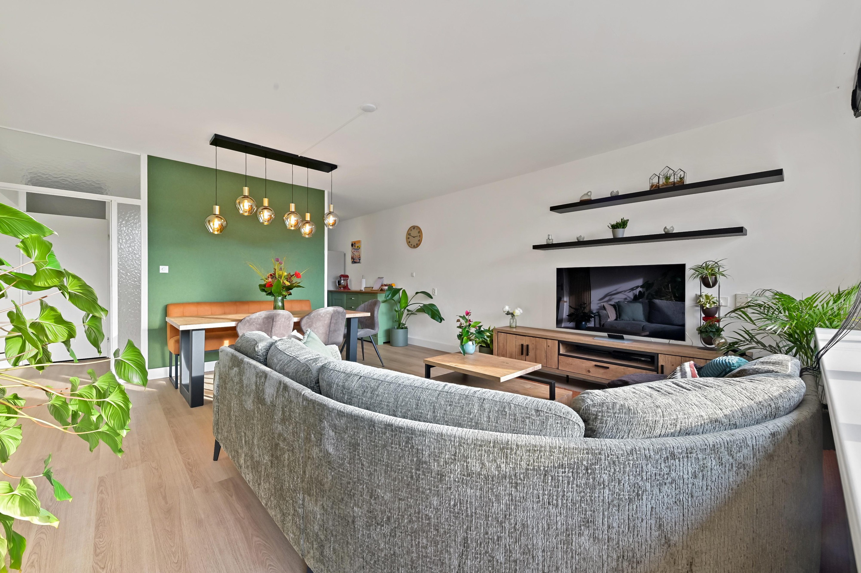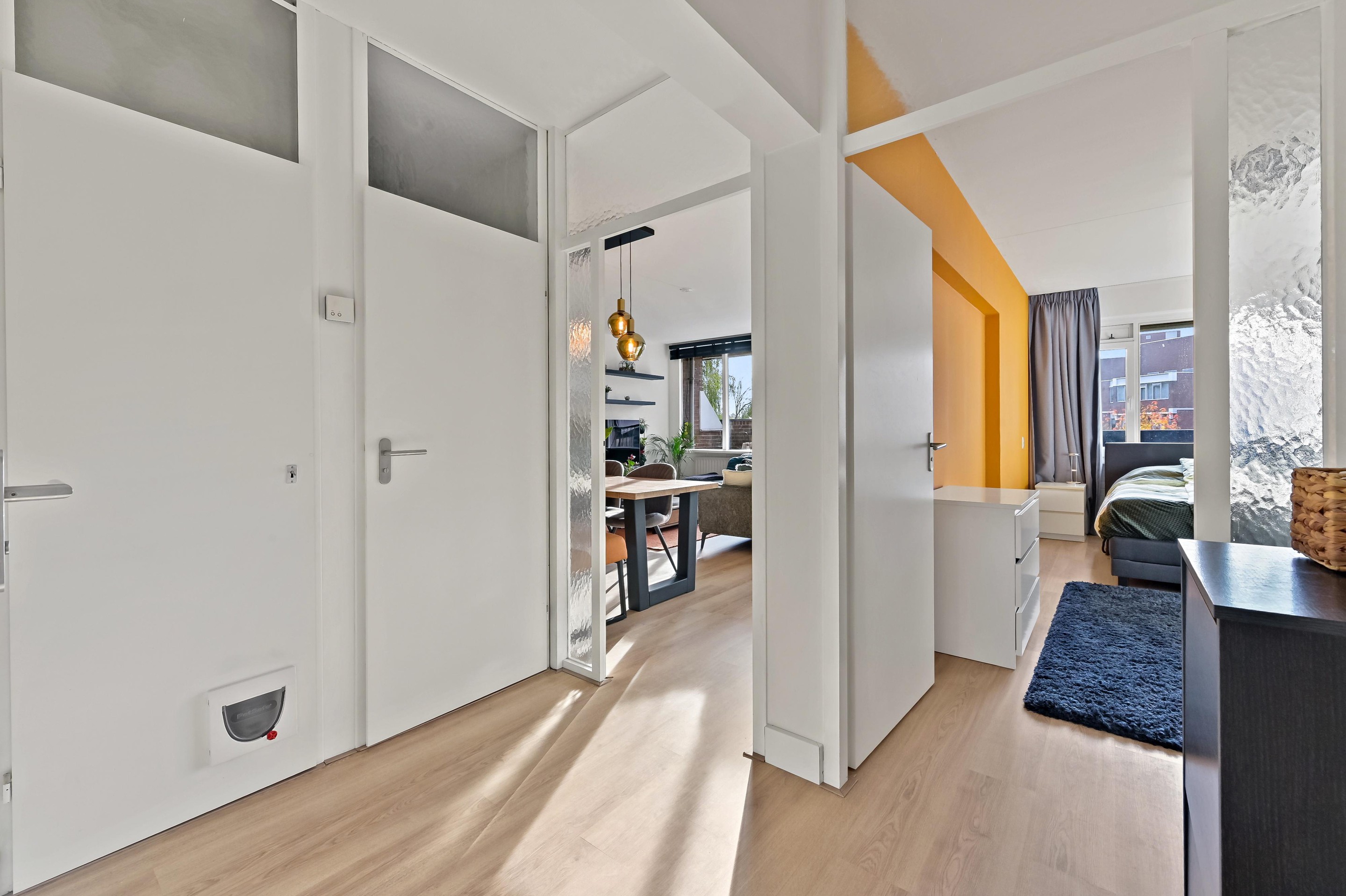 De centrale hal biedt toegang tot het appartement. Vanuit de hal met meterkast en moderne toiletruimte zijn alle vertrekken te bereiken. De woonkamer met aangrenzende keuken is sfeervol ingericht en grenst aan het zonnige balkon. Het balkon is aan de achterzijde gelegen en kijkt uit op een groenstrook met vijverpartij en fontein, waardoor je hier in alle rust van de middag- en avondzon kunt genieten. De moderne open keuken is voorzien van een 4-pits gaskookplaat, afzuigkap, oven en vaatwasser – alles wat je nodig hebt om lekker te koken. De ruime slaapkamer met vaste kast biedt voldoende plek voor een groot bed en kledingkast. De badkamer is in het midden van het appartement gesitueerd en voorzien van douche, wastafel, spiegelkast en aansluiting voor de wasmachine en wasdroger. De laminaatvloer loopt door in de hele woning (m.u.v. de natte ruimtes), wat zorgt voor een verzorgde afwerking.