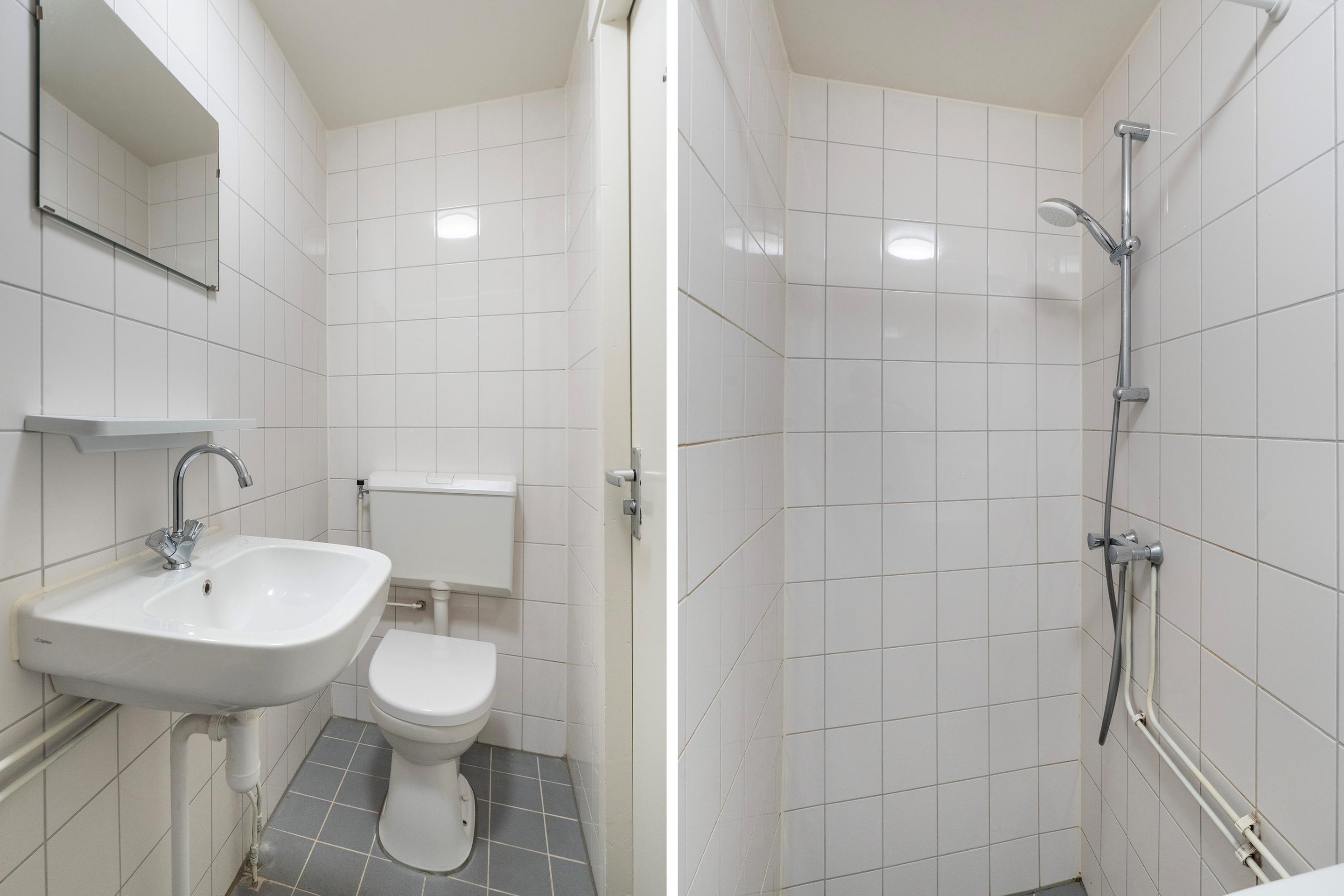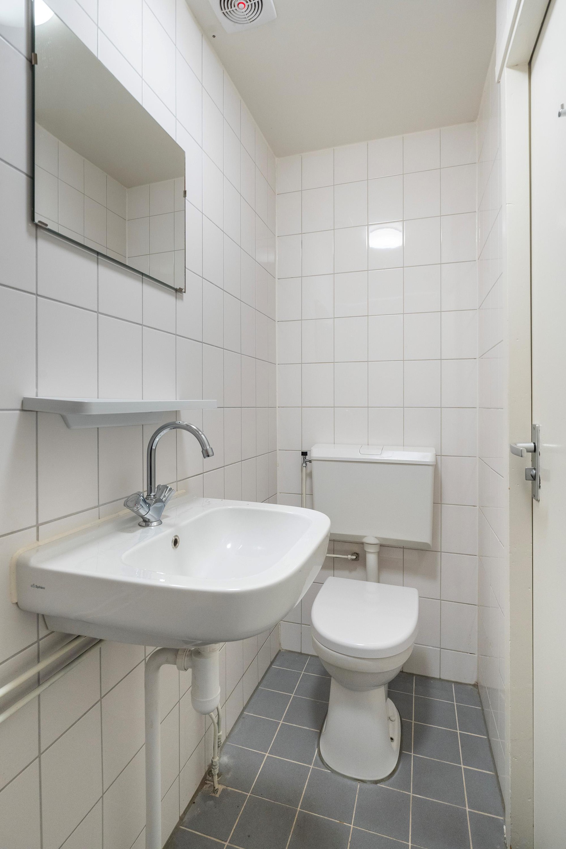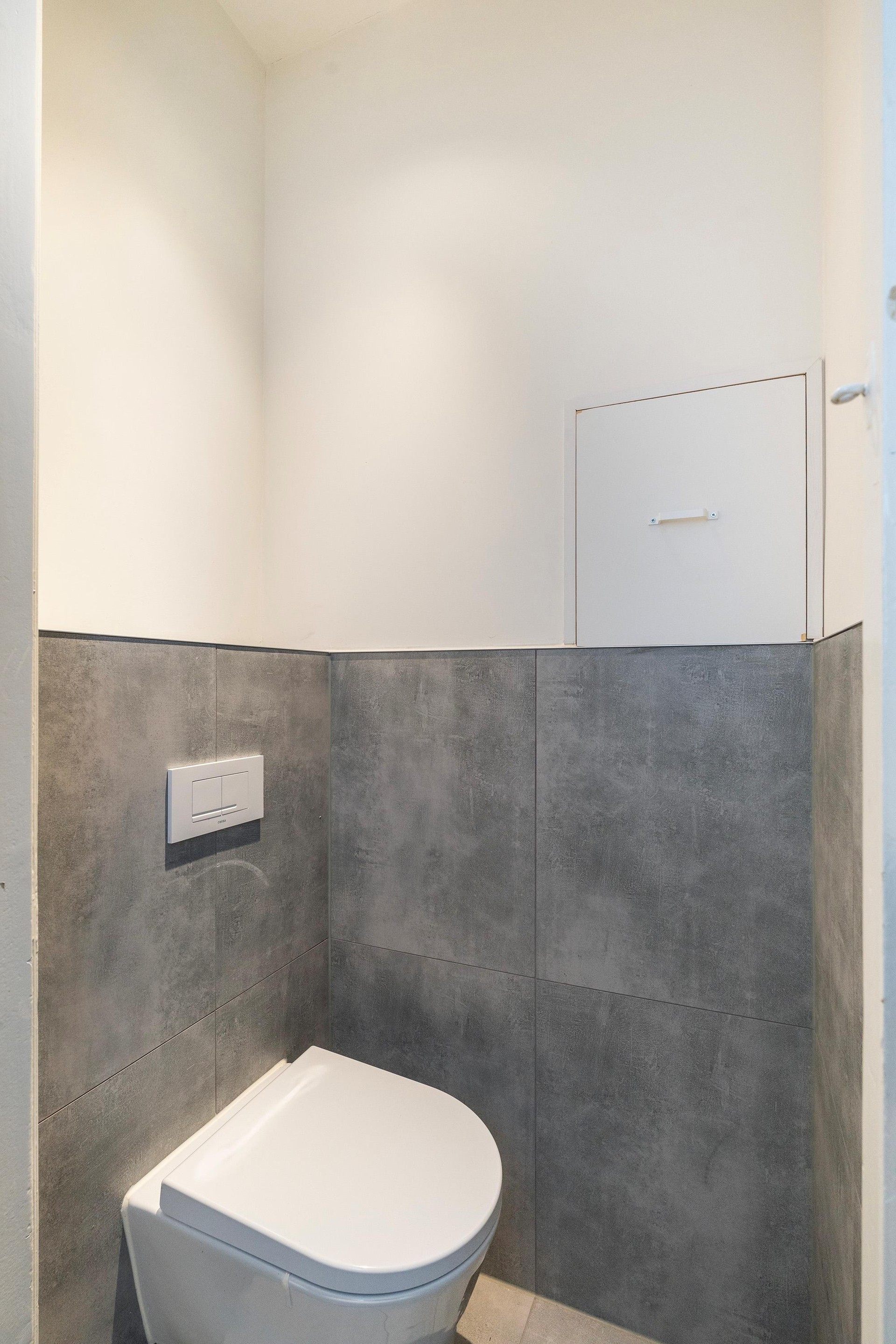 De badkamer oogt netjes en functioneel ingericht. Het separate toilet beschikt over een zwevend closet en een verzorgde afwerking, wat bijdraagt aan het praktische wooncomfort.