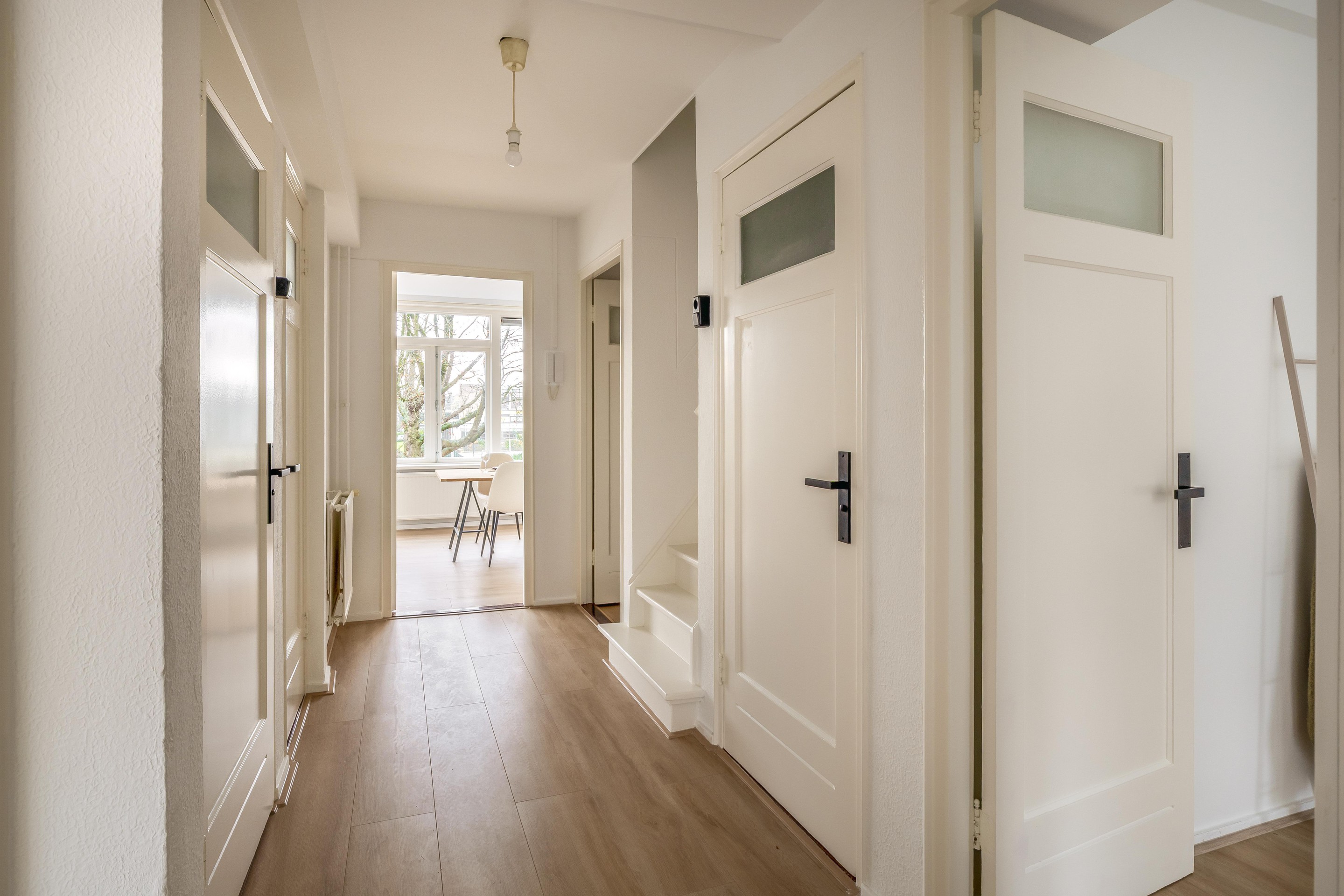 Deze verdieping is voorzien van een doorlopende laminaatvloer, gestuukte wanden en plafonds (m.u.v. de hal) en paneeldeuren.