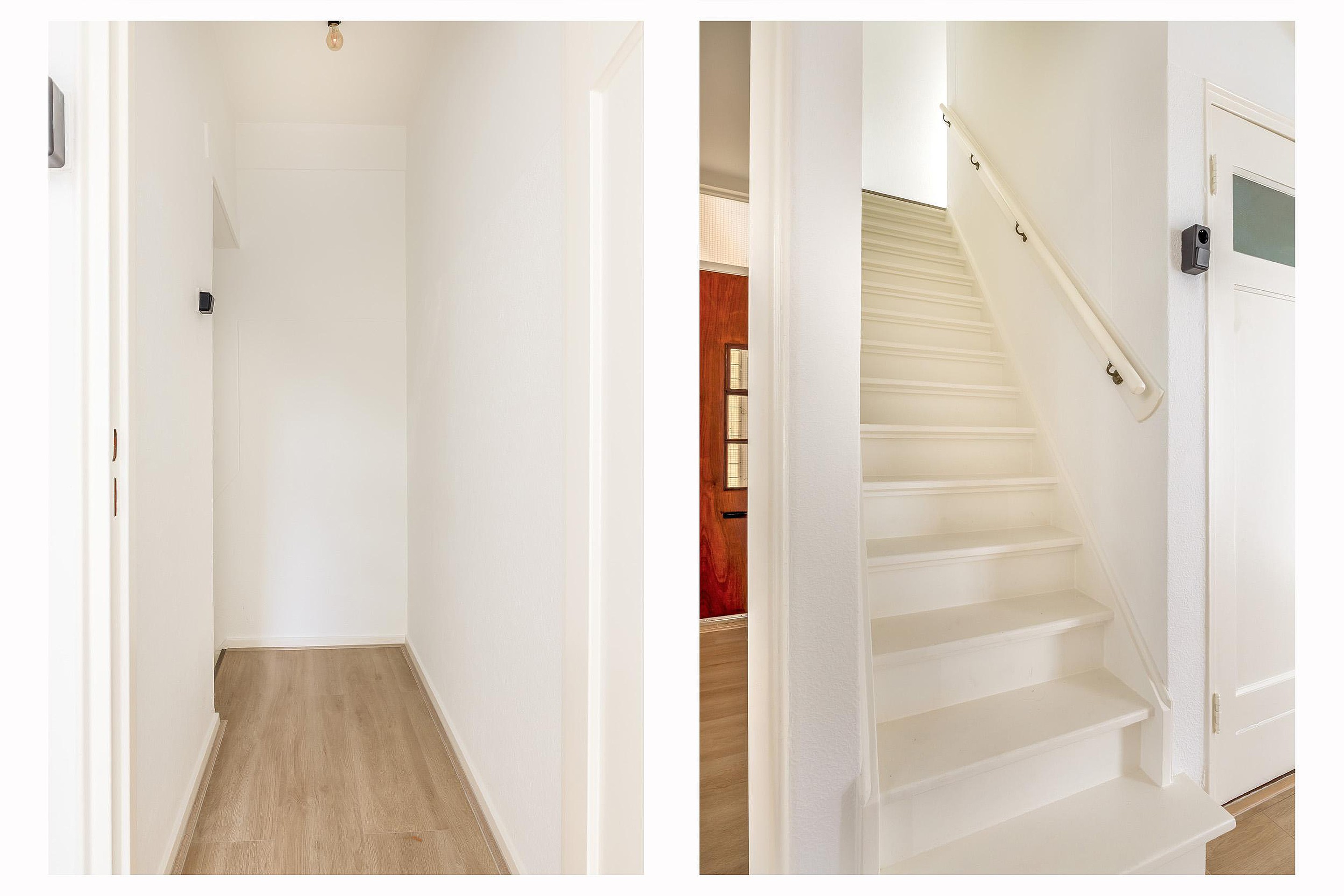 Via de entree kom je in de ruime hal. De hal is voorzien van de meterkast, toiletruimte, trapopgang naar de 2e verdieping en geeft toegang tot alle vertrekken. De toiletruimte is half betegeld in een beige kleurstelling met messing details en is voorzien van een zwevend toilet met fonteintje.