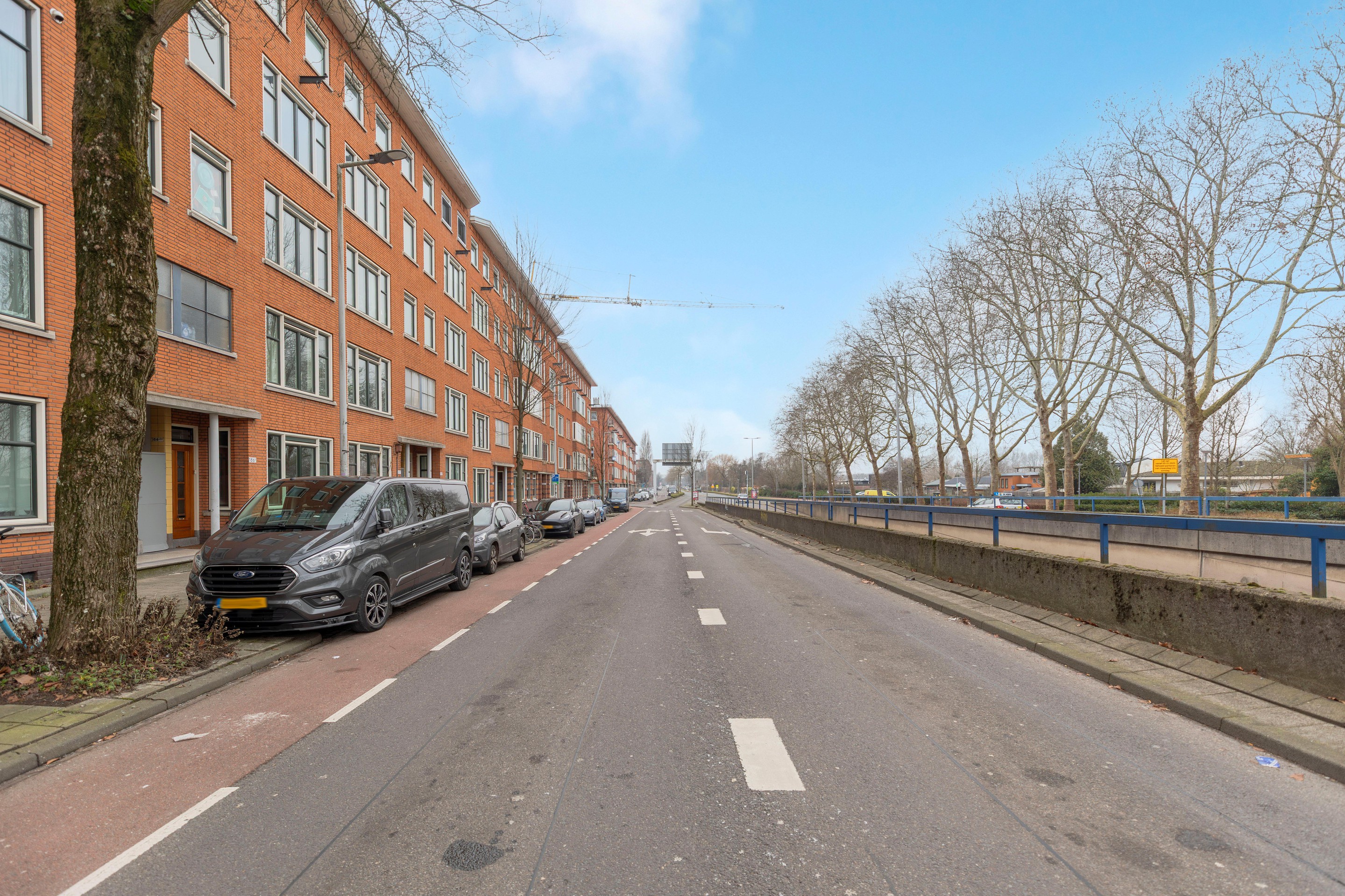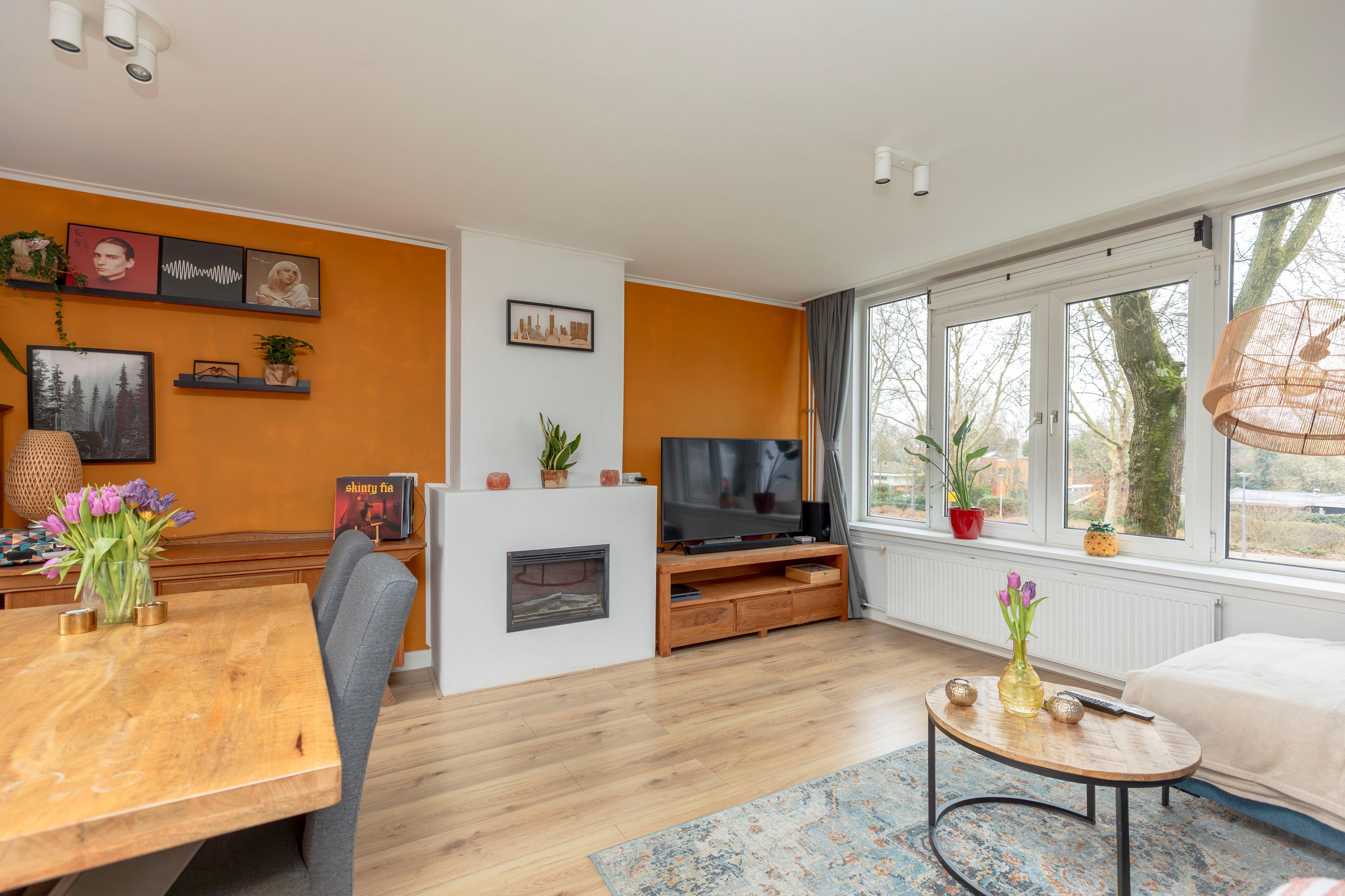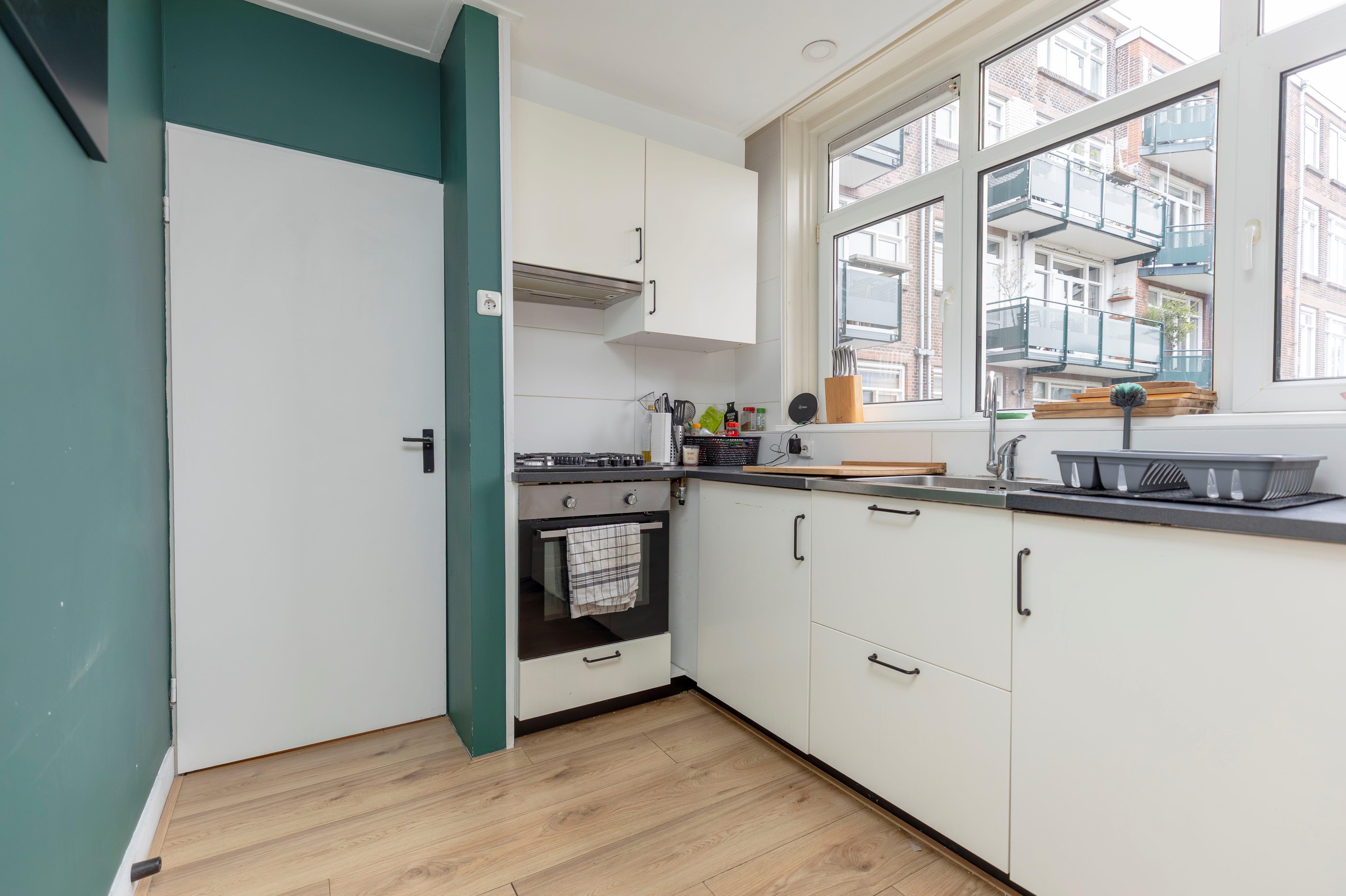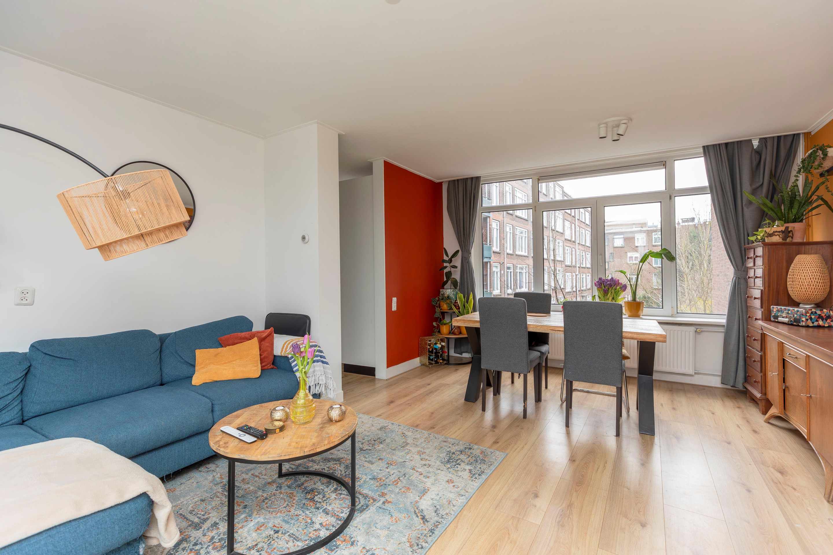 De woonkamer is ruim opgezet en beschikt over grote raampartijen aan beide zijden. Aan de voorzijde kijkt u vrij uit over de Gordelweg en het Noorderkanaal, terwijl u aan de achterzijde uitzicht heeft op de groene binnentuinen. De overvloedige lichtinval zorgt voor een fijne, open sfeer. Er is volop ruimte voor zowel een comfortabele zithoek als een gezellige eethoek.
