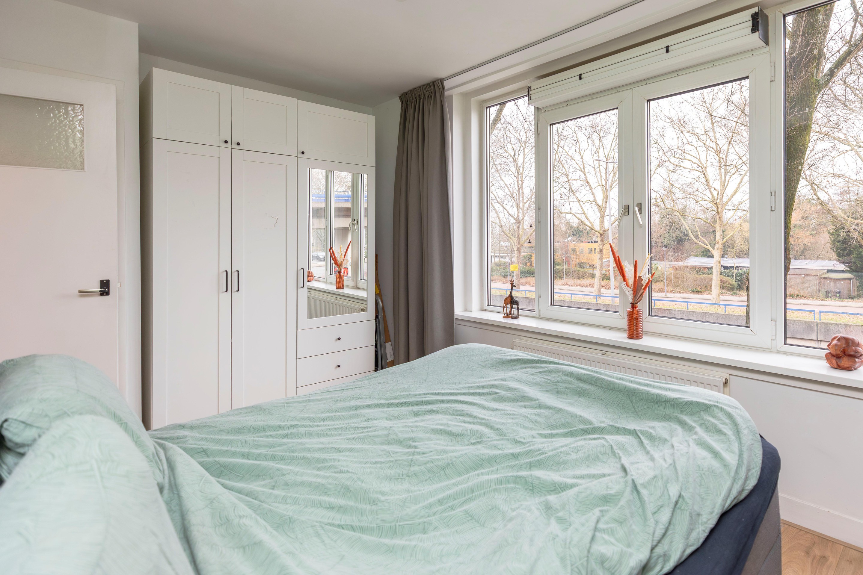 Aan de voorzijde bevinden zich twee slaapkamers. De royale hoofdslaapkamer beschikt over grote ramen met een leuk uitzicht en biedt ruimte aan een tweepersoonsbed en een grote kledingkast.