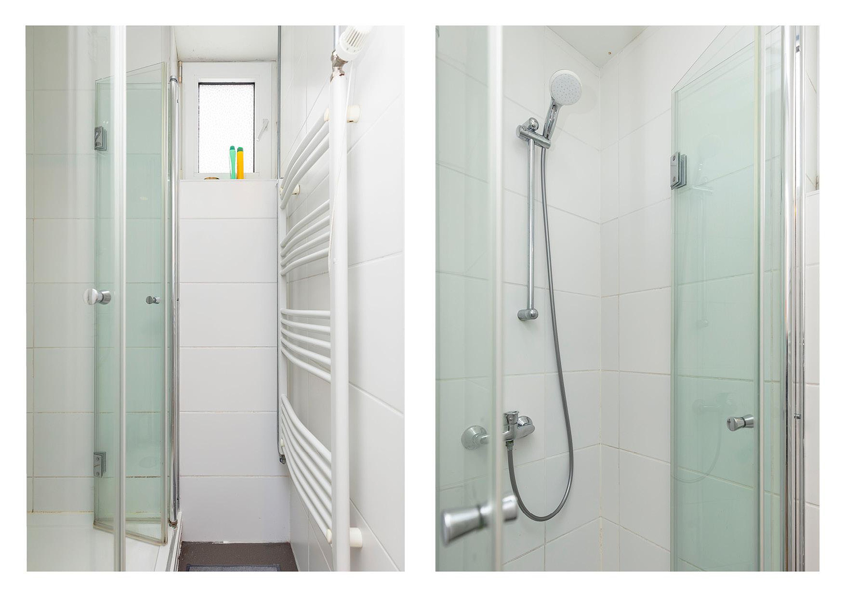De doucheruimte is volledig betegeld en voorzien van een douche en handdoekenradiator. De combinatie van grote witte wandtegels en een antracietkleurige vloer geeft de ruimte een frisse uitstraling. Daarnaast is er een aparte ruimte met een wastafelmeubel, waar ook de cv-ketel en de aansluiting voor de wasmachine zijn gesitueerd.