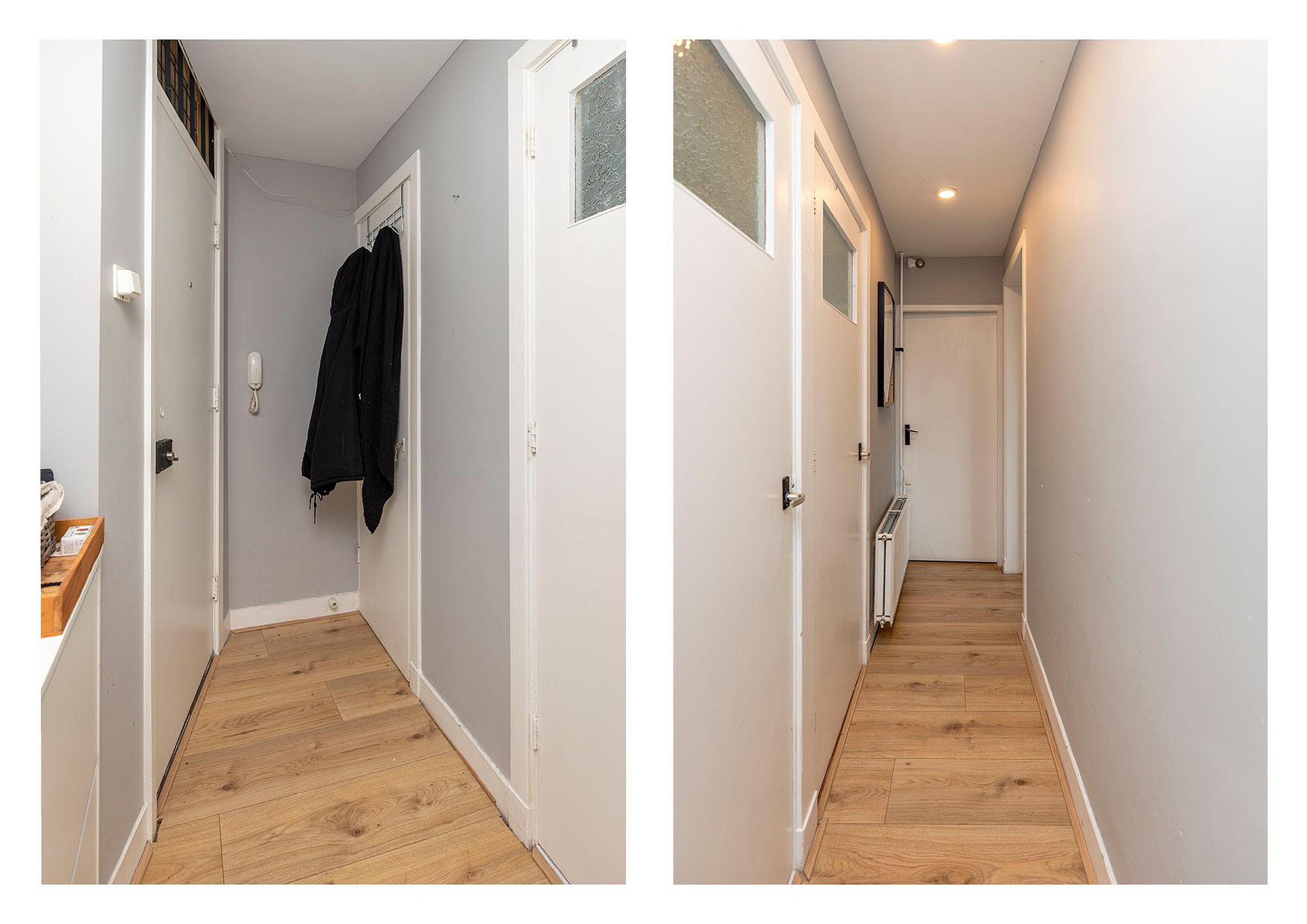 Afgesloten portiek met bellentableau en brievenbussen. Portiek met trapopgang naar de eigen voordeur op de eerste verdieping.