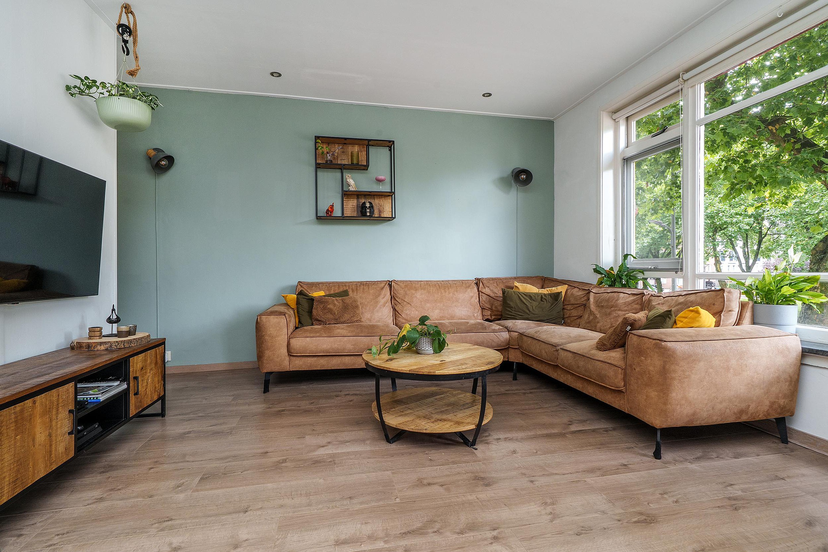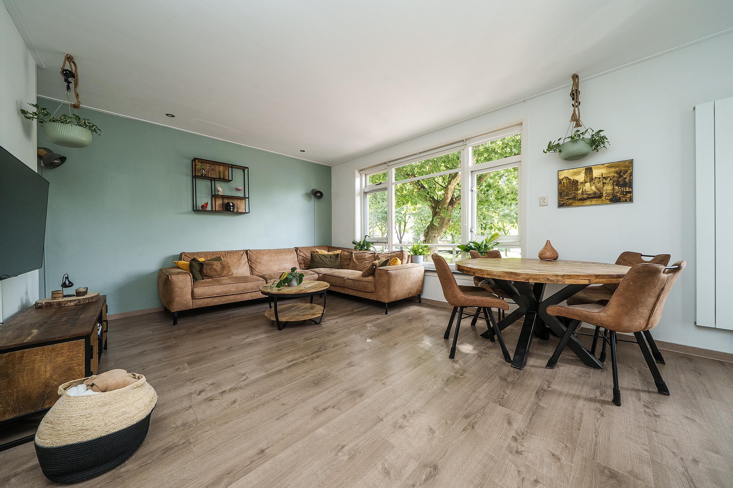 De lichte en ruime woonkamer is gelegen aan de voorzijde op het zuiden en geniet daardoor van veel natuurlijke lichtinval. De nette afwerking, gecombineerd met de warme laminaatvloer en strakke wanden, zorgt voor een prettige en uitnodigende sfeer. Vanuit de woonkamer stap je zo het zonnige balkon op – een fijne plek om van de zon te genieten.