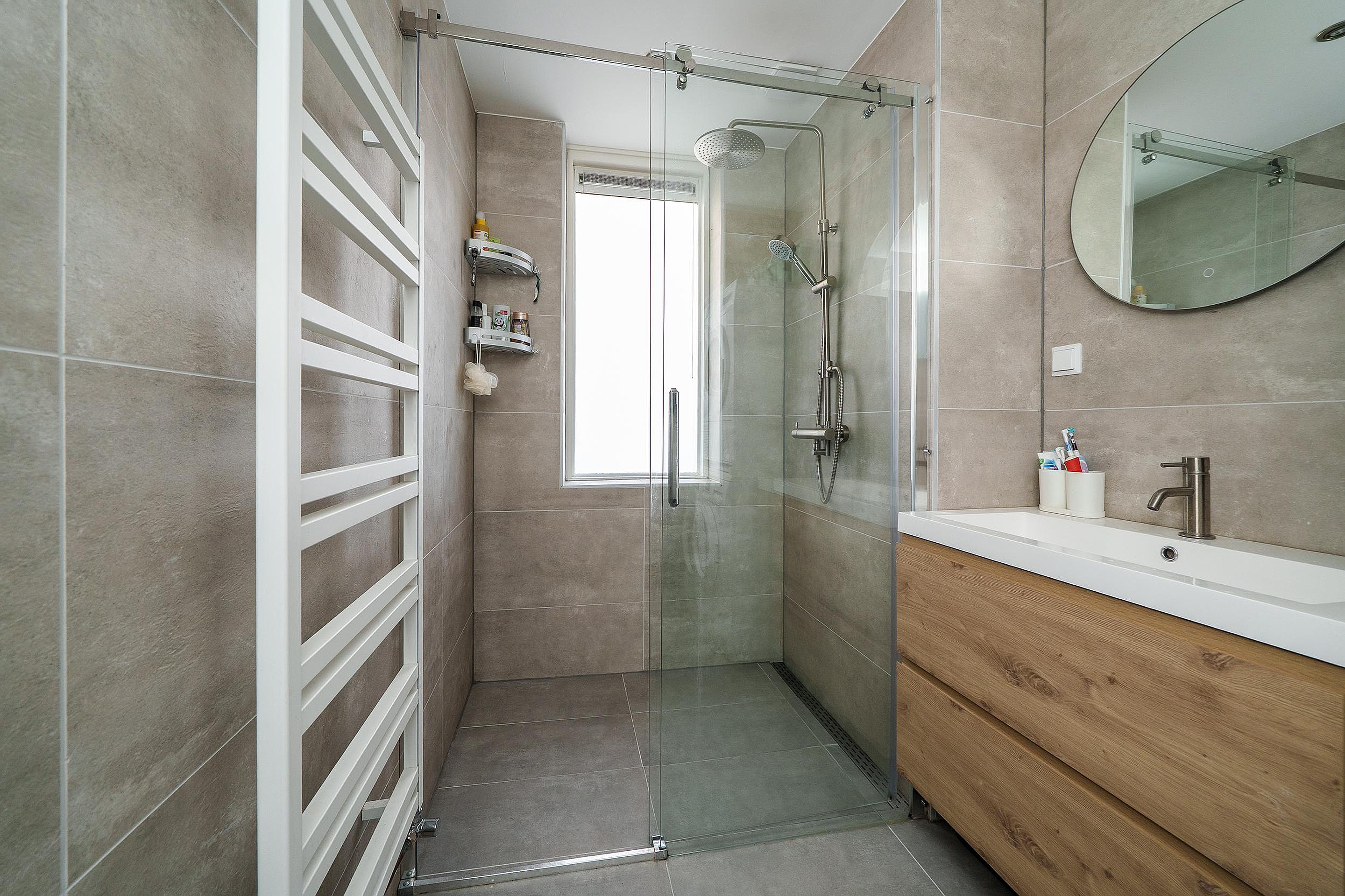 De moderne badkamer straalt luxe uit en is voorzien van een inloopdouche met glazen wand, een wastafelmeubel en een handdoekenradiator. De grote beige wand- en vloertegels geven de ruimte een rustige en stijlvolle uitstraling.