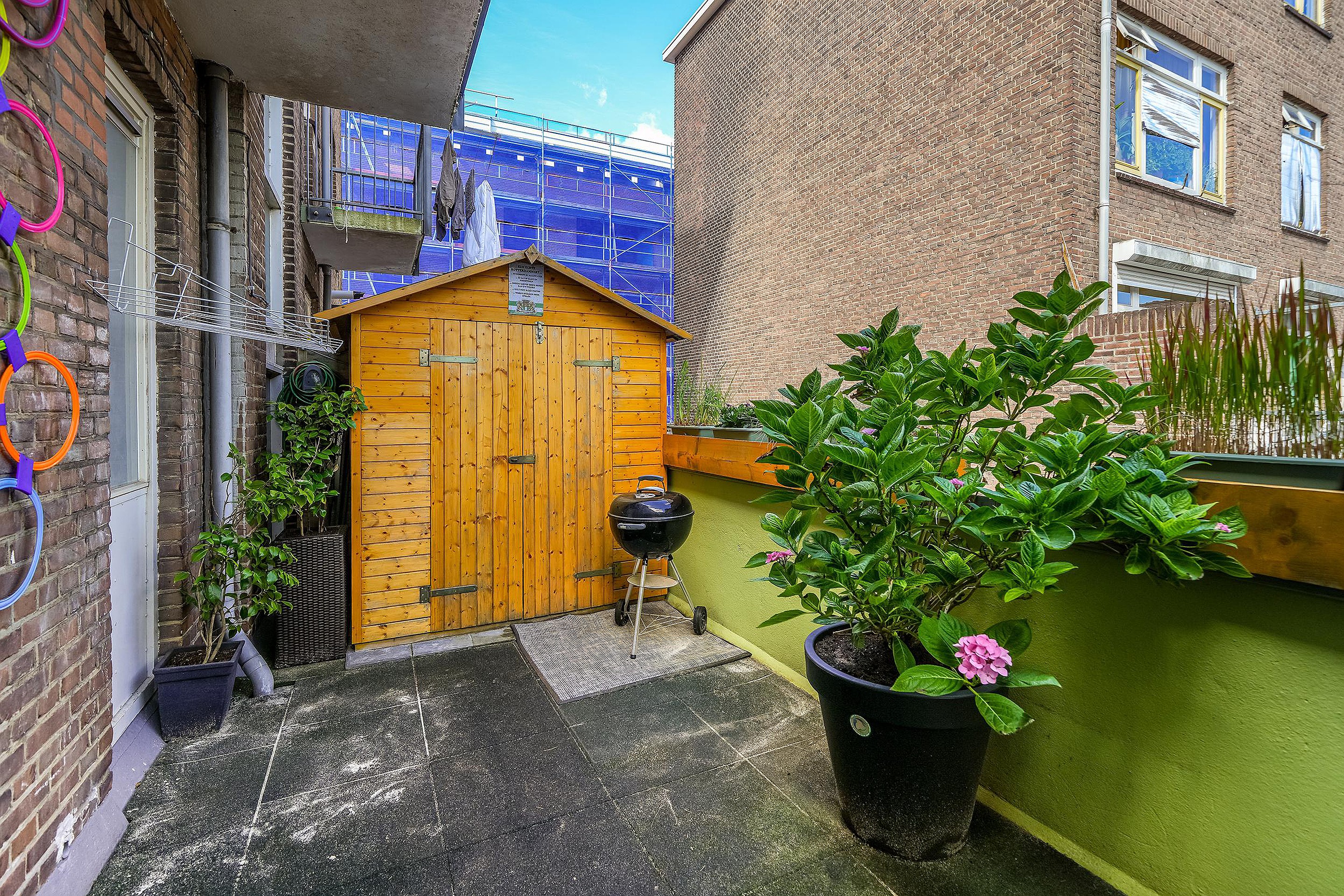Vanuit de keuken is er directe toegang tot het ruime terras: een absolute eyecatcher! Deze unieke buitenruimte is keurig afgewerkt met vlonders en biedt volop ruimte voor een loungeset of eettafel. Daarnaast is er ook nog een handige berging aanwezig.