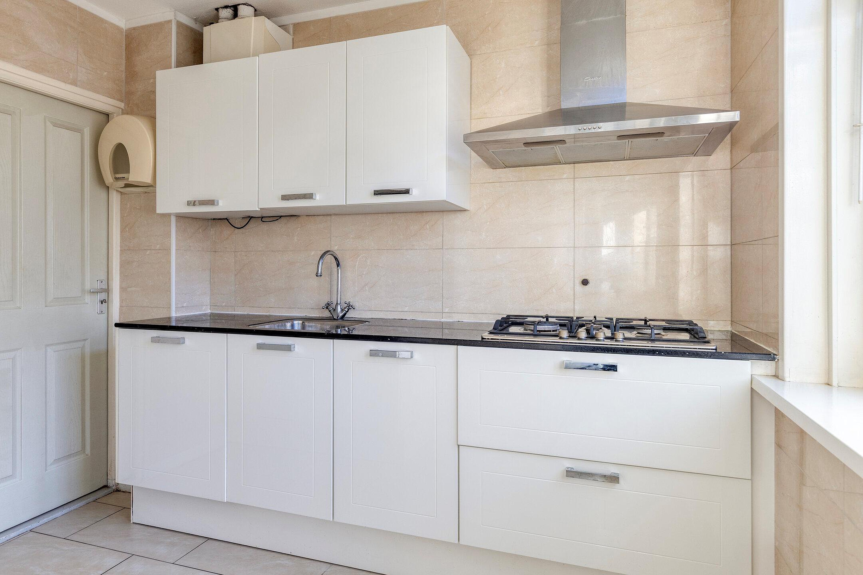 hal met meterkast en toilet en toegang tot de woonkamer aan de straatzijde, eerste slaapkamer aan de achterzijde met openslaande deuren naar het afgesloten balkon, tweede slaapkamer aan de voorzijde, badkamer met douchecabine en wastafelmeubel, moderne keuken voorzien van inbouwapparatuur waaronder een gaskookplaat, oven, magnetron, afzuigkap, vaatwasser, koel-vriescombinatie en de opstelplaats voor de combiketel.