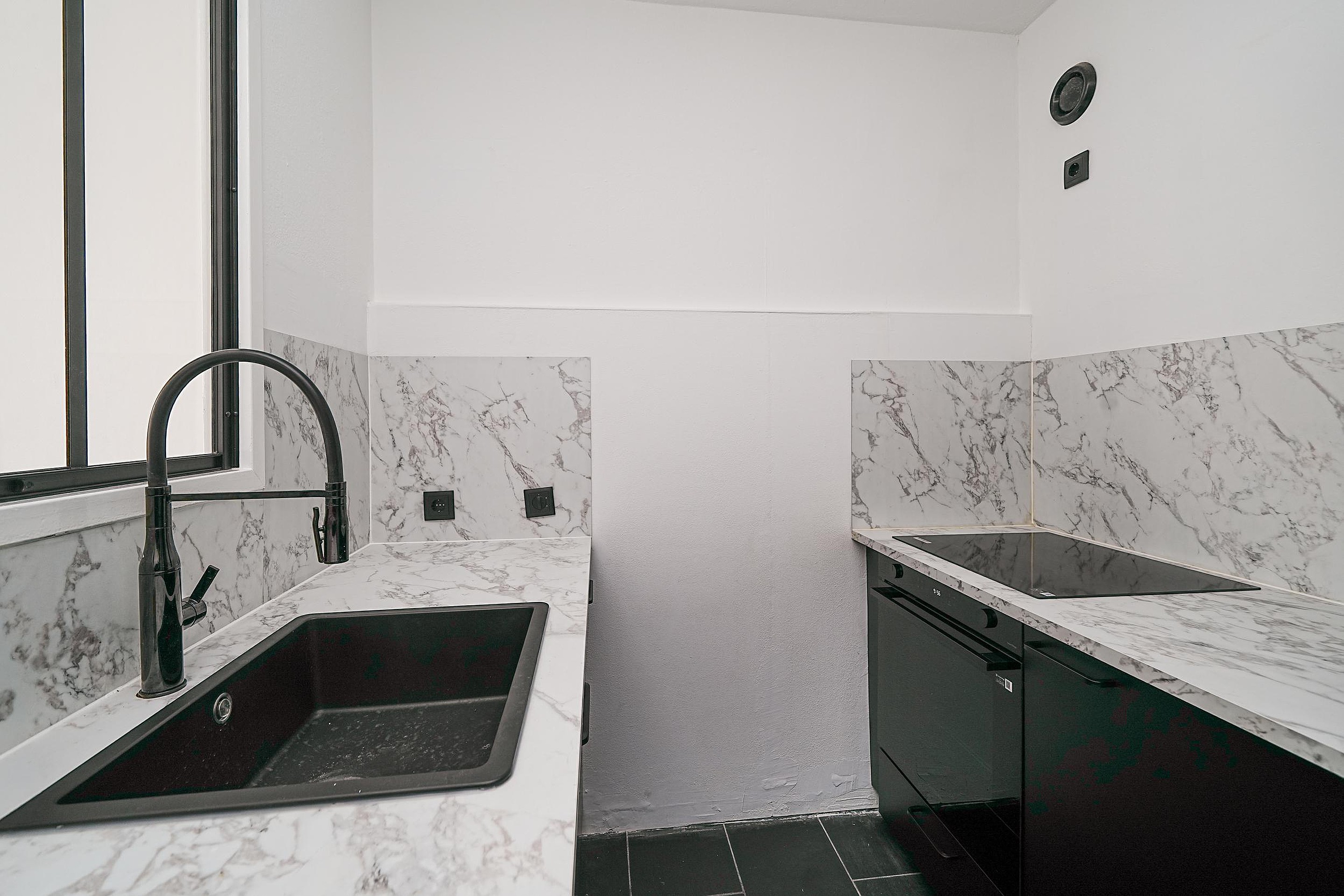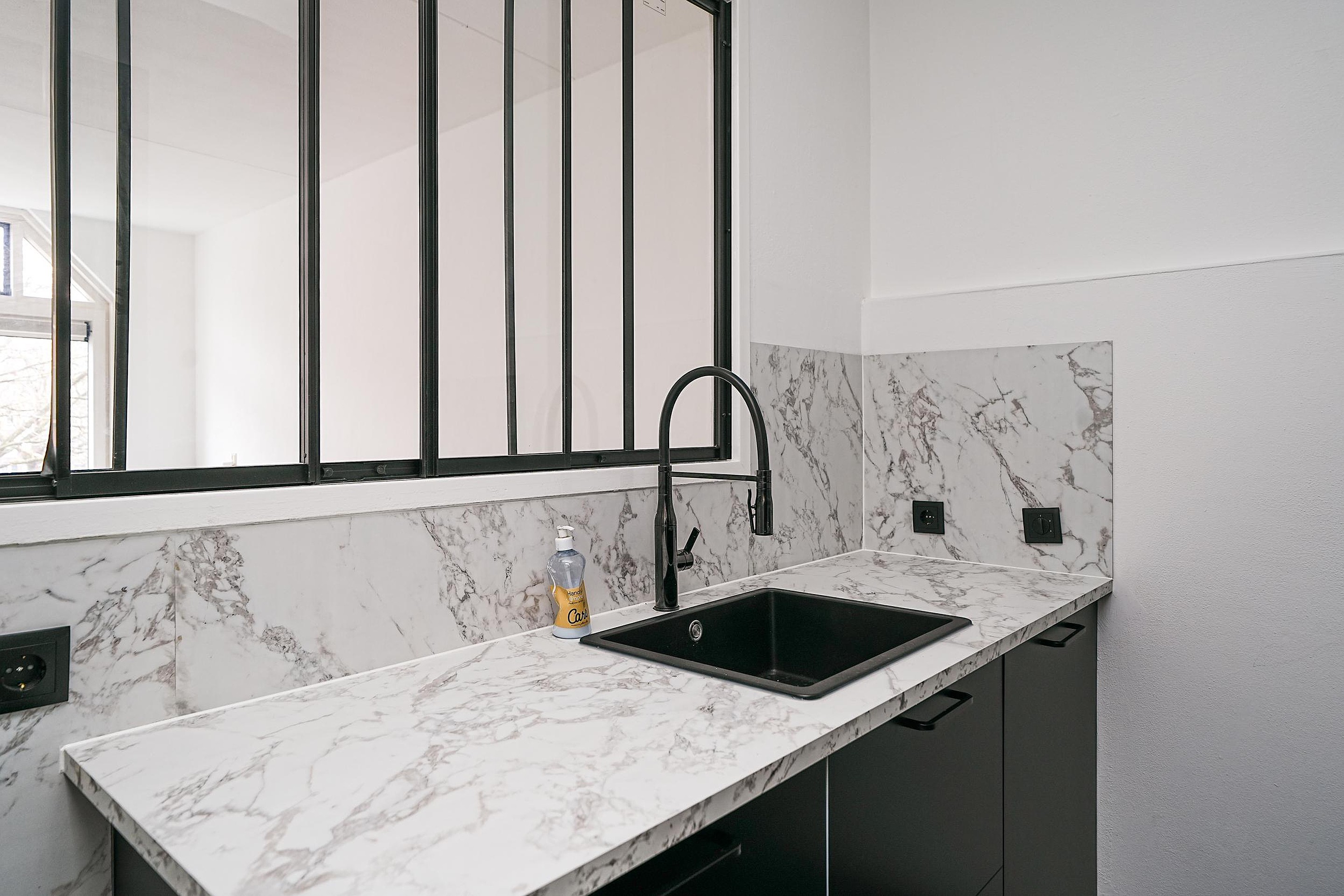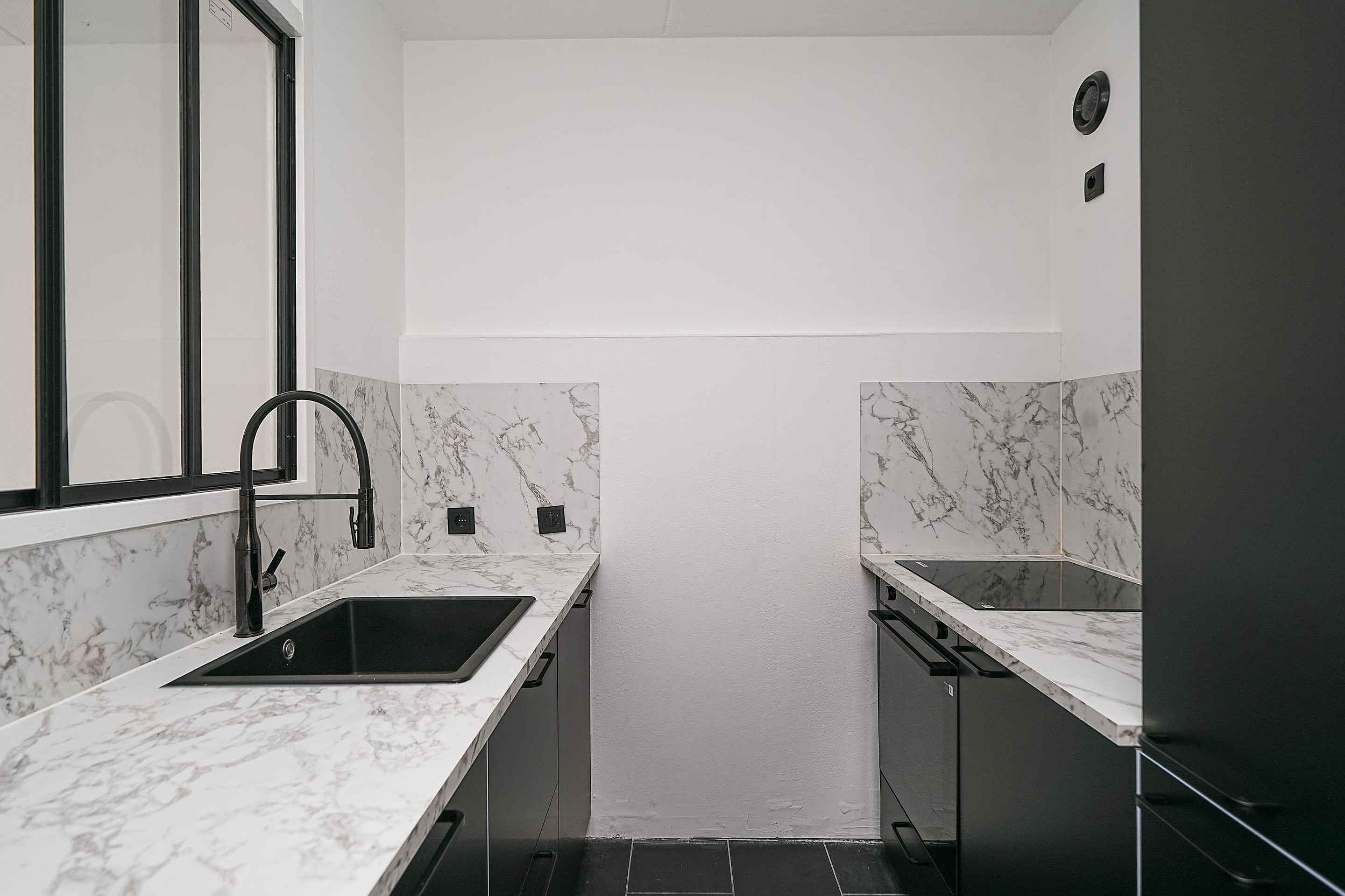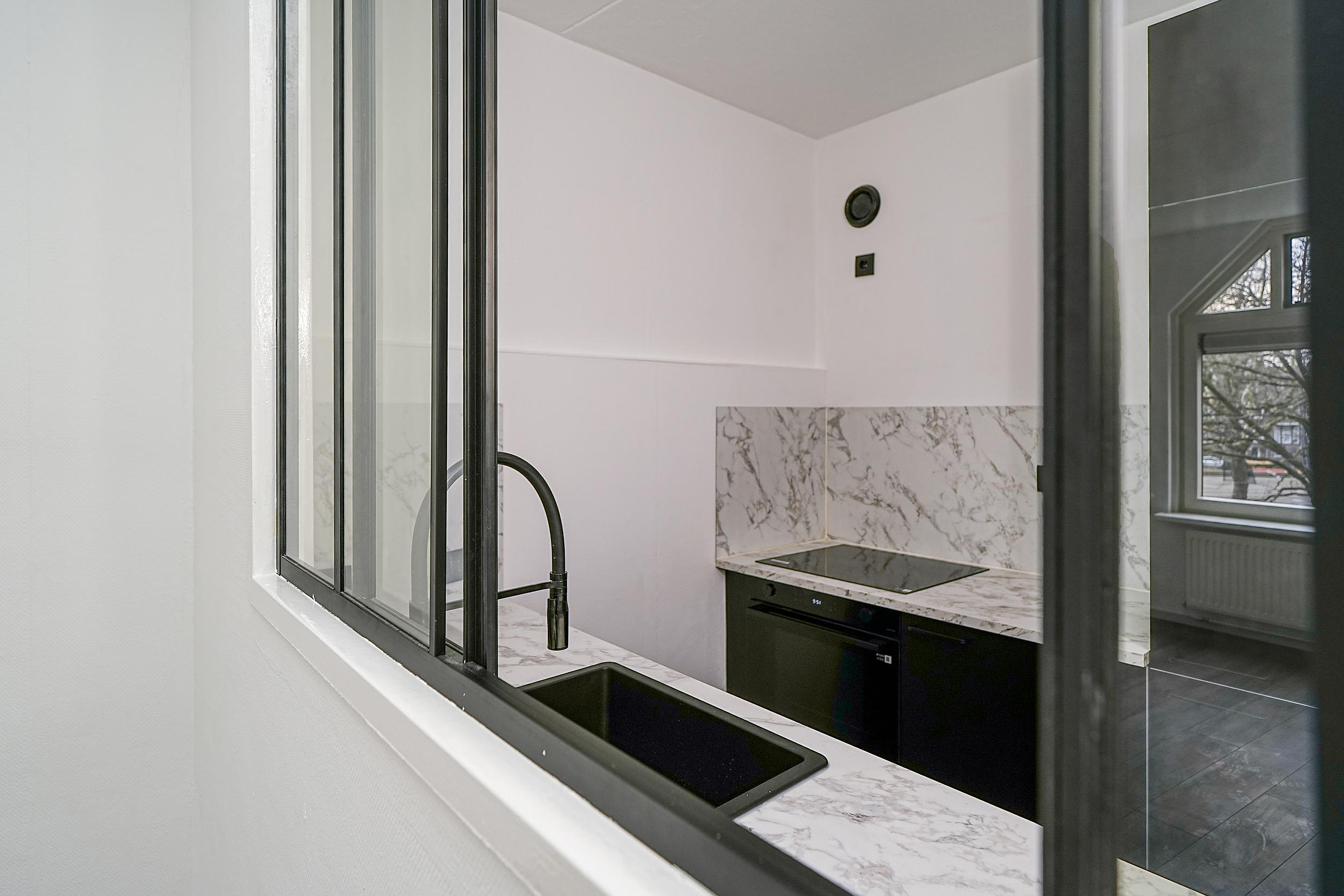 De luxe keuken is een echte blikvanger en van alle gemakken voorzien. De opstelling bestaat uit twee rechte delen en beschikt over diverse inbouwapparatuur, waaronder een oven, inductiekookplaat, vaatwasser en koelkast. De spoelbak met mengkraan is stijlvol geïntegreerd in het fraaie marmeren aanrechtblad met bijpassende achterwand. De zwarte keukenkasten, zwarte handgrepen en de zwarte tegelvloer geven het geheel een stoere, eigentijdse uitstraling. Het zwarte kozijnraam met zicht op de woonkamer zorgt voor een open karakter.