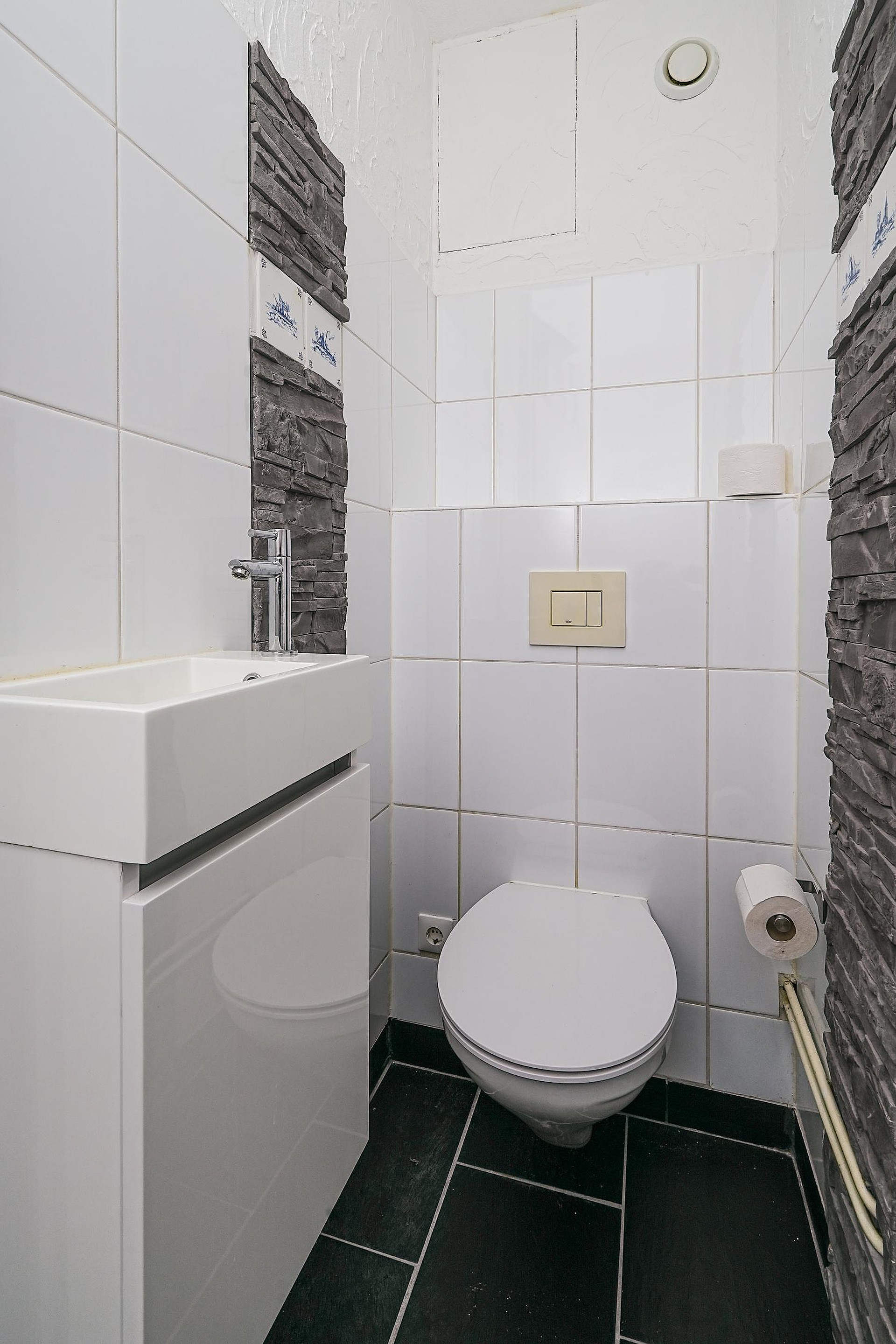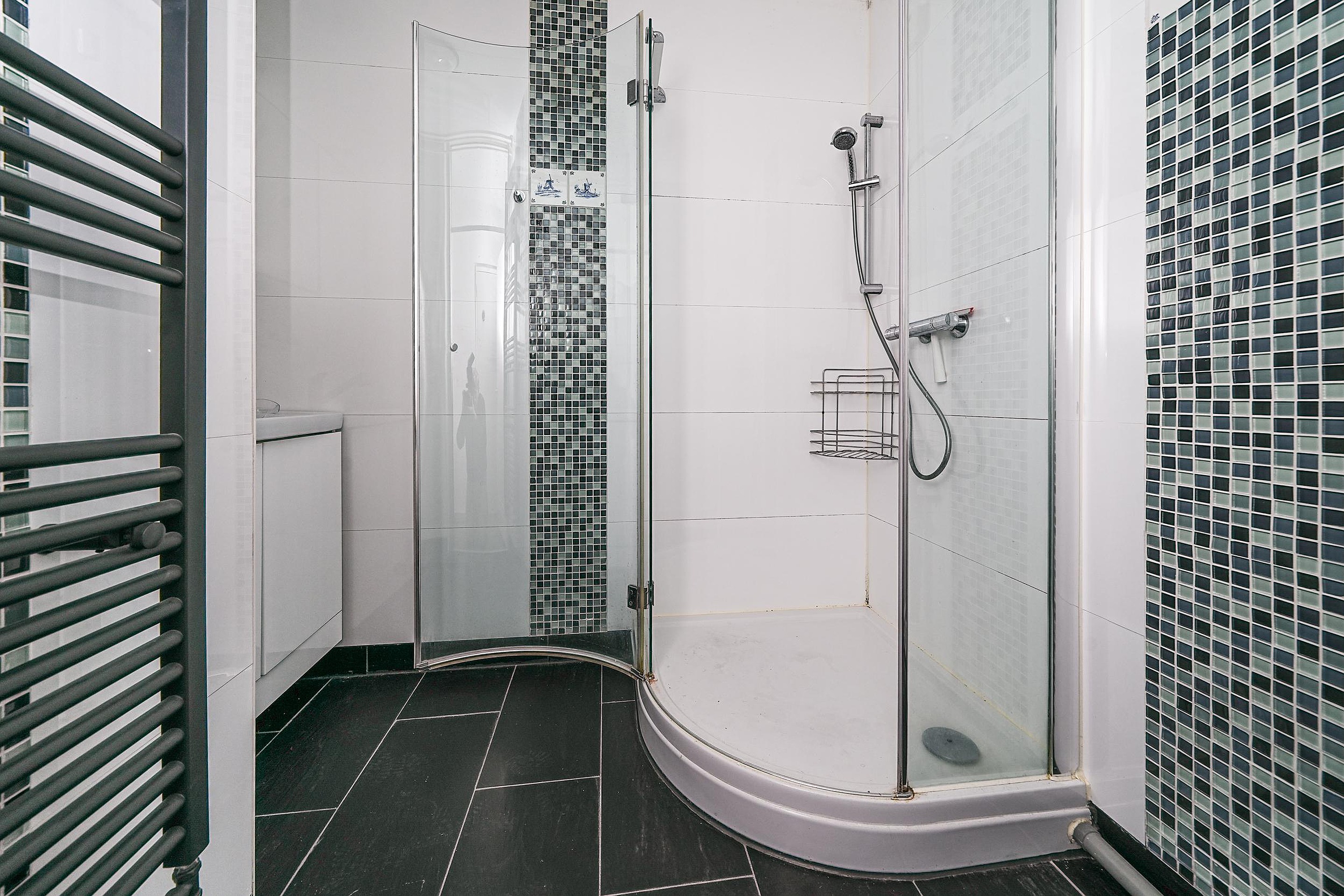 De badkamer ademt luxe en ontspanning. De combinatie van een royale douche, een stijlvol wastafelmeubel, een donkere tegelvloer en grote witte wandtegels zorgt voor een moderne en chique uitstraling. De zwarte handdoekenradiator maakt het geheel helemaal af. Ook de toiletruimte is in dezelfde stijlvolle lijn afgewerkt, wat zorgt voor een mooi en consistent geheel.