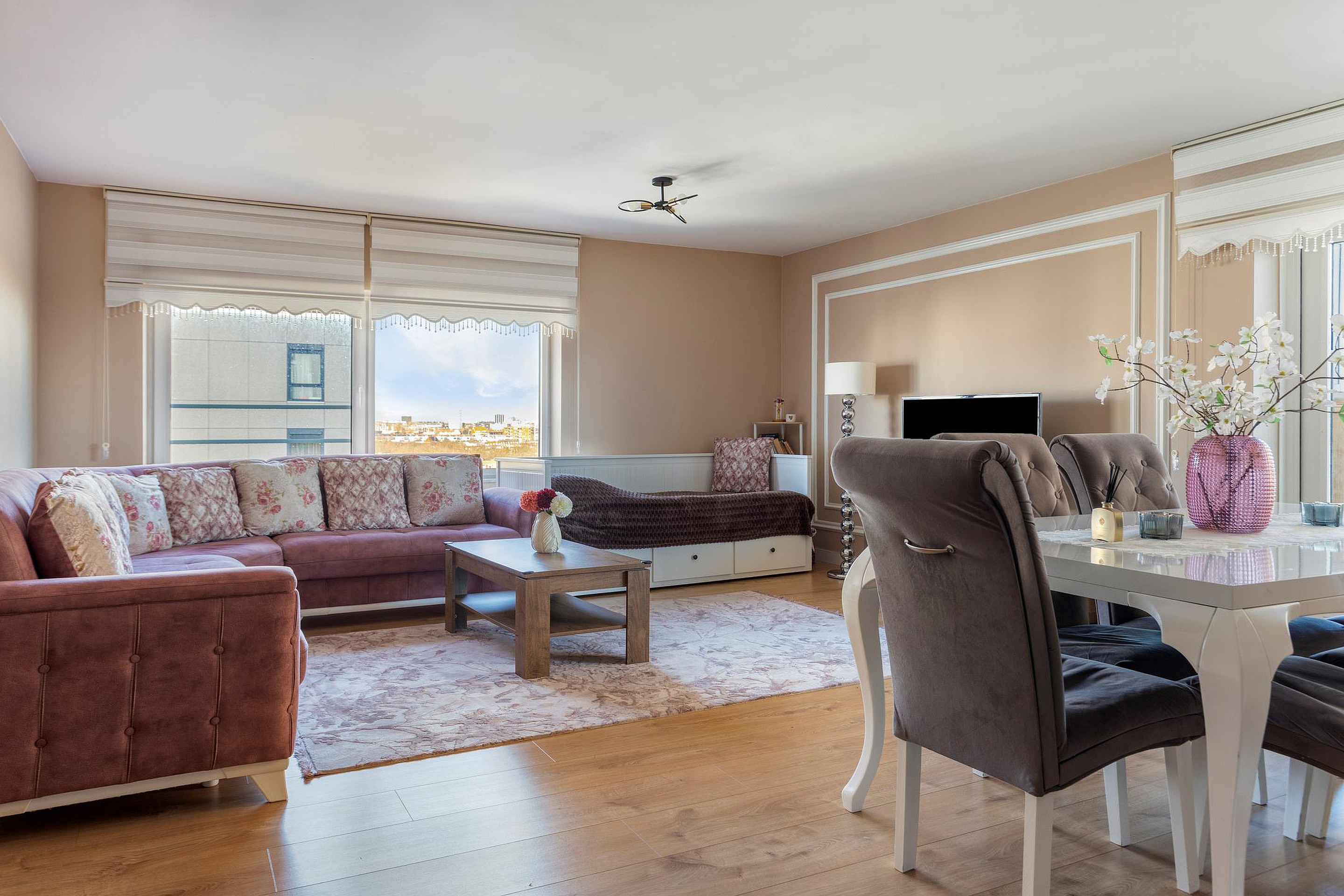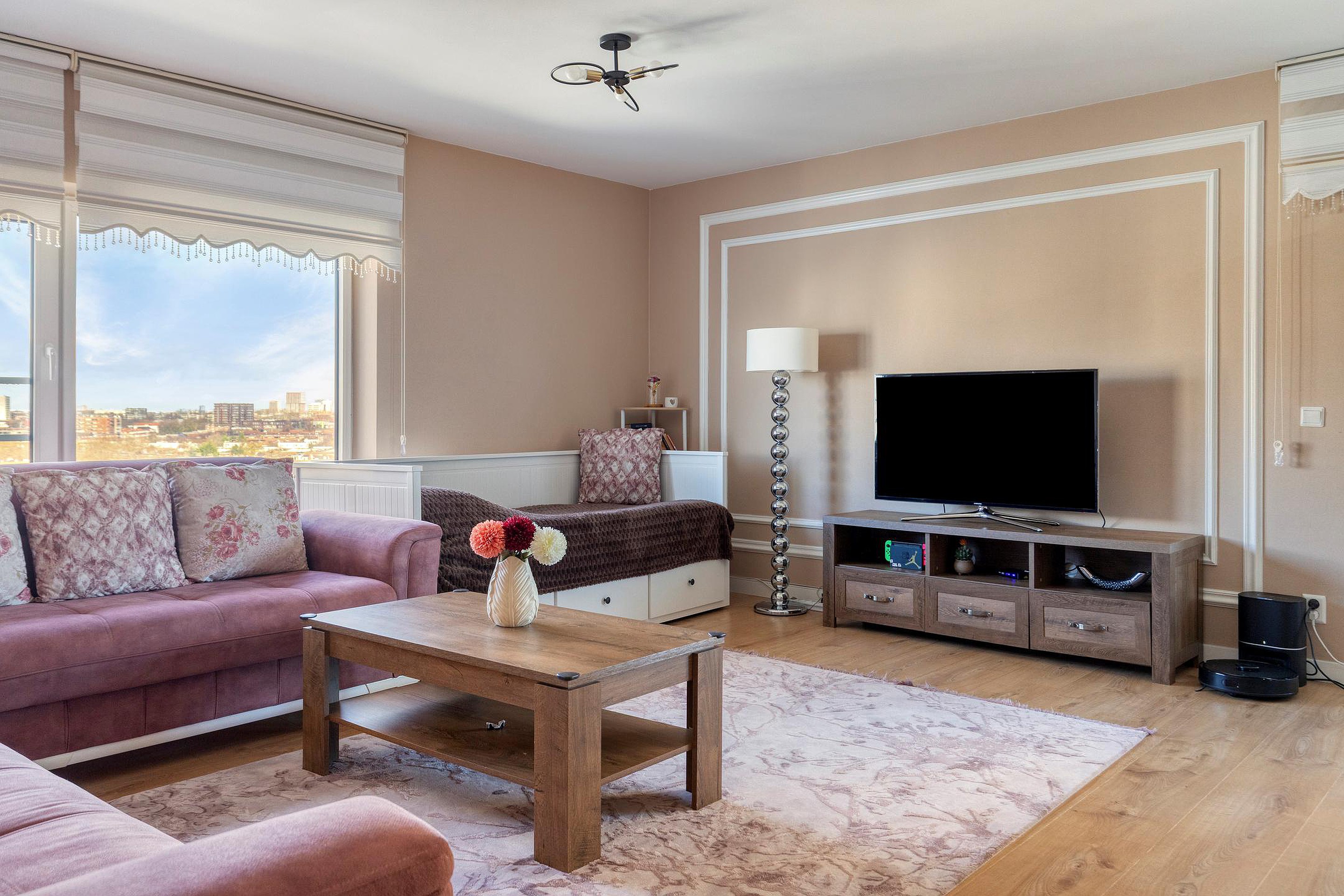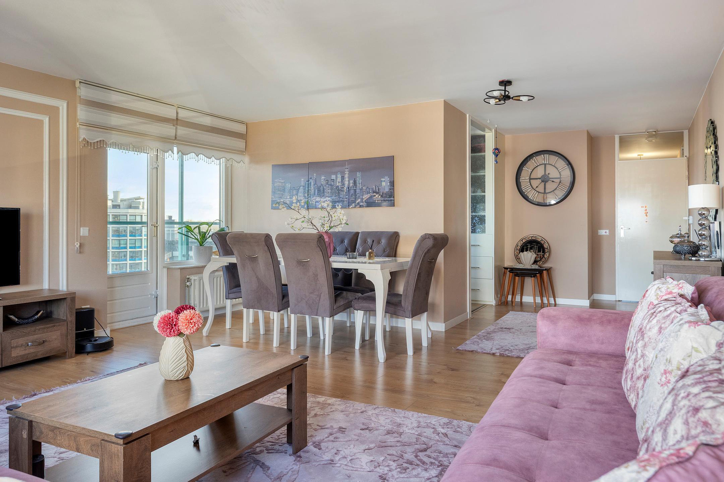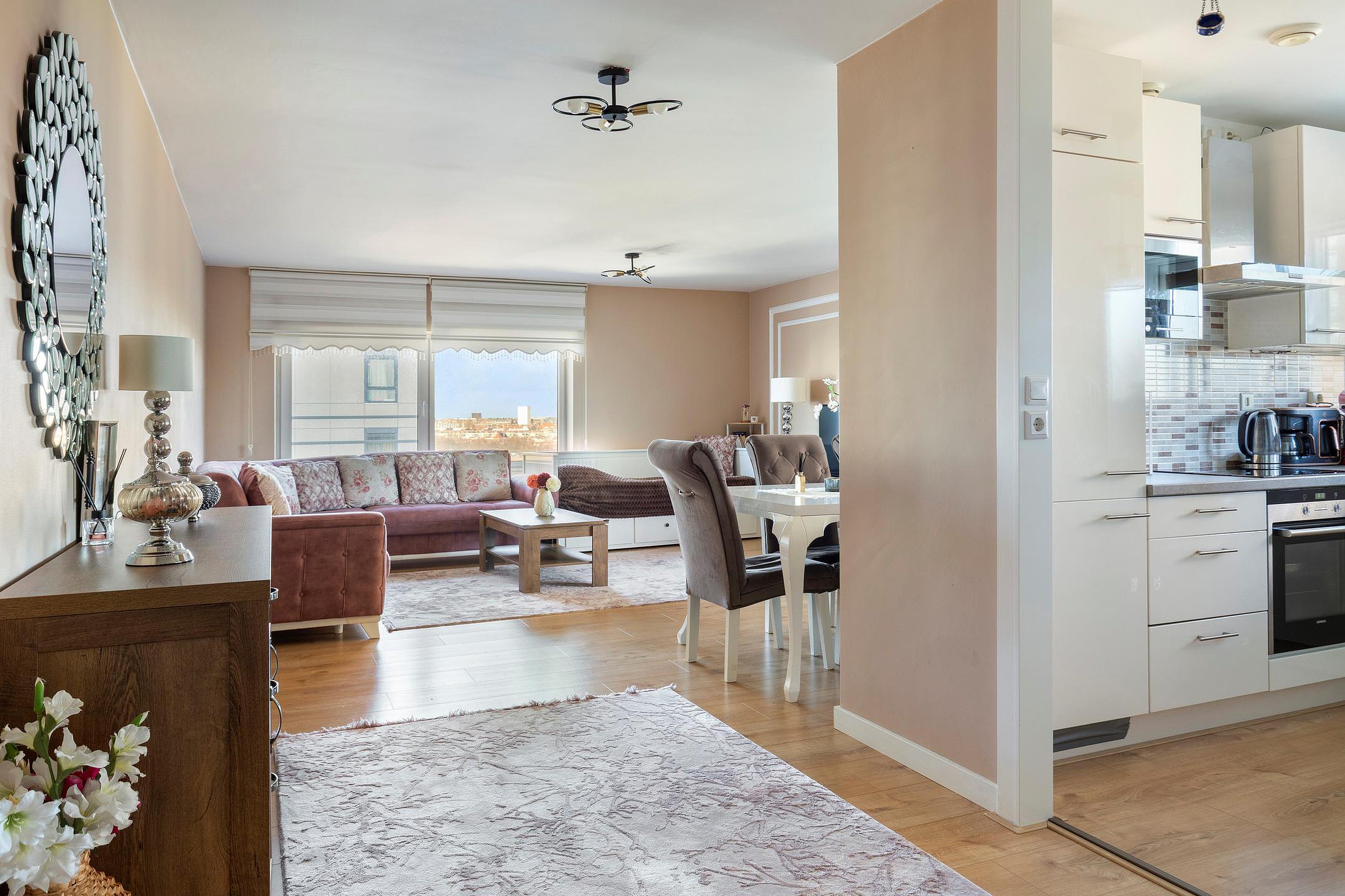 De woonkamer is royaal opgezet en staat in directe verbinding met het balkon van circa 9 m2, dat dankzij de hoogte een indrukwekkend panoramisch uitzicht biedt over de omgeving. De grote ramen zorgen voor veel lichtinval en geven het appartement een ontspannen en open sfeer.
