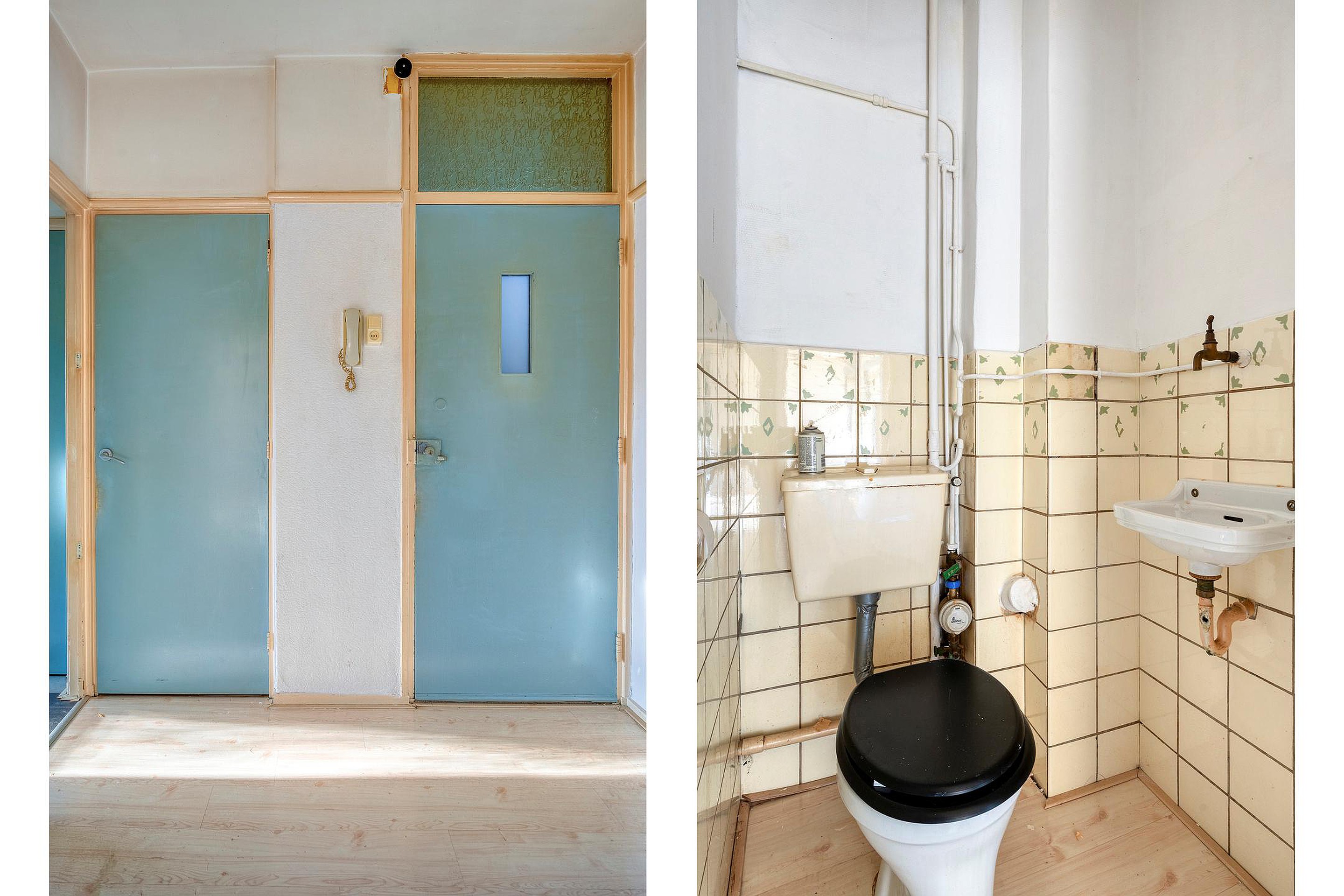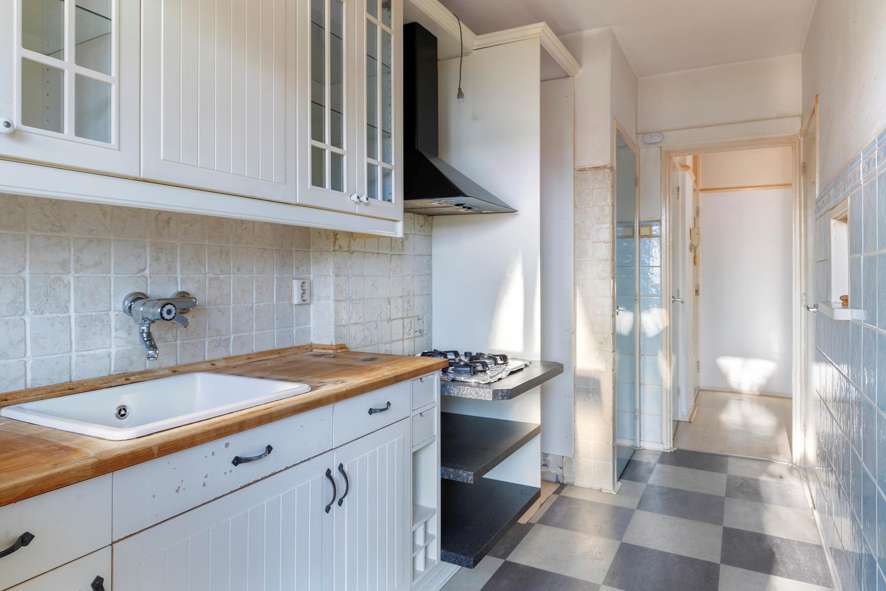 Begane grond Entree, hal met toilet, inpandige kast, slaapkamer, keuken, badkamer, woonkamer met mooie lichtinval (vh 2 kamers), balkon.
