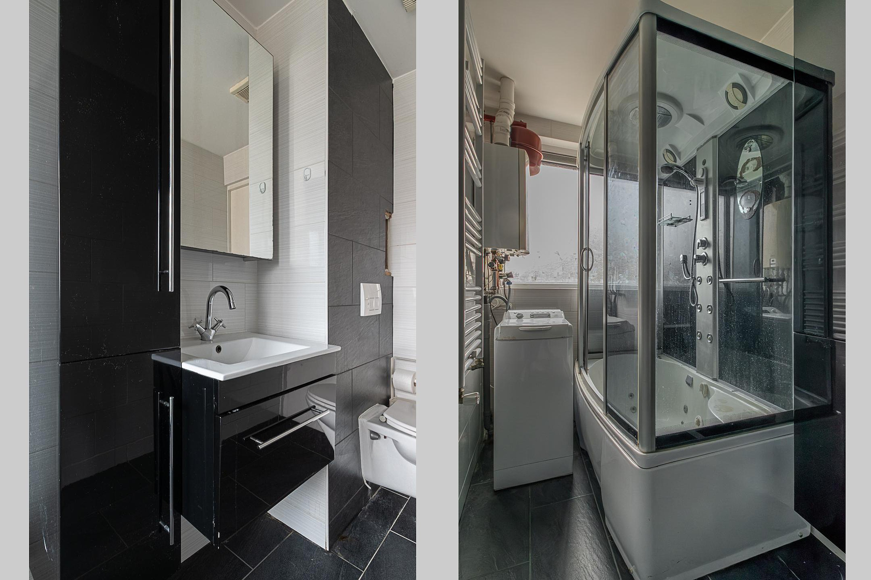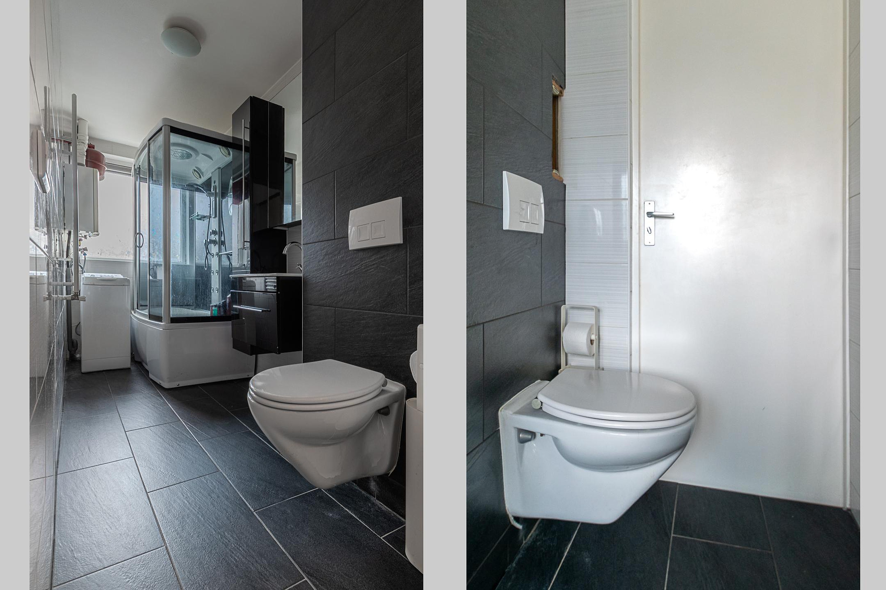 Badkamer/toilet, een betegelde ruimte, beschikt over een zitbad met handdouche en rainshower, wastafel met kolomkast en onderladen, toilet (hangend closet), badkamerradiator, wasmachineaansluiting, elektrische afzuiging en de cv-ketel opstelling.